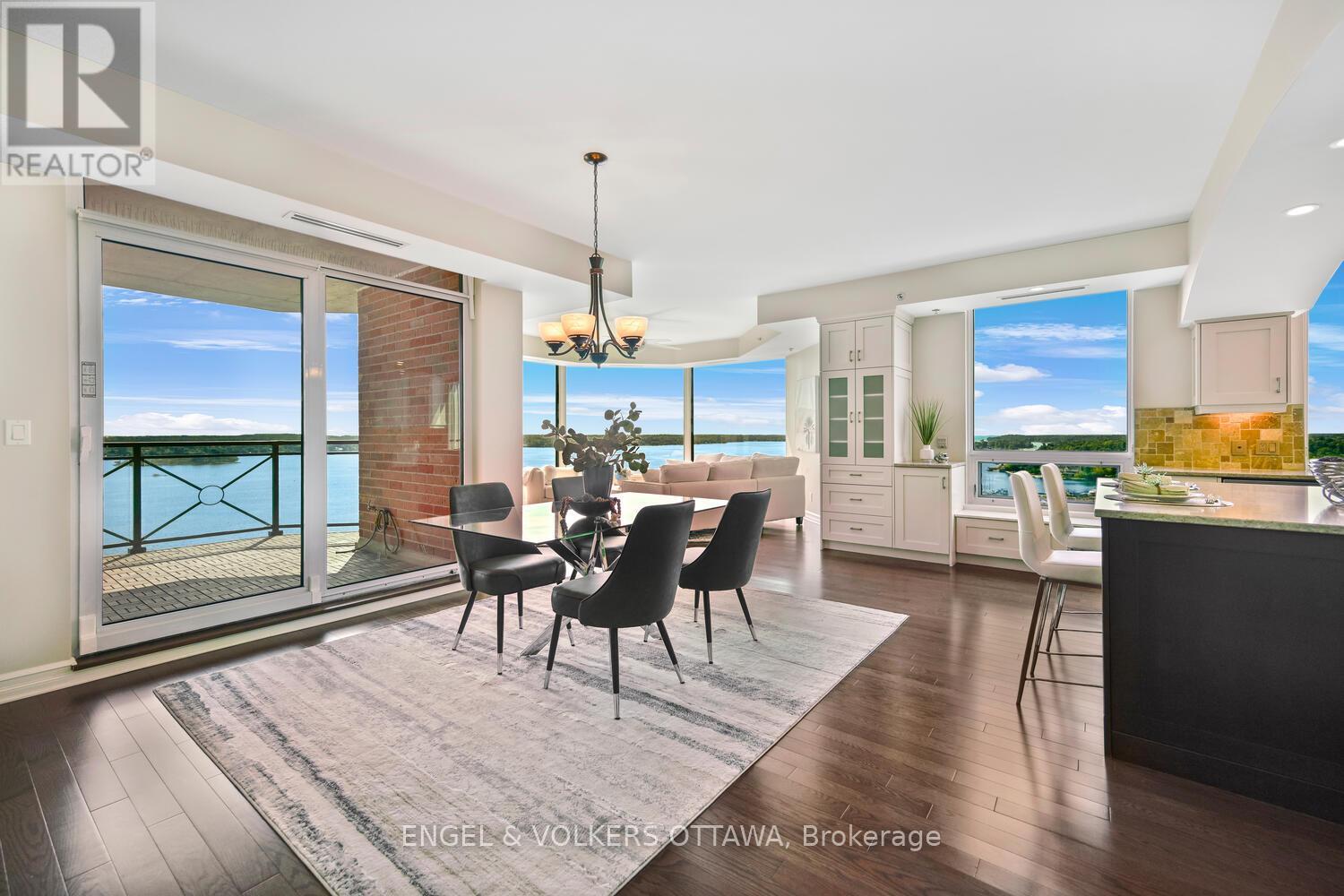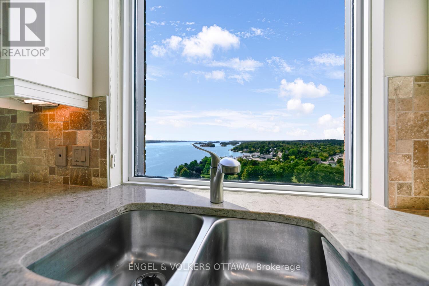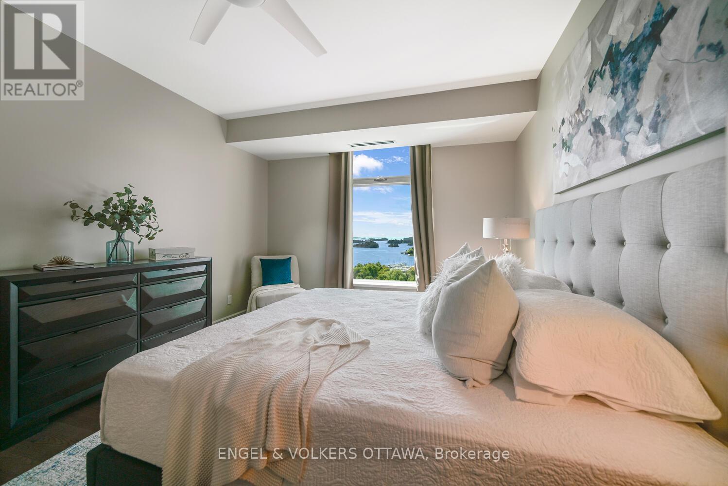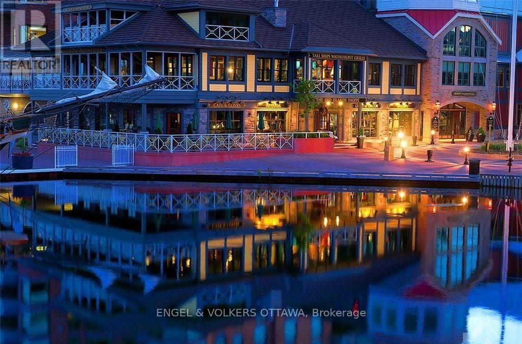 Upon entering you are immediately drawn to the most remarkable view and the magic of the Thousand Islands! Enjoy the endless wonder of ships from faraway places, majestic cruise ships and private yachts plying the waters of the St. Lawrence River! This west facing T'Gallant suite boasts approximately 1622 sq. ft. of superbly designed luxury living plus 110 sq. ft. balcony. Open concept great room style combines a high quality custom kitchen with huge centre island, high end appliances, quartz countertops and great task lighting. This flows seamlessly to a spacious dining area and to an octagonal living room. The subtle stone work surrounding the gas fireplace adds a classic touch to an already extraordinary living space. And all this as well as both bedrooms and hallways are anchored by rich hardwood flooring. The primary bedroom easily accommodates a king size bed plus tonnes of space for bedside tables, armoires, etc. The ensuite bath separate shower, bath, double sinks, lots of storage and ceramic flooring. The second bedroom is easily used as a den, office and for occasional overnight stays. A second full bath completes the suite. Impeccably maintained throughout. Tall Ships offers amazing amenities indoor pool, sauna, indoor and outdoor hot tubs, meeting rooms, catering kitchen. Indoor parking for one car is included. (id:64974)