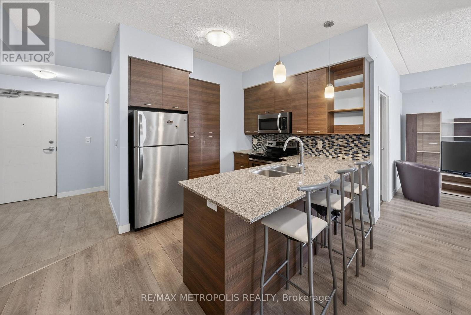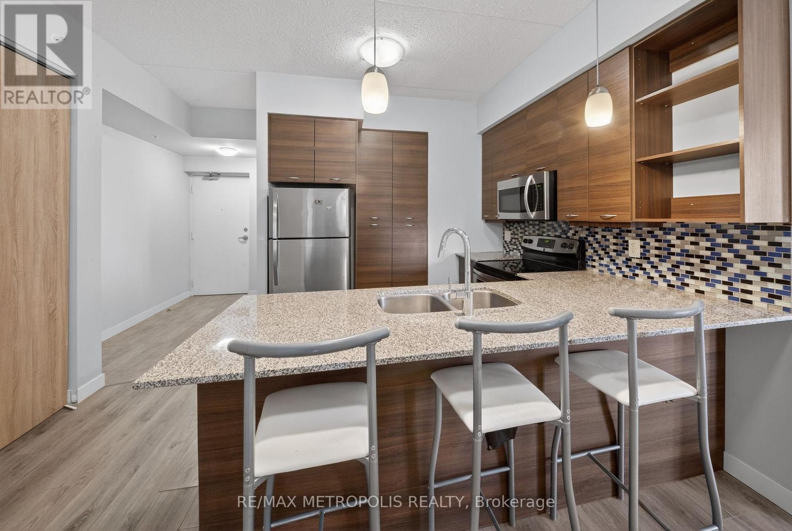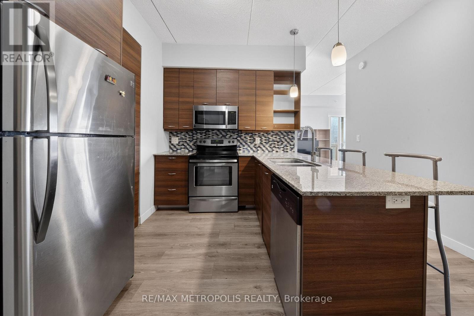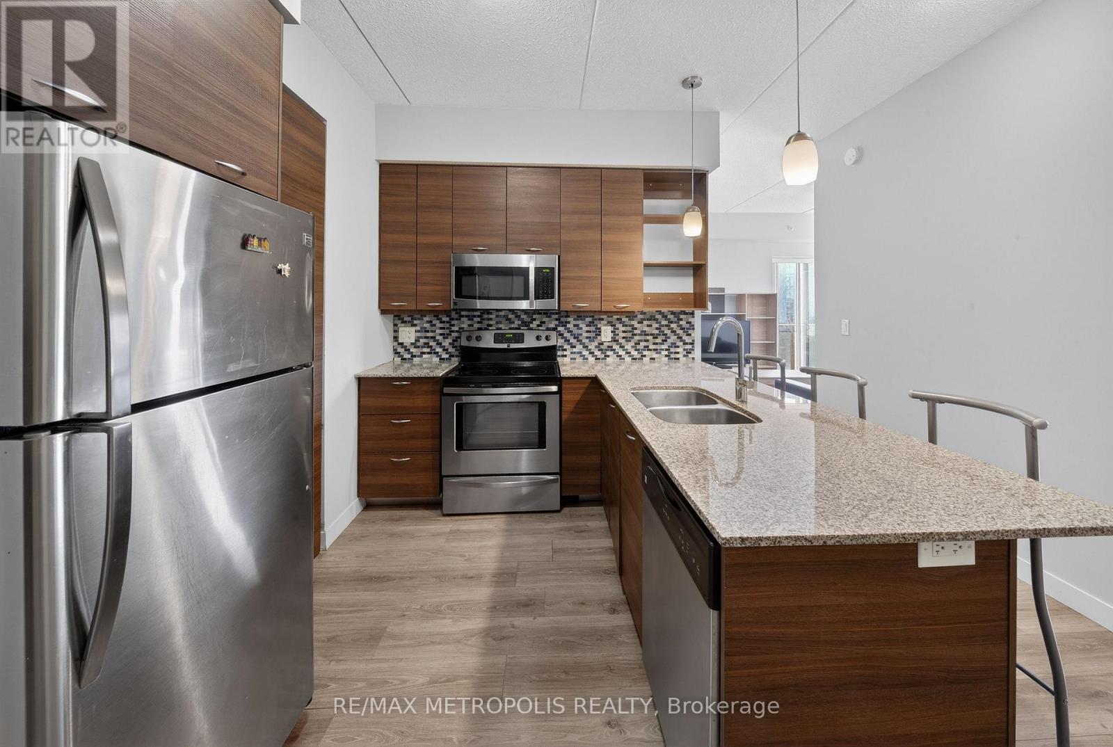 Modern condo living in a well-maintained building just minutes from the University of Waterloo and Wilfrid Laurier University. This bright west-facing suite offers approximately 953 sq. ft. of thoughtfully designed space with 2 bedrooms and 2 bathrooms, ideal for comfortable everyday living or investment potential. The open-concept layout seamlessly connects the kitchen, dining, and living areas, creating a functional and inviting space. The contemporary kitchen features sleek cabinetry, granite countertops, stainless steel appliances, and a breakfast bar with seating-perfect for casual meals or entertaining. A stylish mosaic backsplash adds a modern touch while generous counter space provides practicality for daily use. The living and dining area is filled with natural light from large windows and sliding doors leading to a private open balcony with west-facing exposure-an ideal spot to relax and enjoy sunset views. Durable flooring and neutral finishes throughout make the space easy to personalize. Both bedrooms offer comfortable proportions, while the primary bedroom benefits from its own private ensuite bathroom. Ensuite laundry adds everyday convenience. Residents enjoy access to building amenities while maintenance fees include common elements, heat, water, and central air conditioning, helping simplify monthly expenses. Situated in a vibrant and highly accessible neighbourhood close to universities, shopping, restaurants, transit, and parks, this condo offers an excellent opportunity to experience convenient urban living in Waterloo. (id:64974)