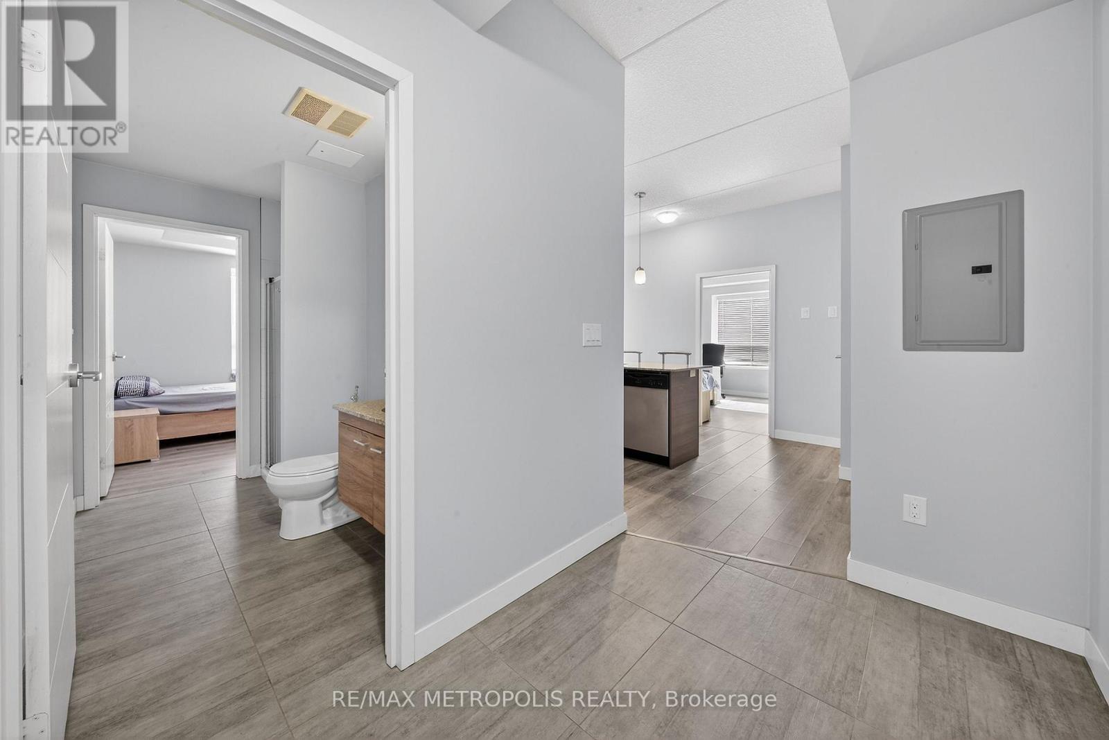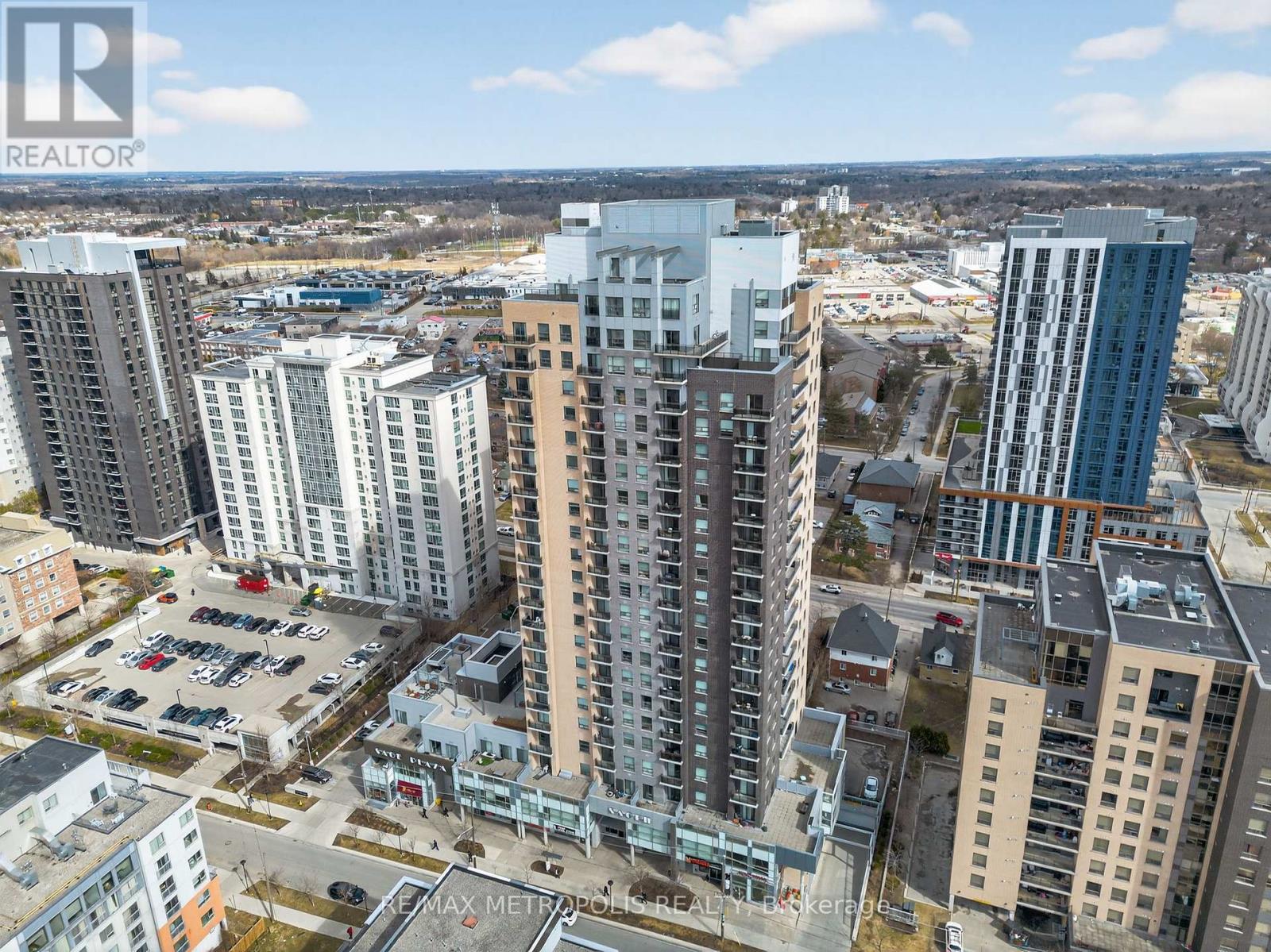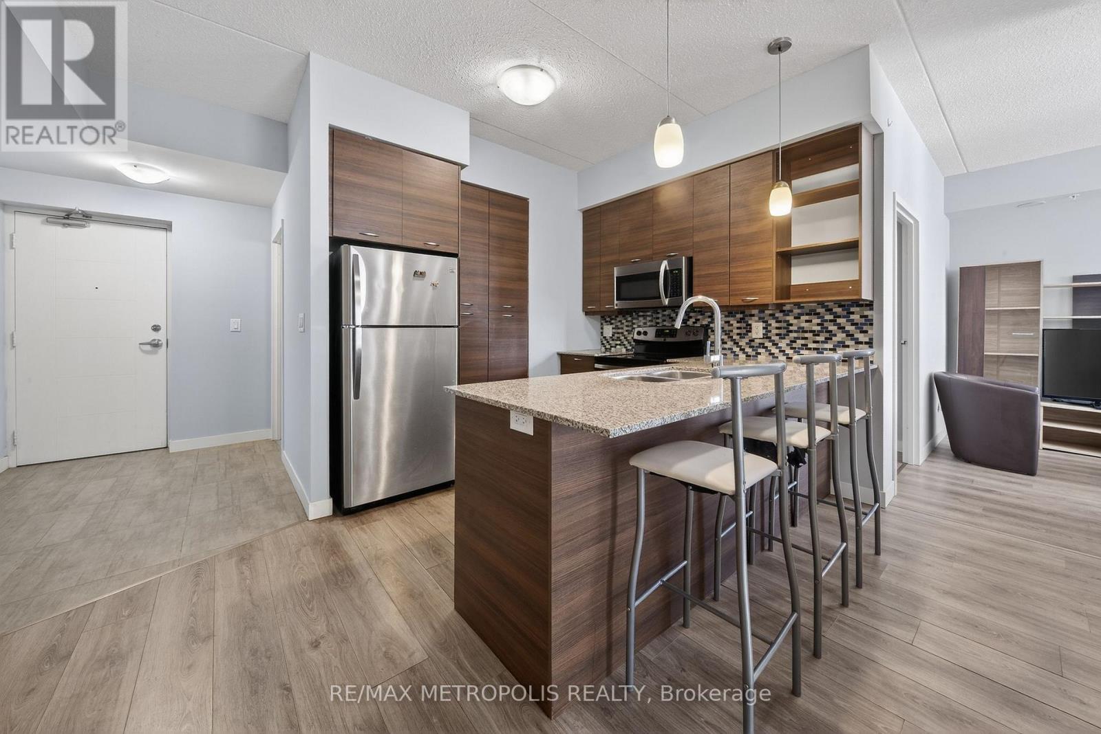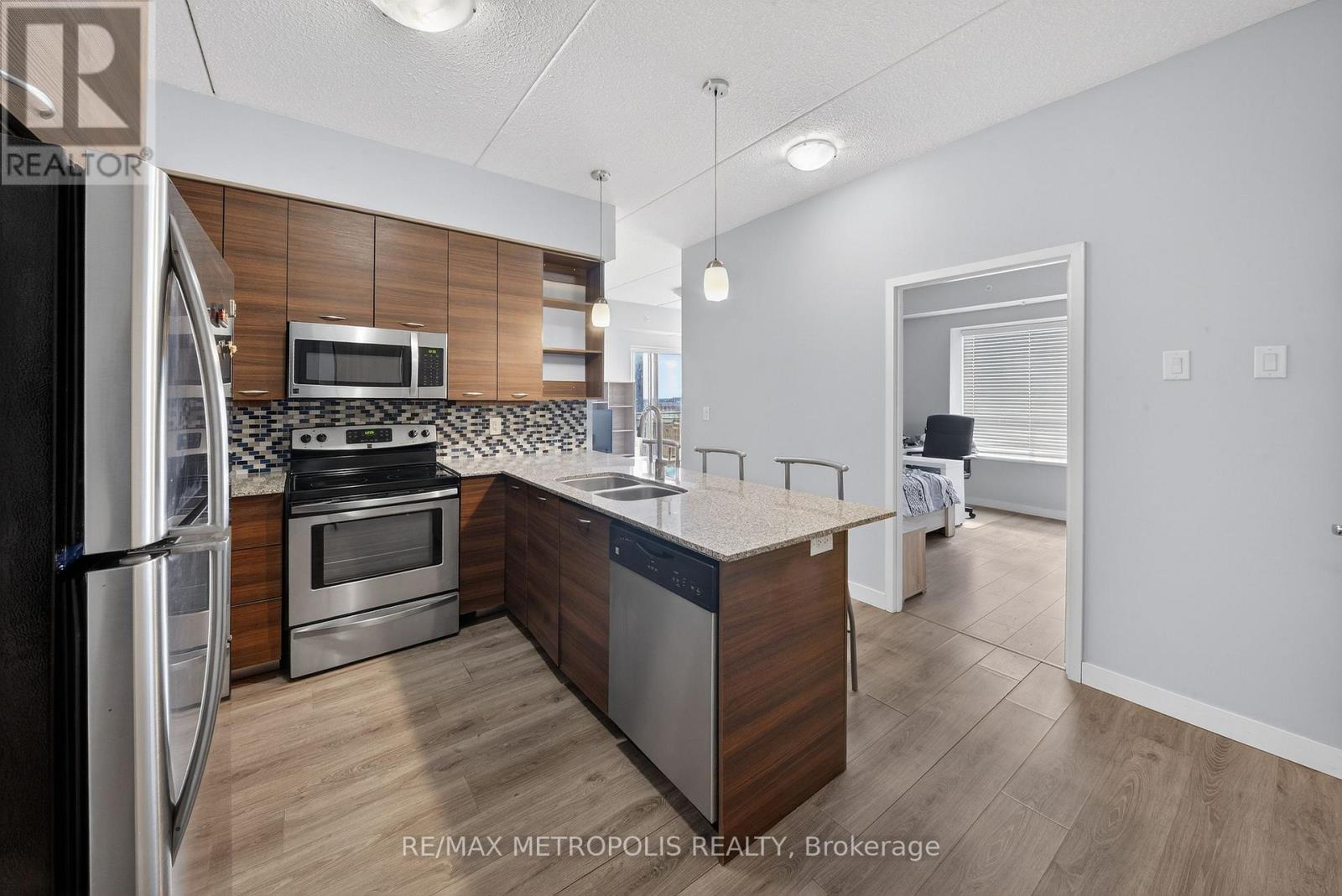 Modern condo living in a well-maintained building just minutes from the University of Waterloo and Wilfrid Laurier University. This bright west-facing suite offers approximately 953 sq. ft. of thoughtfully designed space with 2 bedrooms and 2 bathrooms, ideal for comfortable everyday living or investment potential. The open-concept layout seamlessly connects the kitchen, dining, and living areas, creating a functional and inviting space. The contemporary kitchen features sleek cabinetry, granite countertops, stainless steel appliances, and a breakfast bar with seating-perfect for casual meals or entertaining. A stylish mosaic backsplash adds a modern touch while generous counter space provides practicality for daily use. The living and dining area is filled with natural light from large windows and sliding doors leading to a private open balcony with west-facing exposure-an ideal spot to relax and enjoy sunset views. Durable flooring and neutral finishes throughout make the space easy to personalize. Both bedrooms offer comfortable proportions, while the primary bedroom benefits from its own private ensuite bathroom. Ensuite laundry adds everyday convenience. Residents enjoy access to building amenities while maintenance fees include common elements, heat, water, and central air conditioning, helping simplify monthly expenses. Situated in a vibrant and highly accessible neighbourhood close to universities, shopping, restaurants, transit, and parks, this condo offers an excellent opportunity to experience convenient urban living in Waterloo. (id:64974)
