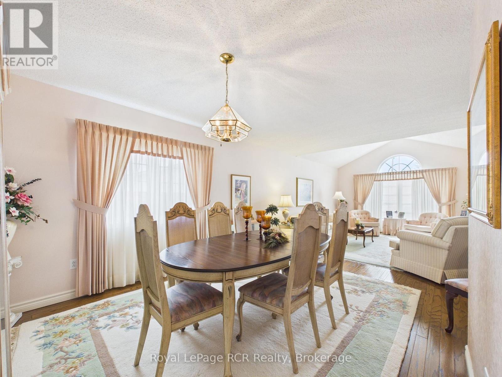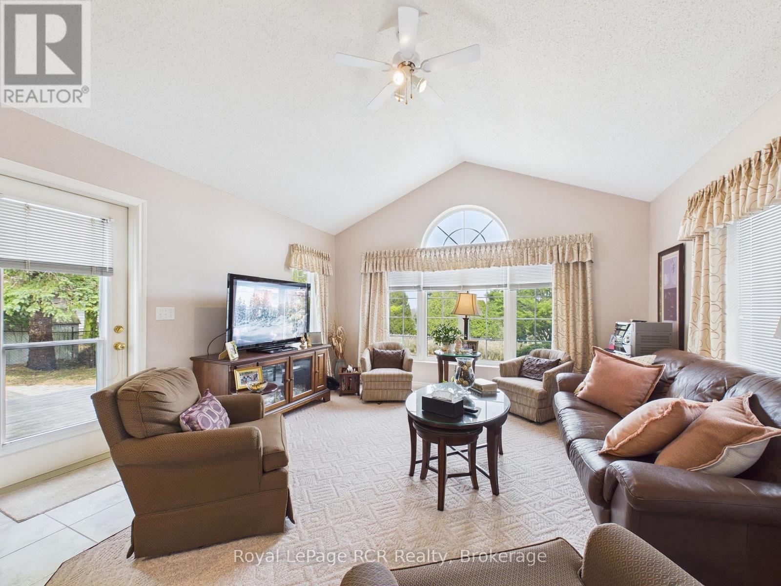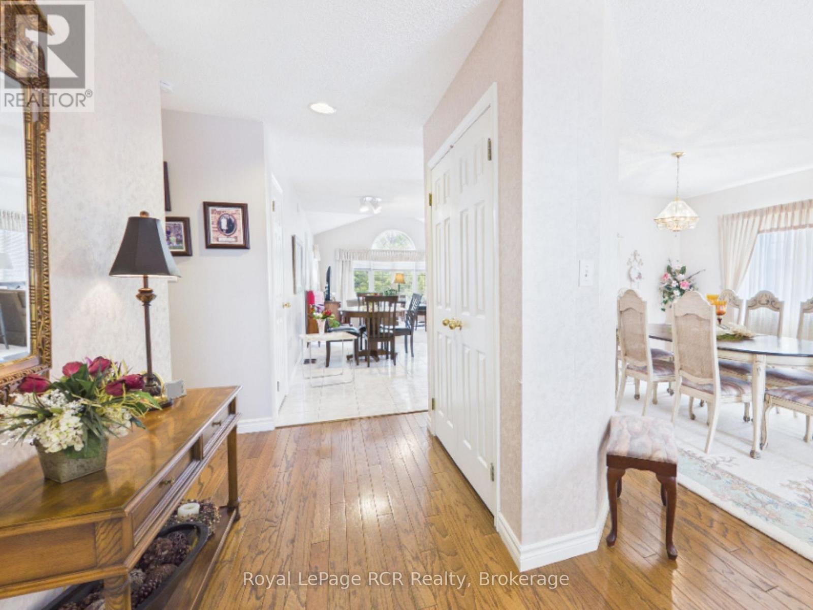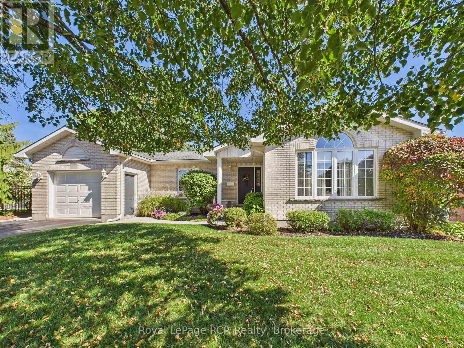 Welcome to this beautifully maintained brick bungalow, proudly built by Royal Home in 1994 and nestled on a mature, landscaped lot with outstanding curb appeal. The double-wide asphalt driveway and classic brick façade make a lasting first impression, complemented by lush greenery and manicured gardens. Inside, the open-concept kitchen and living room create a bright, functional heart for the home. The kitchen features ample cabinetry and generous counter space, while the adjacent living area flows seamlessly toward the rear of the home. A separate formal dining room connects to a stunning sitting room adorned with soaring vaulted ceilings, an elegant arched window, and an abundance of natural light - a truly special space for entertaining. The main level offers three well-sized bedrooms, including a private primary suite with an ensuite, plus an additional primary bathroom. Step outside from the main living area onto the updated rear deck, finished with sleek glass panel railings, and descend to the beautiful interlocking brick patio below, surrounded by a lush, private backyard - perfect for summer evenings. The fully developed lower level impresses with a massive rec room ideal for entertaining or family fun, a generous office/den, a full 3-piece bathroom, and a cold storage room. Comfort is ensured year-round with natural gas forced air heating, central air conditioning, and a single-car attached garage. Located within walking distance of schools, parks, the baseball diamond, and the hospital. (id:64974)