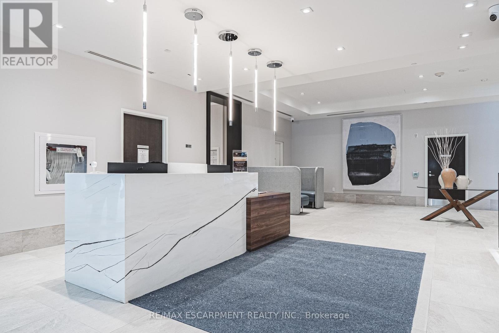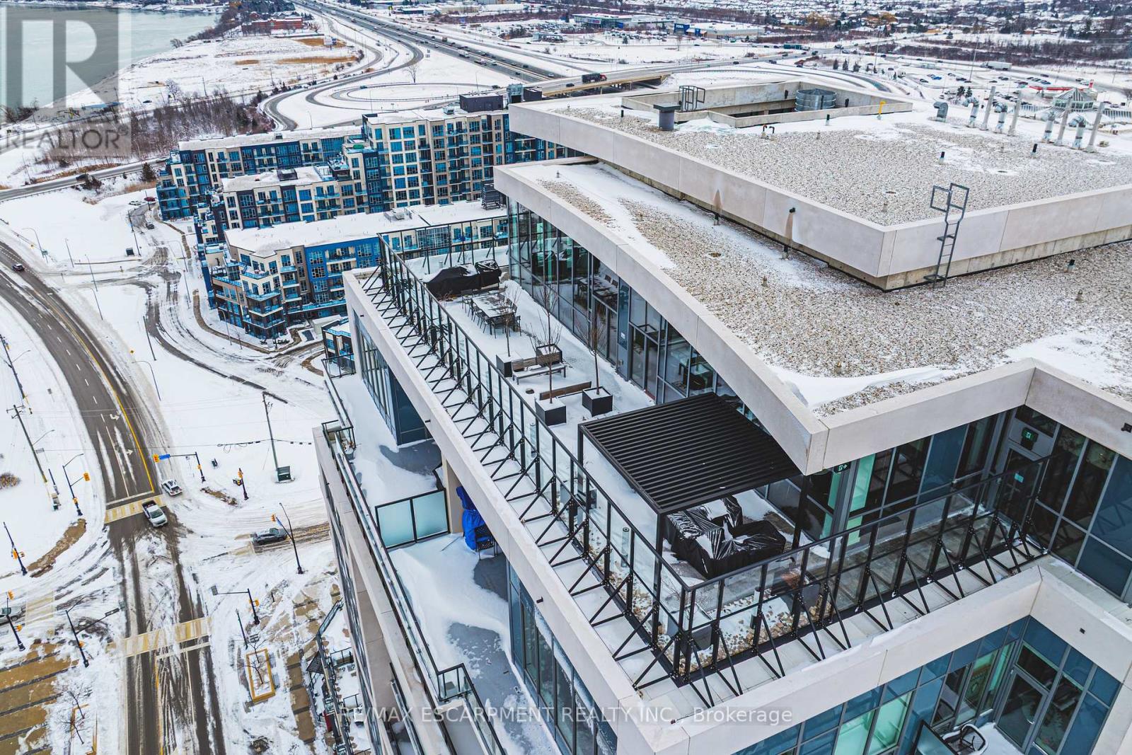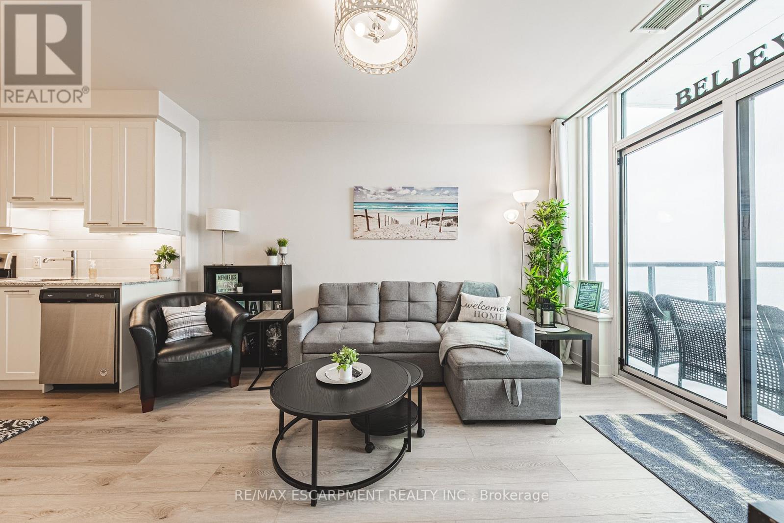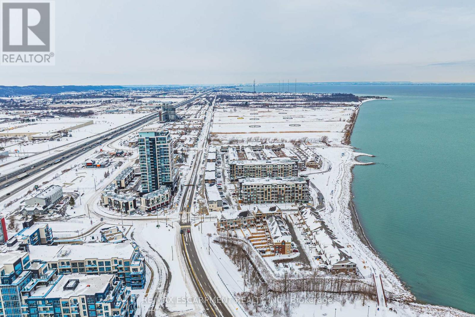 Enjoy breathtaking views of Lake Ontario and the Niagara Escarpment from this bright, modern condo in a highly desirable waterfront community. Just steps from the beach, local shops, cafes, dining, and scenic lakefront trails. Huge upgrade with two parking spots logistically positioned side by side and steps from the elevator. Approximately 12 k in upgrades. This thoughtfully designed unit features sleek laminate flooring throughout with massive island, stainless steel appliances, and an open-concept layout. The spacious den offers versatility-ideal for dinette and entertaining, guest room, office or nursery. Floor-to-ceiling windows flood the space with natural light, creating a warm and inviting atmosphere. Resort-style building amenities include a fully equipped gym, yoga/spin studio, self-serve pet spa, rooftop terrace with BBQs and indoor/outdoor dining, a sky lounge with fireplace, stylish party room, indoor bicycle storage, 24-hour concierge, and security cameras for peace of mind. Located just 30 seconds from the QEW for easy commuting. Includes one parking spot and one locker. Costco, Metro, LCBO, coffee shops, and restaurants are just across the street. Ideal for first-time buyers, professionals, or investors looking for lifestyle and location in one unbeatable package. (id:64974)