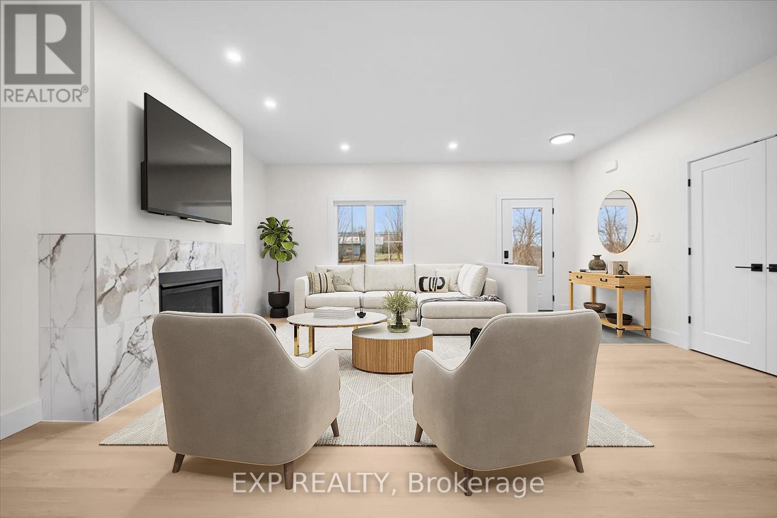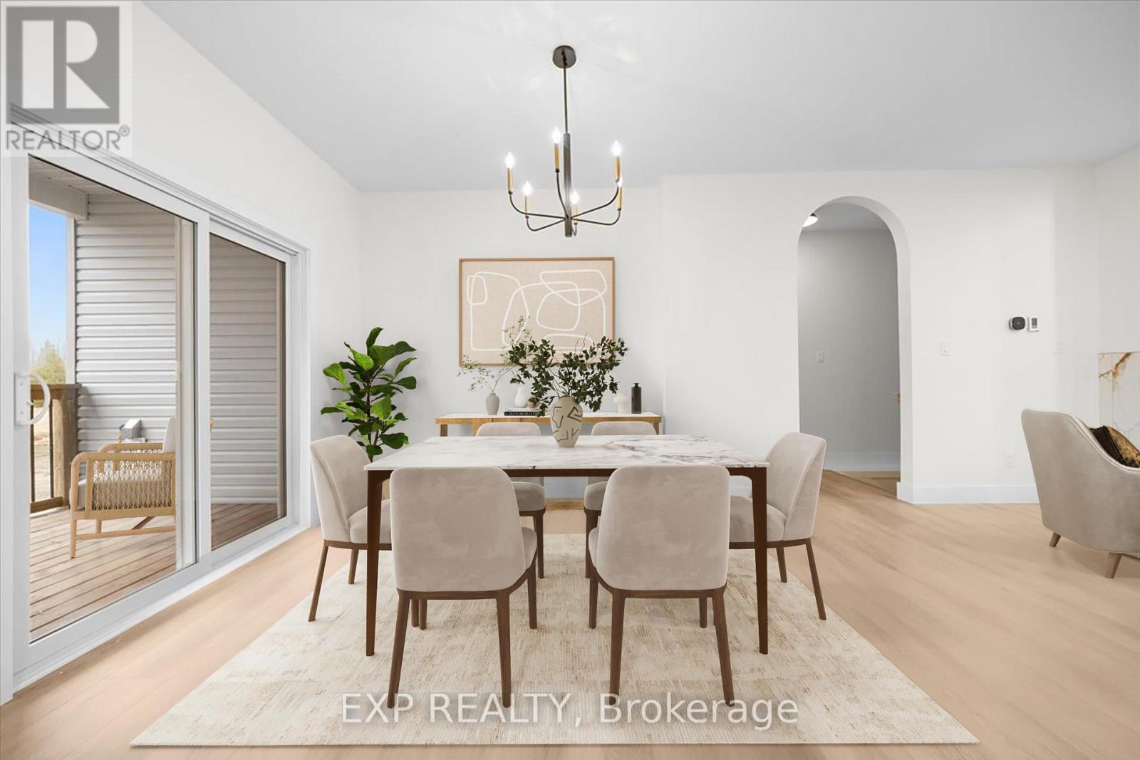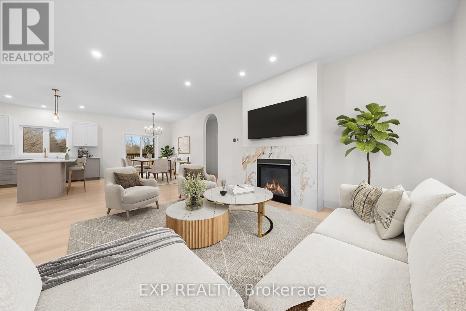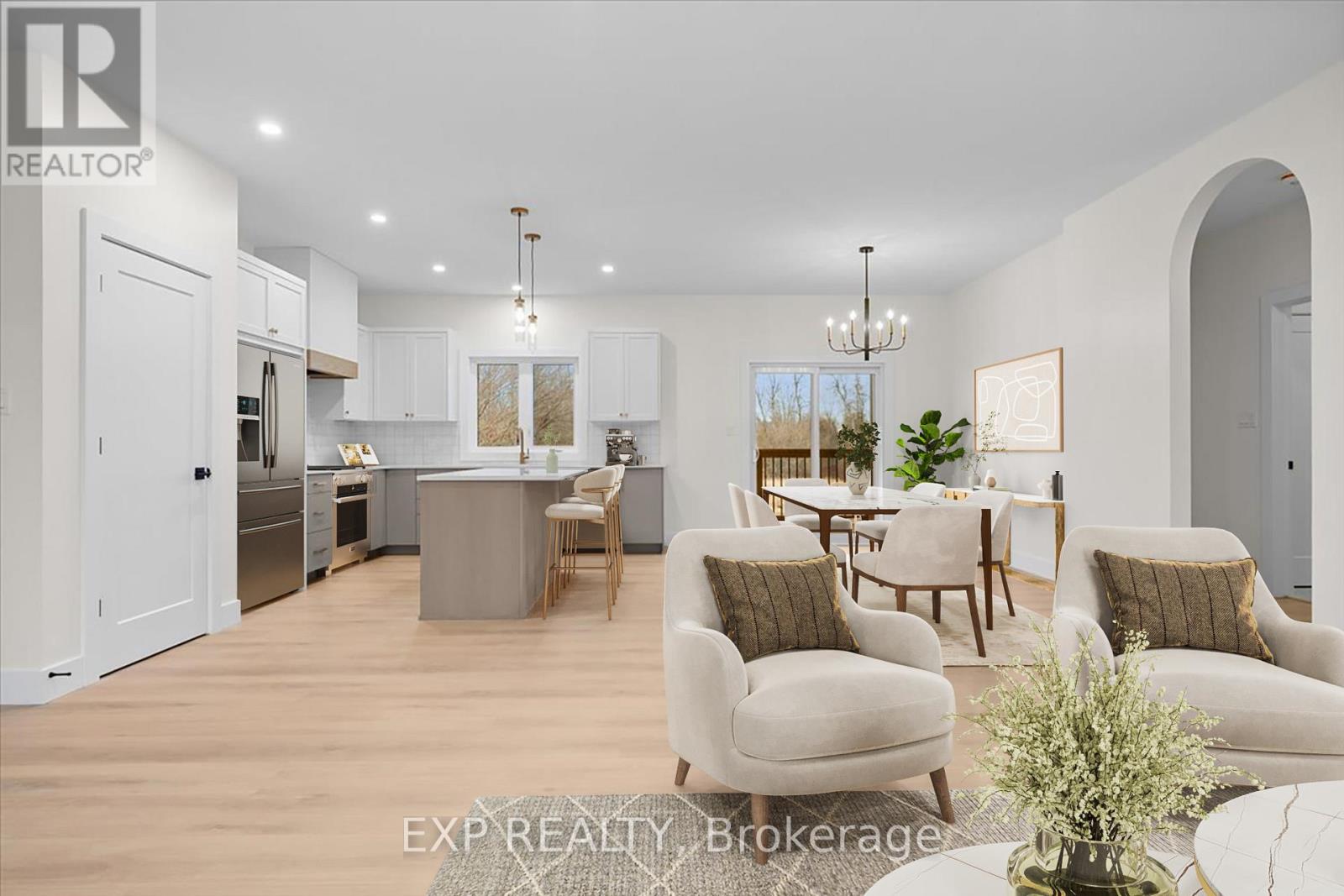 This brand-new Archstone Homes masterpiece offers approximately 2,745 sq. ft. of total finished living space, with 5 bedrooms and 3 bathrooms, including a fully finished walkout lower level. Located just 5 minutes from Kemptville, this home offers close proximity to Kemptville District Hospital, Old Town Kemptville, groceries, restaurants, dentists, schools, and everyday amenities, while still enjoying the quiet charm of a creek setting in the peaceful community of Oxford Mills. The interior is thoughtfully designed, featuring an open-concept kitchen with a large island, quartz countertops, range hood cover, and spacious pantry, flowing into an inviting living room with a cozy propane fireplace. A 3-piece bathroom is also conveniently located on the main level. The finished lower level walkout adds approximately 1,080 sq. ft. of living space, featuring two additional bedrooms, a 3-piece bathroom, a large recreation/entertainment area, and generous storage. It boasts 8 ft ceilings and direct outdoor access to the backyard and creek. Part of the exclusive 18 & Water Estates community, the interior design is in collaboration with Brown & Co. The exterior offers a welcoming front porch and a spacious back deck overlooking the private creek, ideal for enjoying the tranquil surroundings. The home backs onto the serene Kemptville Creek and is fully covered by a Tarion Warranty. Ideally located within walking distance to Oxford on Rideau Public School, Brigadoon Restaurant, and the picturesque Oxford Mills Dam, it provides both convenience and charm. (id:64974)