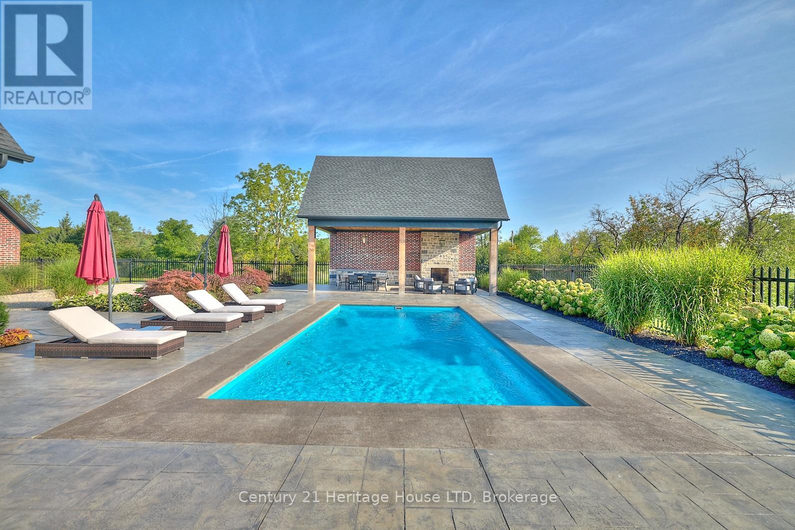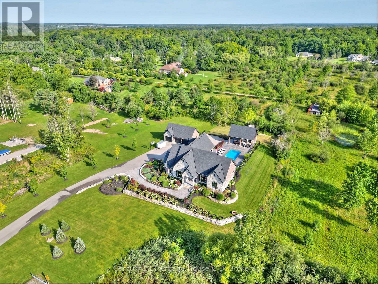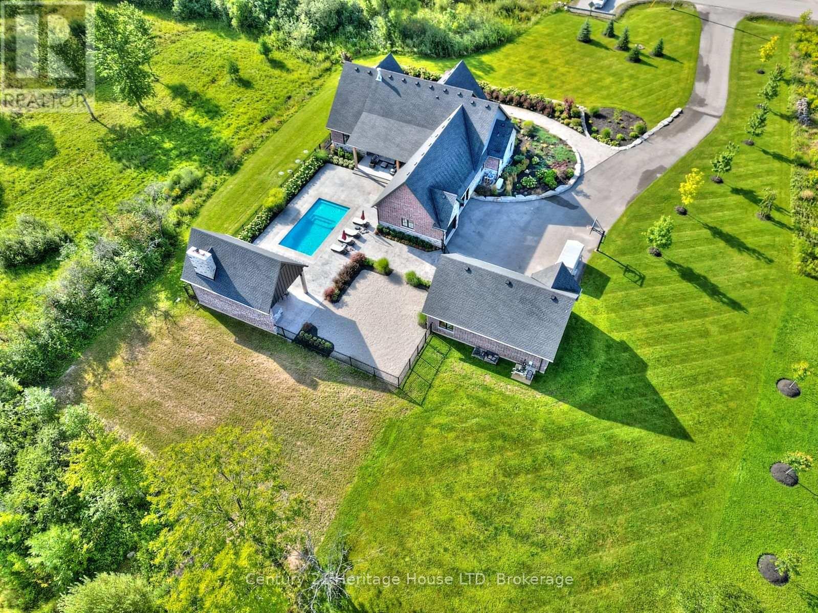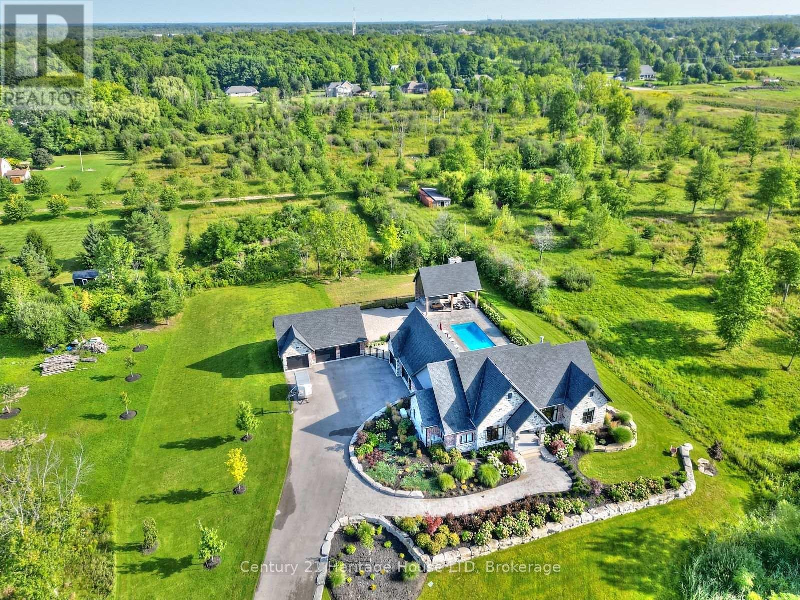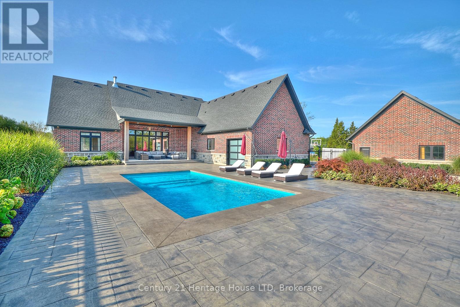 Refined Country Living Meets In-Town Sophistication.Nestled on 1.7 professionally landscaped acres, this exceptional brick bungalow is a masterclass in curb appeal-anchored by lush gardens, a stone walkway, and a stately front porch. The interior reveals a seamless open-concept design where rich hardwood floors lead to a true chef's kitchen, complete with premium quartz countertops, a social seating island, and custom cabinetry. The heart of the home is the expansive Great Room, featuring a bespoke cast-mantle gas fireplace and walk-out access to a covered rear patio.The primary retreat is a sanctuary of its own, boasting a walk-in closet and a 5-piece spa ensuite with radiant in-floor heating and a deep soaker tub. Two additional bedrooms-each with their own walk-in closets-ensure space for everyone. Outside, the property transforms into a private resort: an in-ground pool, an outdoor fireplace, and a dedicated bar area are set against a fenced backdrop. Bonus: A detached 3-car garage with loft space and roughed-in floor heat offers endless possibilities for the hobbyist. Just steps from the Friendship Trail and Lake Erie, this is more than a home; it's a lifestyle. (id:64974)