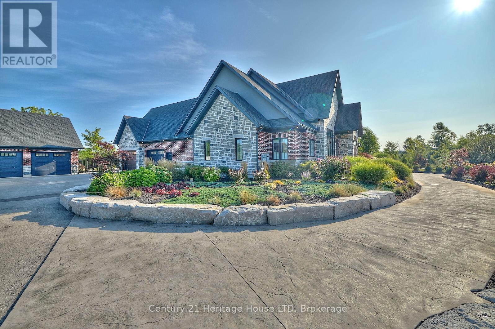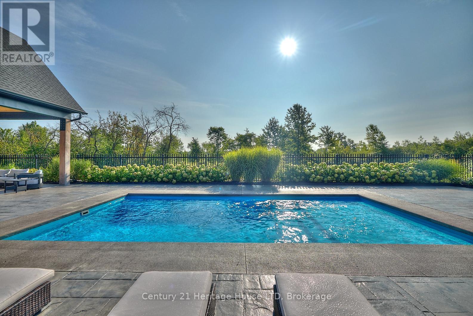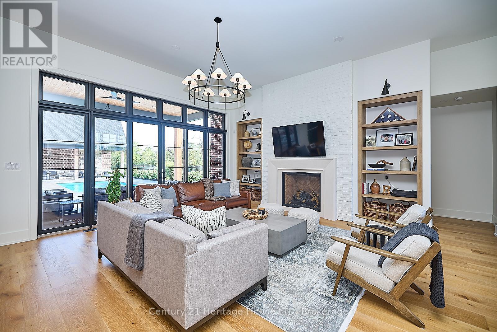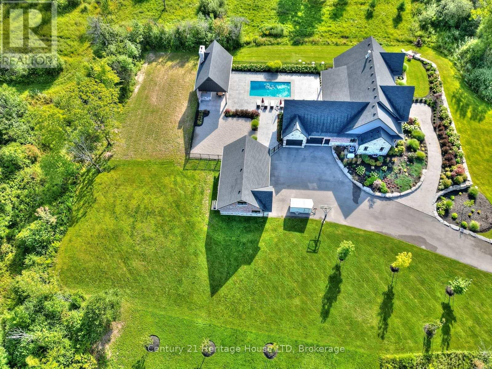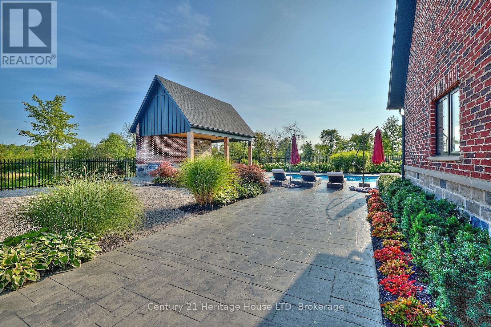 Refined Country Living Meets In-Town Sophistication.Nestled on 1.7 professionally landscaped acres, this exceptional brick bungalow is a masterclass in curb appeal-anchored by lush gardens, a stone walkway, and a stately front porch. The interior reveals a seamless open-concept design where rich hardwood floors lead to a true chef's kitchen, complete with premium quartz countertops, a social seating island, and custom cabinetry. The heart of the home is the expansive Great Room, featuring a bespoke cast-mantle gas fireplace and walk-out access to a covered rear patio.The primary retreat is a sanctuary of its own, boasting a walk-in closet and a 5-piece spa ensuite with radiant in-floor heating and a deep soaker tub. Two additional bedrooms-each with their own walk-in closets-ensure space for everyone. Outside, the property transforms into a private resort: an in-ground pool, an outdoor fireplace, and a dedicated bar area are set against a fenced backdrop. Bonus: A detached 3-car garage with loft space and roughed-in floor heat offers endless possibilities for the hobbyist. Just steps from the Friendship Trail and Lake Erie, this is more than a home; it's a lifestyle. (id:64974)