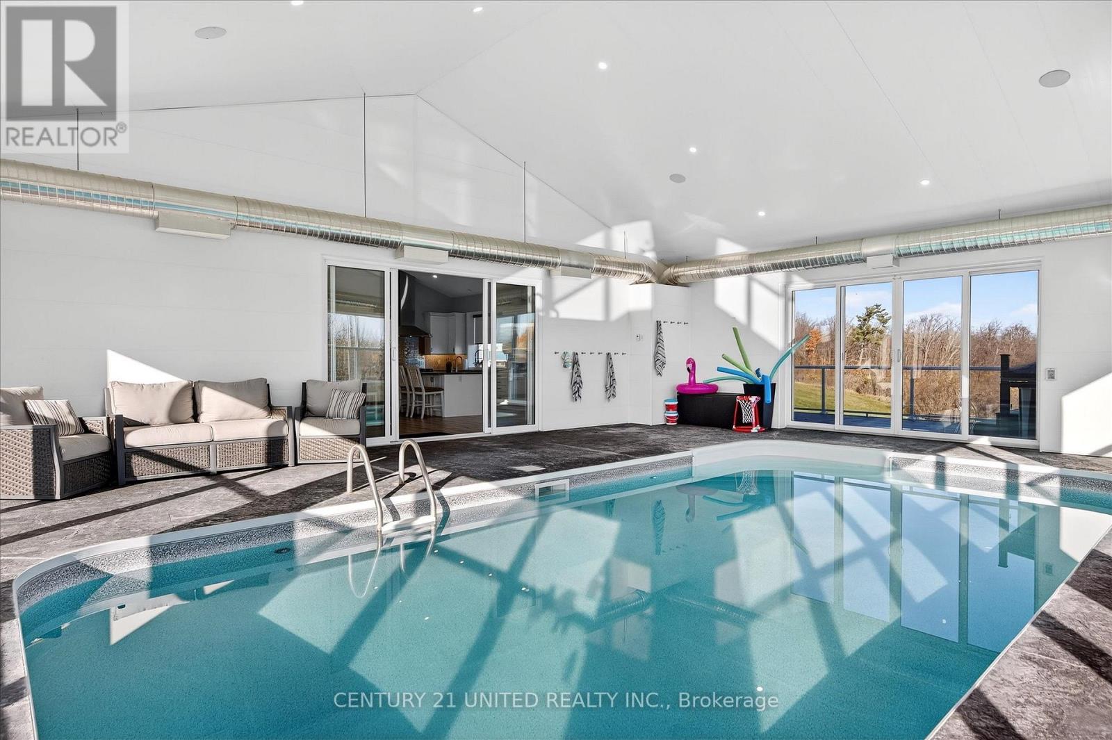 Set on 23 breathtaking acres, this exceptional custom-built bungalow blends luxury, craftsmanship, and lifestyle in one remarkable property. Offering 5 bedrooms and 4 bathrooms, featuring soaring 16-foot vaulted ceilings and a bright, open-concept layout designed for both comfort and entertaining. The chef-inspired kitchen is beautifully appointed with custom cabinetry, a THOR gas stove, and a striking marble backsplash. The main floor primary suite is a private retreat, with custom closets and a spa-like ensuite featuring a steam shower. A standout feature of the home is the incredible indoor saltwater pool, separated by glass sliding doors-creating a resort-style experience you can enjoy year-round. The lower level boasts a concrete insulated floor system, while the ICF foundation and durable steel roof ensure long-term efficiency and peace of mind. A whole-home Generac generator adds another level of reliability. Step outside to the expansive 12' x 40' Trex deck with panoramic views, perfect for relaxing or entertaining, and unwind in the Marquis hot tub with automated Covana cover, while surrounded by nature. Car enthusiasts and hobbyists will appreciate the attached heated 2-bay garage and the impressive detached 40x60' 3-bay garage, featuring 12' ceilings, a bathroom, built-in air compressors, plumbed pressure washer, in-floor drains, insulated floors, hoist compatibility, and hydronic in-floor heating. Above the detached garage is a beautifully finished 2-bedroom, 1-bathroom apartment-ideal for extended family or income potential. Additional features-surround sound throughout, RV parking with a 50-amp hookup, R60 insulation and unmatched privacy. A rare chance to own a truly one-of-a-kind rural estate. (id:64974)