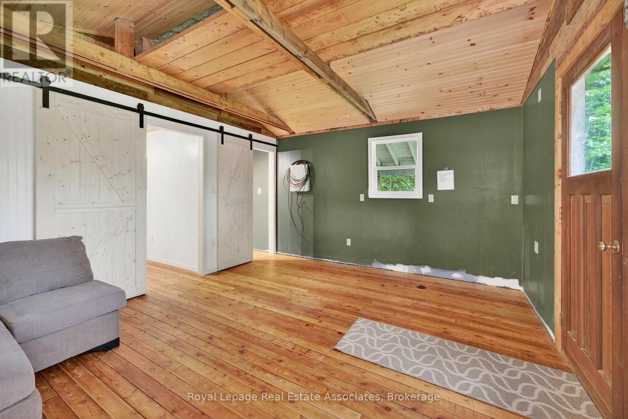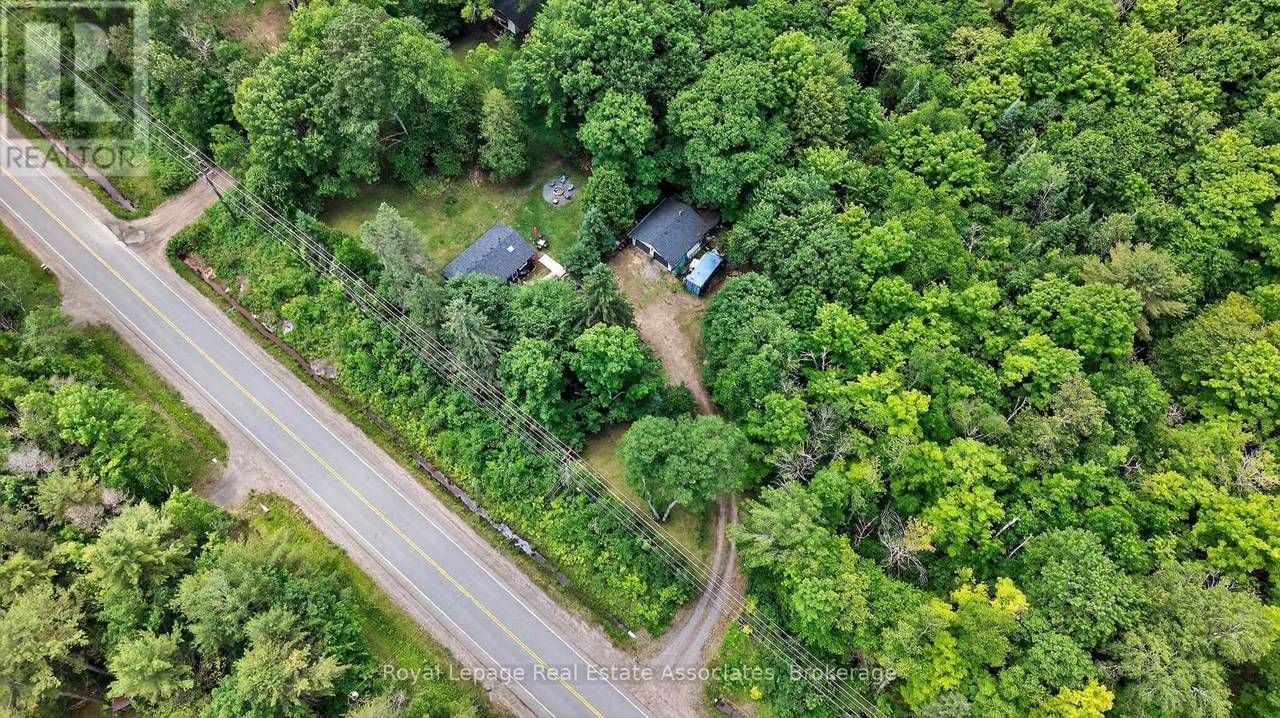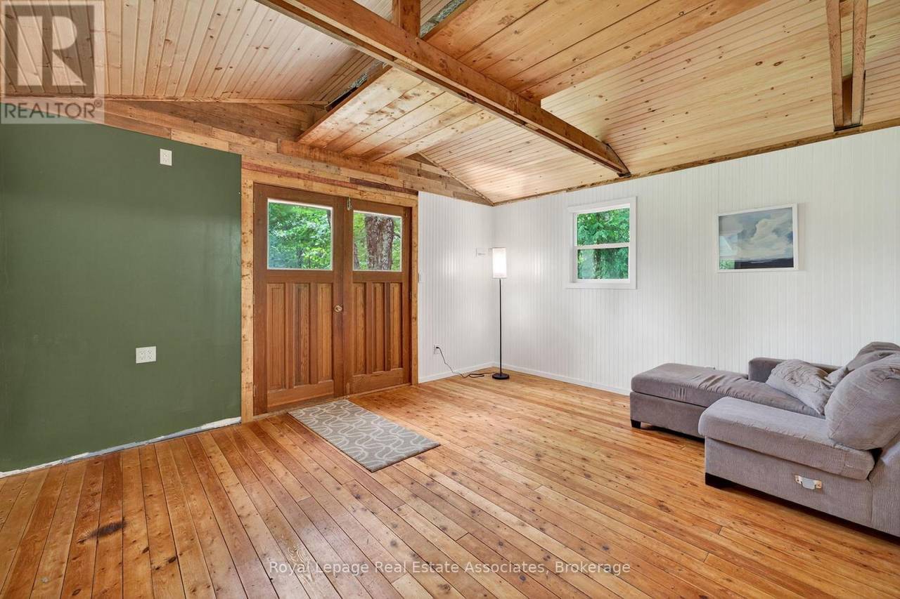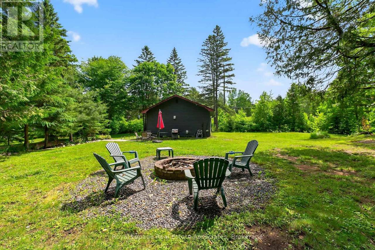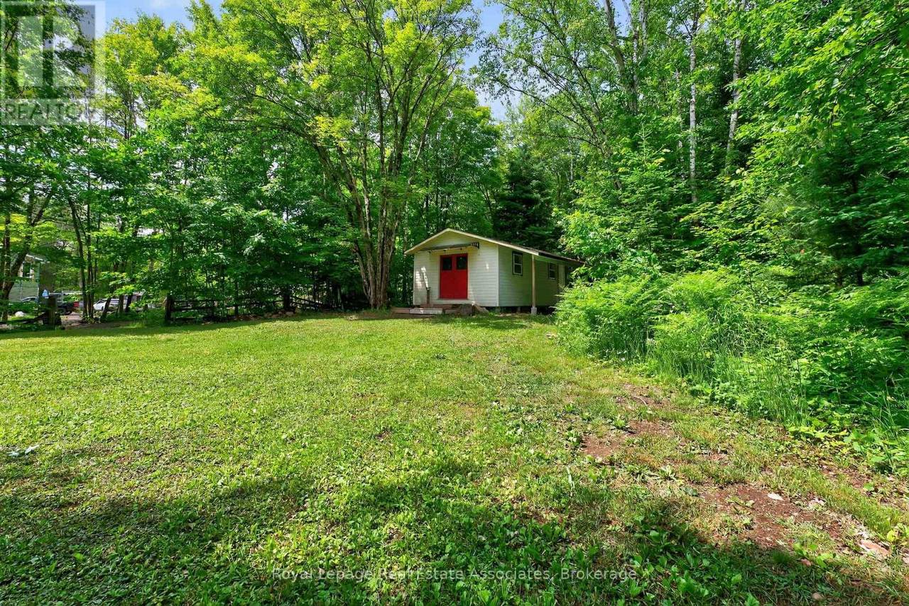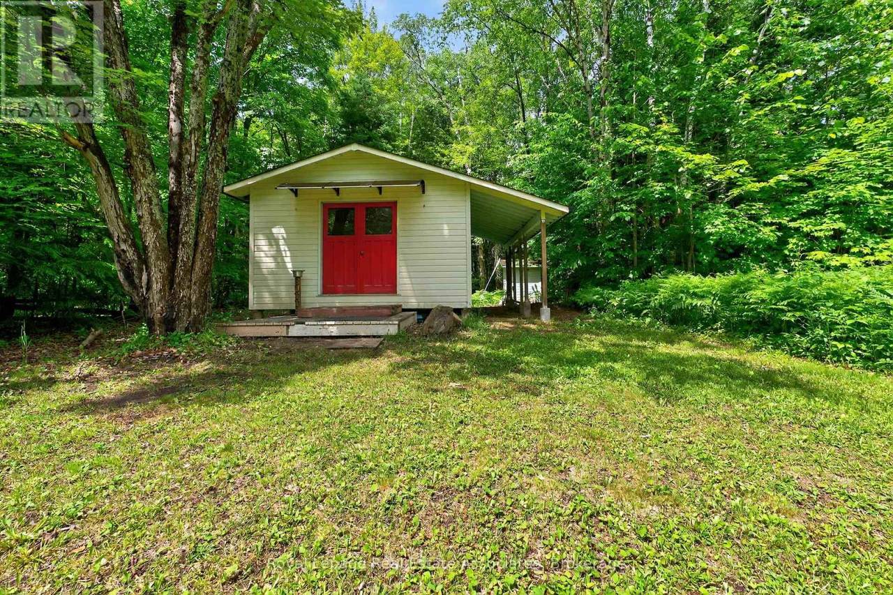 Welcome to your peaceful escape in the heart of the Algonquin Highlands! Situated directly across from the pristine waters of Halls Lake. Set on a spacious, tree-lined lot, the main home is a cozy 2-bedroom, 1-bathroom bungalow featuring an open-concept living and dining area, as well as a well-equipped and convenient kitchen and laundry area. A large picture window in the living room fills the space with natural light and serene views. Ideal for hosting family and friends or creating a private rental opportunity. The property also includes a separate 1-bedroom guest suite with it's own access off Stouffer Mill Rd, connecting to HWY 35. This dwelling makes for a perfect garden suite, and rental potential offering comfort, privacy, and flexibility for year-round enjoyment. This suite has been roughed in for a full bathroom and kitchenette just waiting for you to add your personal touch. A detached double car garage, with added workshop, provides ample storage for vehicles, tools, and recreational gear, making it easy to explore everything this sought-after lakefront community has to offer. Whether you're looking for a weekend getaway or a full-time residence surrounded by nature, this property is a rare gem just steps from swimming, boating, fishing, and the scenic beauty of Halls Lake. (id:64974)