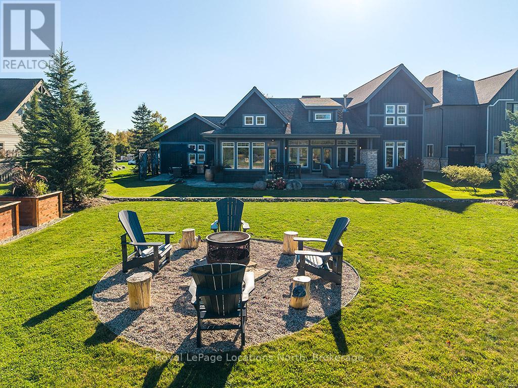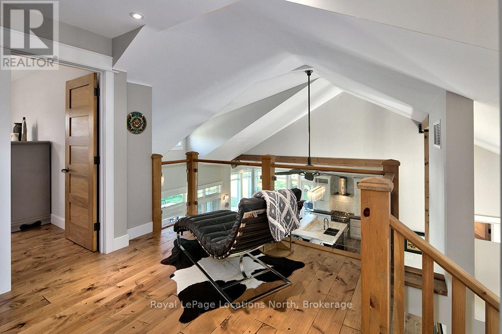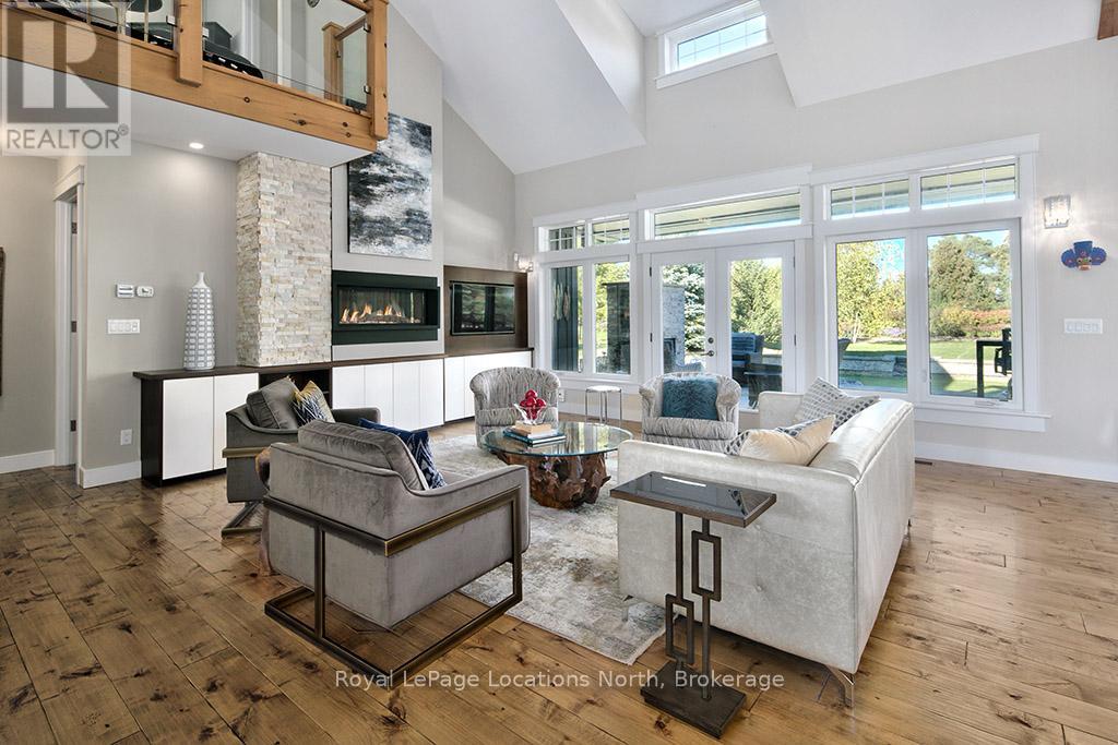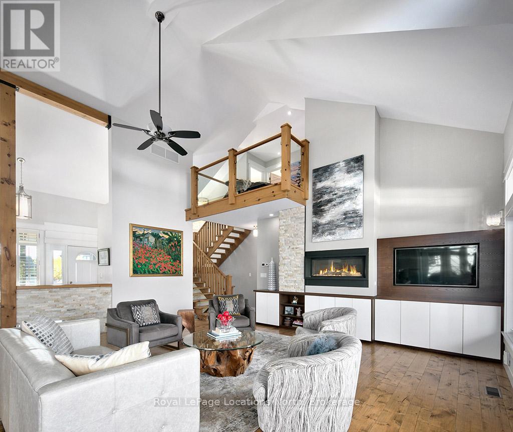 Welcome to 174 High Bluff Lane in the sought-after Trailwoods neighbourhood on the edge of Thornbury. This unique custom-built bungalow with loft blends contemporary style with rustic accents and offers over 3,600 sq. ft. of finished living space backing onto a protected ravine. From the moment you enter, you'll appreciate the craftsmanship and thoughtful details: 7" alder plank flooring, soaring vaulted ceilings, post and beam accents, shaker trim, and a grey-washed pine ceiling over the dining and kitchen. The open-concept great room impresses with custom cabinetry around a suspended linear gas fireplace, stone feature walls, and expansive windows that frame the professionally landscaped yard with slate patios and walkways, decking, gas outdoor fireplace, fire pit, and a garden shed with running water and hydro. The chefs kitchen boasts a massive waterfall island, upgraded appliances including a gas stove, custom cabinetry, under-cabinet lighting, and a walkout to the patio with a gas line for the BBQ. The main floor primary retreat features a walk-in closet and a spa-inspired ensuite with glass shower, and custom built double vanity. An office, powder room, and laundry with built-ins complete the main level. Upstairs you'll find two more bedrooms, a full bath, and a loft overlooking the living space. The fully finished lower level offers two additional bedrooms, a full 3-pce bath, storage room which could easily be used as a home gym, and a spacious family room ideal for gatherings. With the Georgian Trail across the street, Thornbury's shops, restaurants, harbour, and waterfront just a short walk or cycle away, and incredible skiing and golf just a short drive away, this property offers the perfect blend of modern luxury and four-season lifestyle. (id:64974)