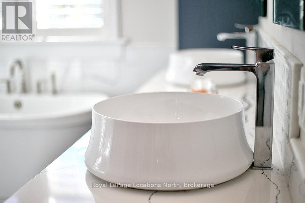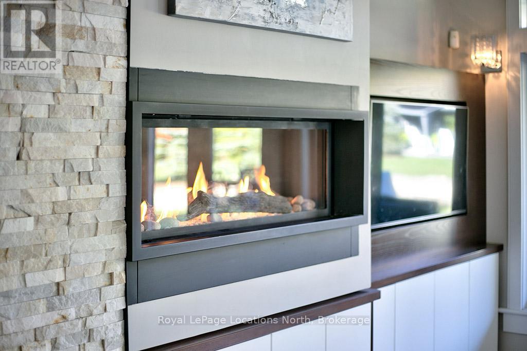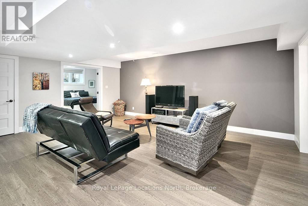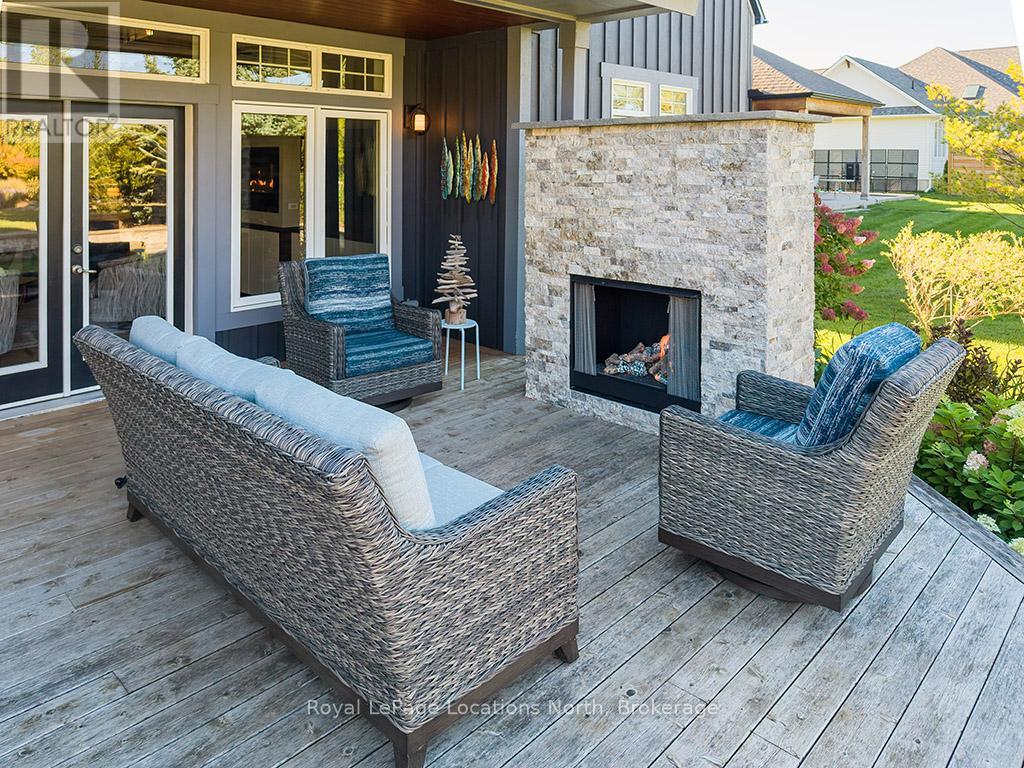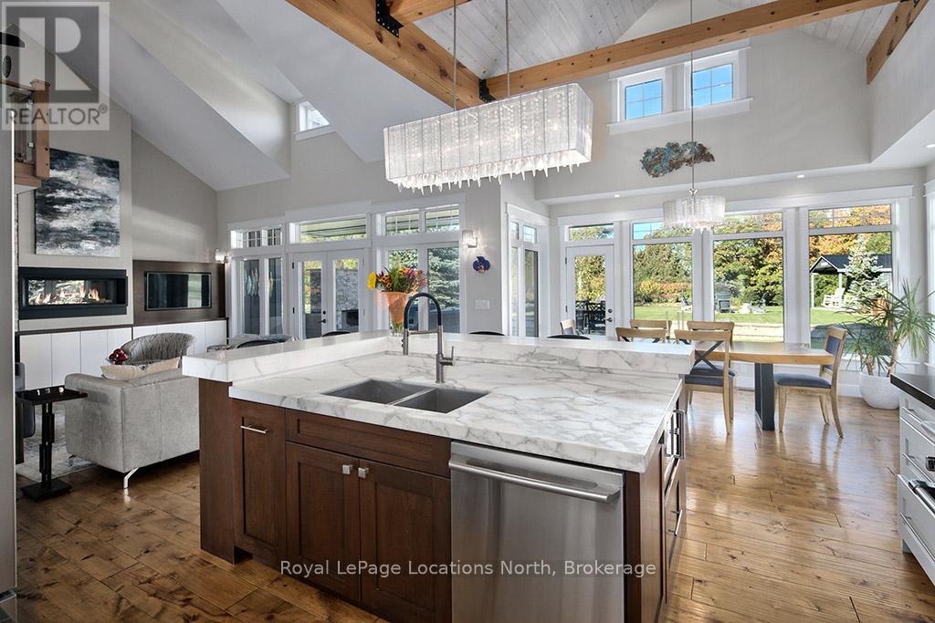Welcome to 174 High Bluff Lane in the sought-after Trailwoods neighbourhood on the edge of Thornbury. This unique custom-built bungalow with loft blends contemporary style with rustic accents and offers over 3,600 sq. ft. of finished living space backing onto a protected ravine. From the moment you enter, you'll appreciate the craftsmanship and thoughtful details: 7" alder plank flooring, soaring vaulted ceilings, post and beam accents, shaker trim, and a grey-washed pine ceiling over the dining and kitchen. The open-concept great room impresses with custom cabinetry around a suspended linear gas fireplace, stone feature walls, and expansive windows that frame the professionally landscaped yard with slate patios and walkways, decking, gas outdoor fireplace, fire pit, and a garden shed with running water and hydro. The chefs kitchen boasts a massive waterfall island, upgraded appliances including a gas stove, custom cabinetry, under-cabinet lighting, and a walkout to the patio with a gas line for the BBQ. The main floor primary retreat features a walk-in closet and a spa-inspired ensuite with glass shower, and custom built double vanity. An office, powder room, and laundry with built-ins complete the main level. Upstairs you'll find two more bedrooms, a full bath, and a loft overlooking the living space. The fully finished lower level offers two additional bedrooms, a full 3-pce bath, storage room which could easily be used as a home gym, and a spacious family room ideal for gatherings. With the Georgian Trail across the street, Thornbury's shops, restaurants, harbour, and waterfront just a short walk or cycle away, and incredible skiing and golf just a short drive away, this property offers the perfect blend of modern luxury and four-season lifestyle. (id:64974)