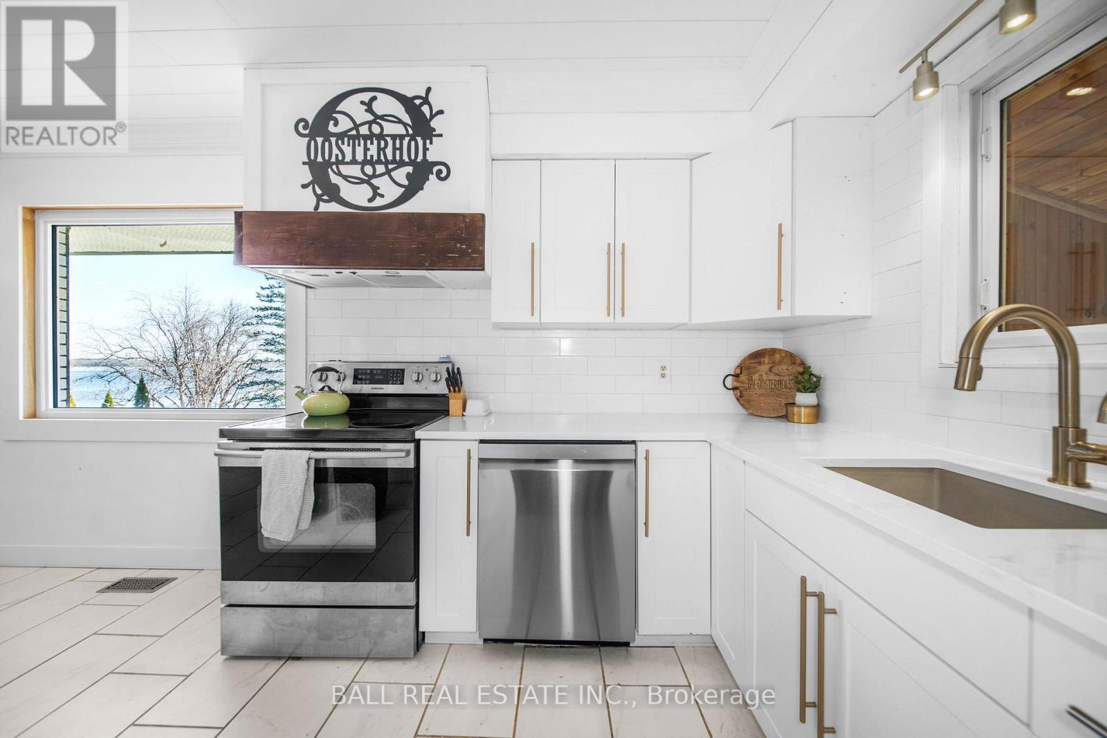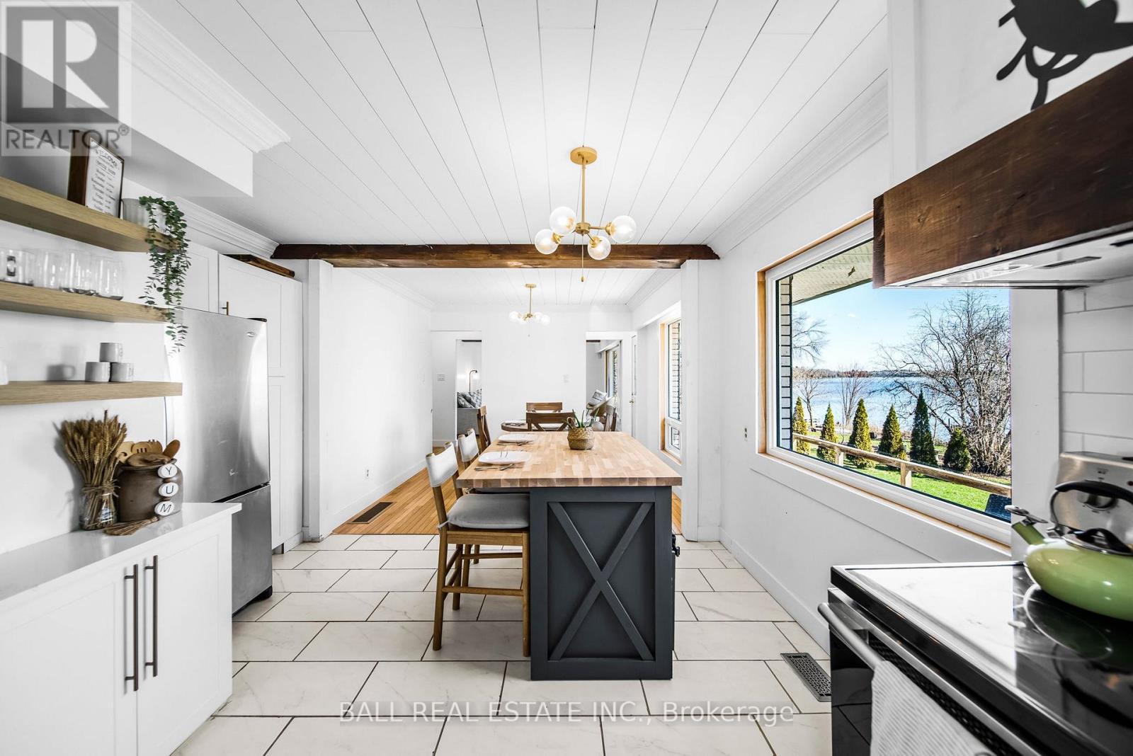 Live year-round on Katchewanooka Lake! Just 5 mins to the Village of Lakefield, 20 mins to Peterborough and right across from Katchawano Golf Course. Privately tucked off paved municipal road with large paved driveway leading to a triple car garage and renovated brick bungalow. Recent updates include brand new armour stone shoreline ('26), new furnace & AC ('23), updated kitchen & main bathroom ('23), plumbing and RO system ('23), updated dock ('22), new metal roof on garage ('21) and house roof ('23). Beautiful renovated kitchen, living room with propane fireplace and enclosed patio with hot tub. Offering 3 spacious bedrooms and 2 bathrooms (including ensuite with heated floors) and lower level with space to expand, rec room with wood fireplace, laundry and storage. Lovely level lot, sandy shoreline, ample paved parking, serviced municipal road with year-round curbside collection. Convenient waterfront living on the Trent Severn Waterway! (id:64974)