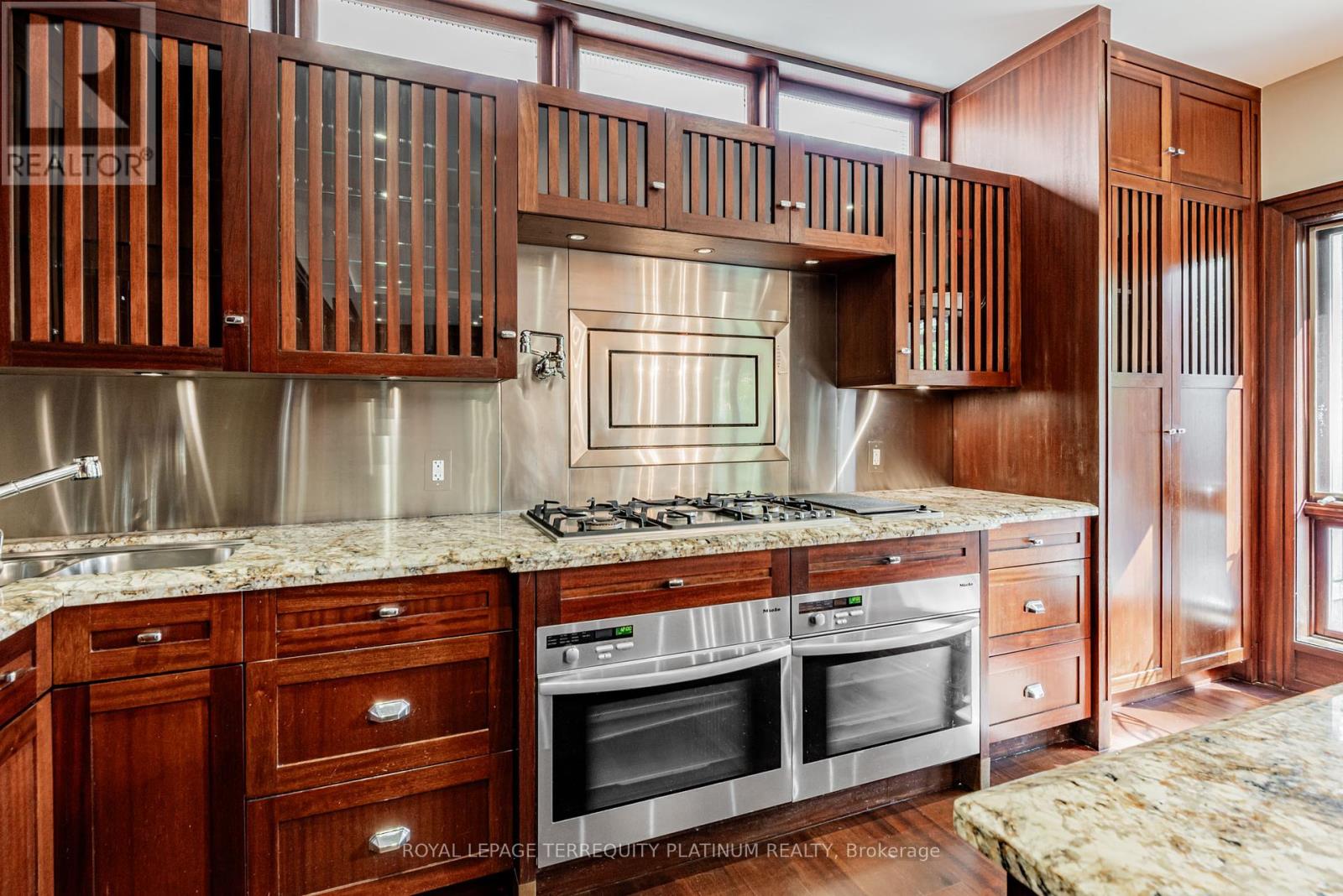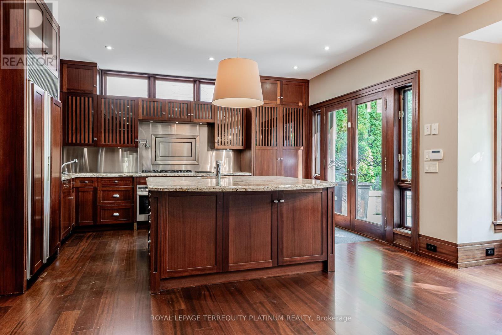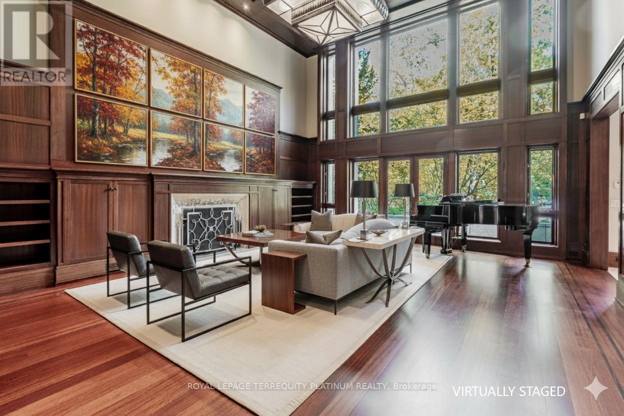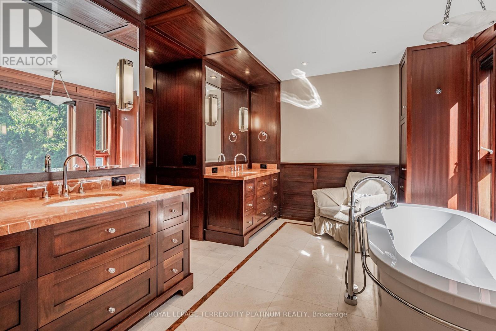 An architectural tour de force by acclaimed Robert Le Blond, recipient of the 1990 Governor Generals Award in Architecture ("Head-Smashed-In Buffalo Jump" in Alberta, now a UNESCO World Heritage Site), this 20-year-young bespoke residence is a French Art Deco masterwork of craftsmanship with inspired ironwork by Goudy from Spain. Offering over 5,000 sq ft of living space on a coveted corner by Chorley Park in prestigious Rosedale, the home is clad in rare Manitoba Tyndall stone, prized for its striking fossilized patterning. The residence blends enduring elegance with modern comfort, from the heated front porch and rear veranda to the soaring 17-foot living room crowned by a vintage theatre chandelier and wrapped in rich, mahogany-stained Jatoba wood wainscoting and floors. Formal entertaining spaces flow seamlessly into the chefs kitchen, breakfast area, and family room, all opening onto a landscaped garden sanctuary. The detached, heated garage, complete with a skylight, wet bar, shower, and custom storage, offers versatility as a private workshop, while a gated driveway ensures both privacy and grandeur. With five bedrooms, two offices, five fireplaces, six bathrooms, wrap-around balcony and even a dedicated pet wash, every element reflects a commitment to refined living without compromise. (id:64974)