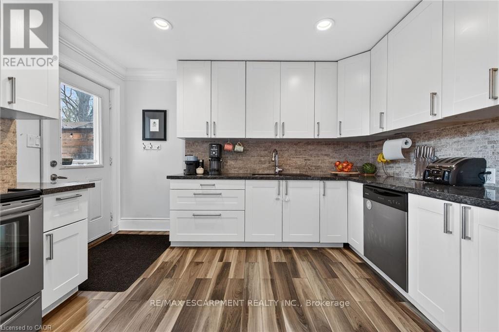 Ready to move in large family home in quiet south central location. Four beautifully finished floors of living space. Nothing to do here! Modern kitchen with loads of cupboards and granite counters. Large dining room opens to bright living room with built ins. Huge primary bedroom. Third floor boasts 2 possible bedrooms or large bedroom plus den. Fully finished lower level with 4 piece bath possible in law set up. Laundry room with quartz shelves over washer and dryer. Recently redone main bath. Nothing to do here. Covered front porch and large back porch partially enclosed. Great for year round barbecues. Private yard large storage shed. Convenient parking for 2 cars, front and back. Back concrete drive has access to alley with gate. This bright home with lots of pot lighting is extremely well kept. Great curb appeal. Located close to escarpment with 2 parks just steps away. Minutes to Gage Park & downtown. Perfect for commuters to GO Station, public transit, hospital. (id:64974)