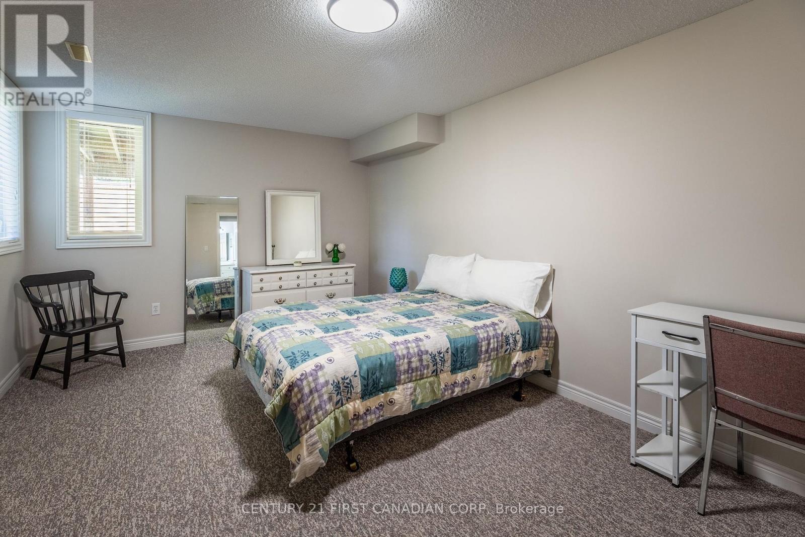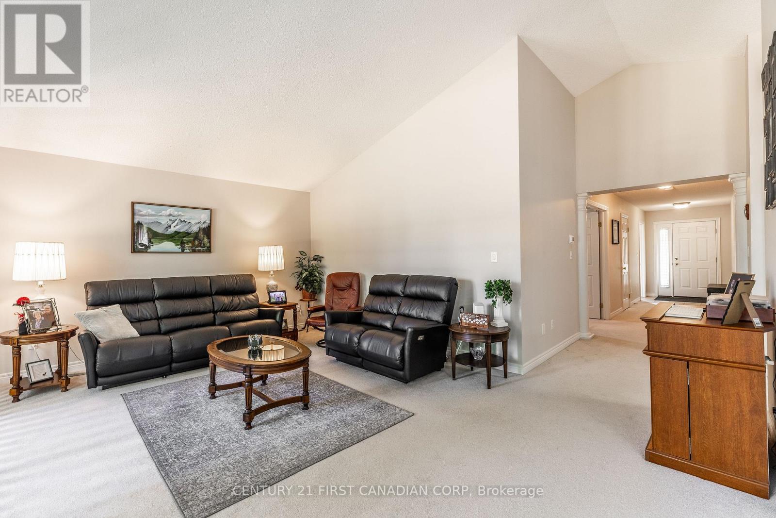 Welcome to this immaculate, fully finished 2+1 bedroom, 2.5 bath corner-lot condo located in the highly desirable Windemere Place community. Perfectly positioned near guest parking, this home combines comfort, space, and convenience. Step onto the charming front porch and into a bright, airy main level featuring vaulted ceilings and an abundance of natural light. The spacious great room is ideal for entertaining or relaxing with family. You'll love the large kitchen, complete with patio doors that open to a private deck perfect for morning coffee or evening BBQs. The main floor master suite includes a private ensuite, and the main floor laundry adds to the home's convenience. Downstairs, enjoy a generous recreation room with cozy gas fireplace, a third bedroom with a walk-in closet, and a full 3-piece bath. There's also ample storage space or potential for a workshop or hobby area. Additional highlights include a double driveway with single attached garage, low-maintenance living, and proximity to shopping, parks, and quick access to the 401 & London. The condo fees include lawn care, snow removal to the front door, shingle replacement, exterior brick work if needed, driveway and front step maintenance. Appliances included (Fridge 2022, Dishwasher 2022, Microwave 2022, Washing Machine 2024, Gas Dyer, and A/C replaced 2022) (id:64974)