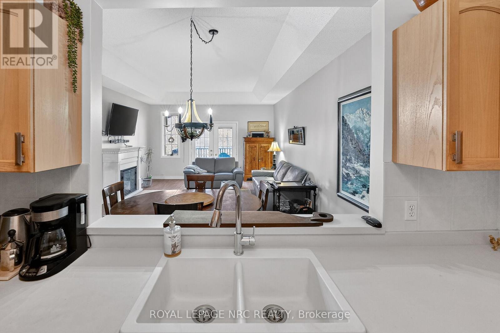 Welcome to this beautifully renovated 1,313 sq ft "Northwind" condo backing onto a serene wooded ravine! This move-in-ready, completely carpet-free home offers a bright, open layout with premium luxury vinyl and ceramic flooring throughout the main level. The stunning updated kitchen features Caesarstone concrete-style countertops, a white Blanco sink, and stainless steel appliances. Relax in the living area by the cozy electric fireplace.The main floor boasts two spacious bedrooms outfitted with California shutters, including a primary suite with a 3-piece ensuite, plus a fully updated 4-piece guest bathroom and convenient main-floor laundry. The partially finished lower level (completed in 2020) significantly expands your living space, offering a third bedroom, a modern 3-piece bathroom, and a spacious TV room perfect for guests or a home office.Step outside to your private outdoor oasis with no rear neighbours! Enjoy lush, peaceful ravine views from the deck (2018) or the beautiful custom flagstone patio (2019). The lifestyle here is unbeatable-you can easily walk to Jaycee Park, and from there, take the scenic walking and biking bridge straight into Port Dalhousie! Spend your days relaxing at the beach, grabbing a bite at local restaurants and coffee shops, walking out along the pier, or taking a nostalgic ride on the historic 100-year-old carousel for just 5 cents.This home has been meticulously maintained with major mechanical peace of mind, including a high-efficiency furnace, A/C, and owned hot water tank (2018), plus upgraded attic insulation (2020). Further updates include modern vanities, LED lighting, a new garage door motor (2024), and a Duraroc rubber surface on the front deck (2024). Enjoy low-maintenance living with an attached garage. (id:64974)