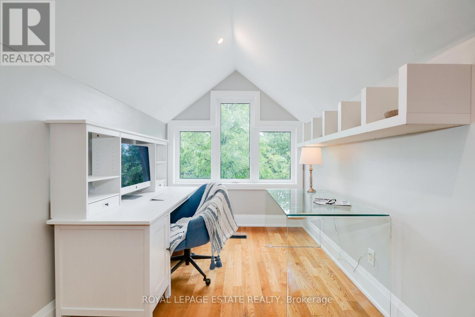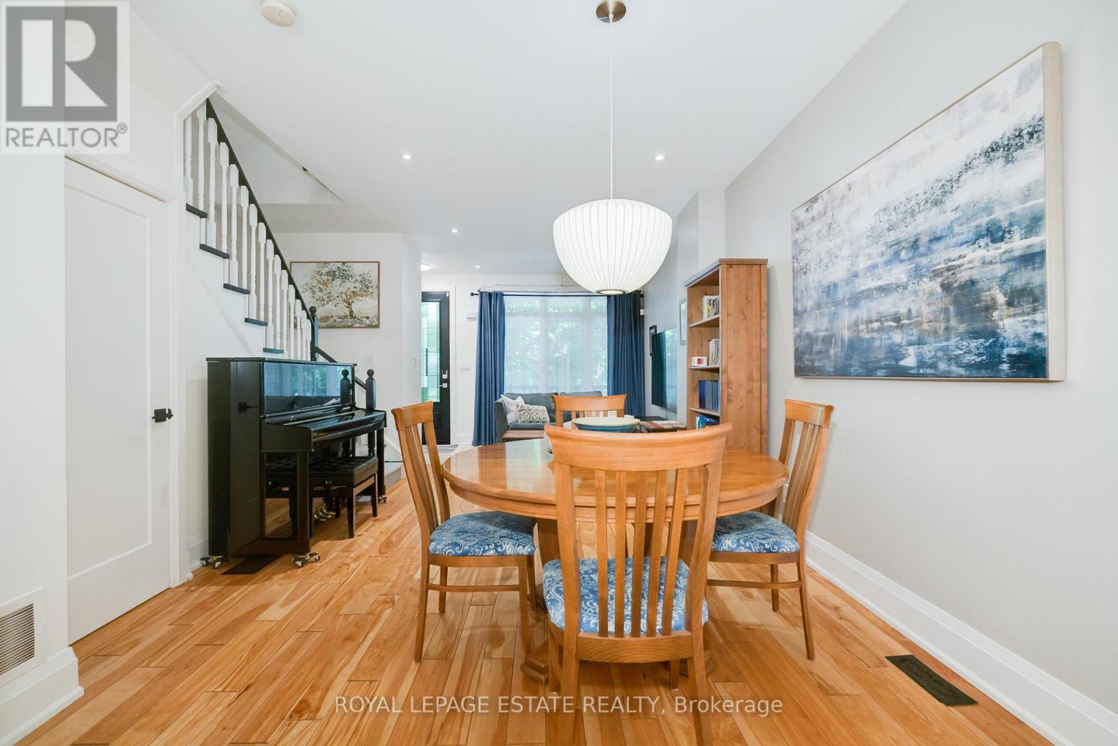 Step into a masterfully designed 3-storey home that defies expectations. Boasting soaring ceilings and an airy open-concept main floor, this home offers the scale and privacy of a semi-detached. The entire third floor is dedicated to a spectacular Primary Retreat, featuring vaulted ceilings, a private sun deck, walk-in closet, and a spa-like ensuite. Enjoy a fully finished basement with high ceilings and a rare separate walk-out and a convenient second-floor laundry. Bright and stylish, with a new furnace and A/C (2024). Complete with two-car parking off a wide lane, (driveway repaved in 2025) this stylish home is tucked away on a quiet, no-through-way street-perfect for families seeking an urban oasis near top schools, the best dog parks, large family park, GO transit, and local markets. (id:64974)