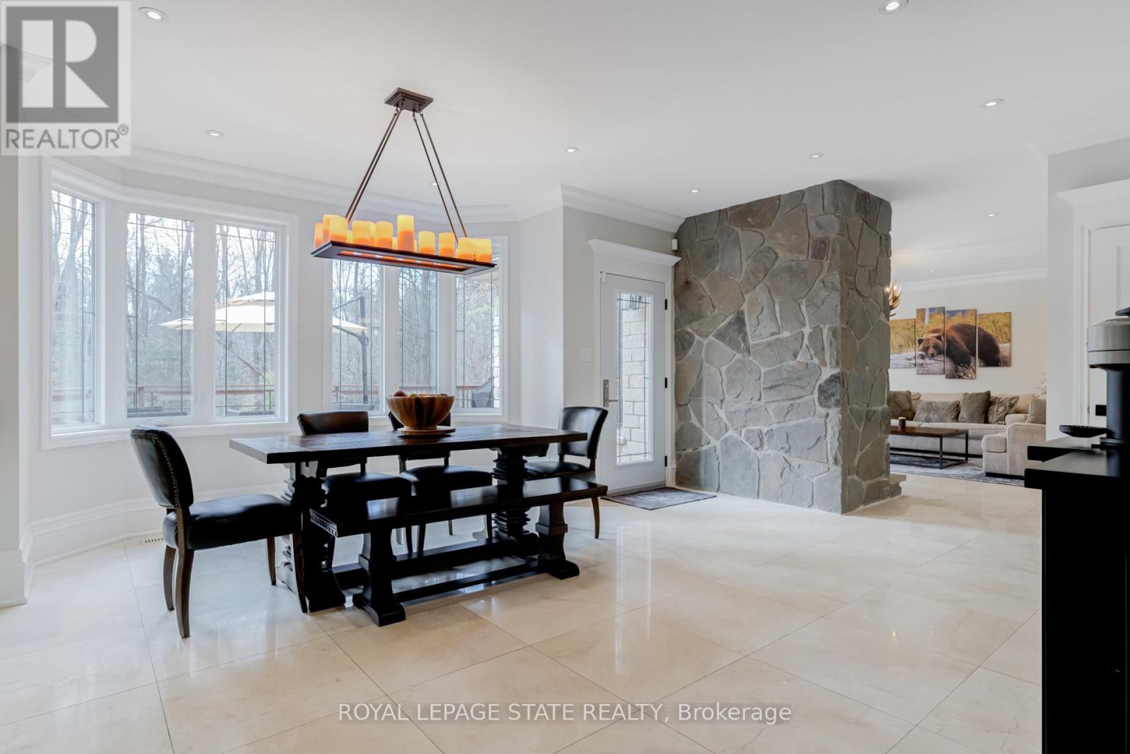 Experience unparalleled luxury in this fully renovated, nearly 7,000 sqft custom-designed executive home on a stunning 2.5-acre property in one of Ancaster's most exclusive enclaves. Surrounded by nature yet minutes from city conveniences, this home blends upscale living with serene privacy-you have to see it to believe it. New stone walkways and lush greenery create exceptional curb appeal. Inside, every detail has been meticulously crafted to maximize space and functionality. Upon entering, you're immediately captivated by the grand 'Scarlett O'Hara' staircase. The main level boasts formal living and dining areas, a private office, and two powder rooms. The spacious custom laundry/mudroom features garage access and a second staircase to the basement. The elegant family room is a true focal point, with a Valor gas fireplace and a stone feature wall. The gourmet eat-in kitchen is equipped with top-of-the-line appliances, custom cabinetry, granite countertops, and stone accents. Rich hardwood, marble tiles, and high-end fixtures flow throughout. Upstairs, the primary suite is a private oasis featuring a spa-inspired 5-piece ensuite with a curbless glass shower and a deep soaker tub, as well as an expansive walk-in dressing room with custom built-ins. Three additional bedrooms and two beautifully updated baths complete the upper level. The newly renovated walkout basement is the ultimate entertainment hub, offering a fifth bedroom, full bathroom, and a stylish kitchenette or wet bar. Relax in the media area with a Valor fireplace or workout in the state-of-the-art gym. Step outside to a private patio with a hot tub-perfect for unwinding in nature. This level also offers excellent in-law suite potential. Outside, serene ponds and breathtaking views create a peaceful, cottage-like atmosphere. A multi-tiered deck extends the home's living space, ideal for dining and entertaining. The expansive yard completes this one-of-a-kind luxury retreat. (id:64974)