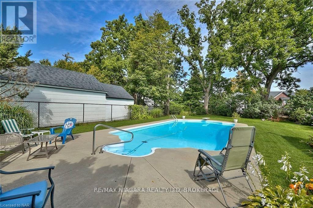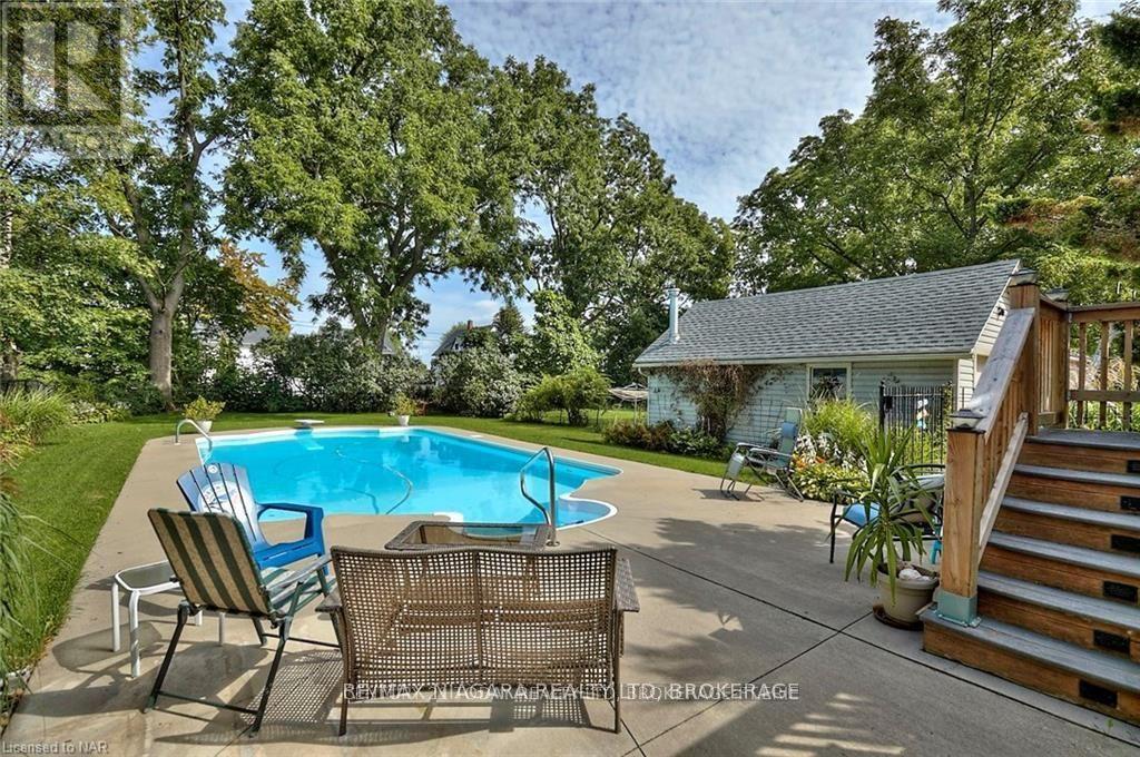 This beautifully crafted 2.5-storey stone and brick home sits on a generous lot just steps from the Niagara River, offering a rare blend of elegance, history, and modern comfort. Step inside to discover soaring 9-foot ceilings, gleaming wood floors, and exquisite original wood trim and doors. The inviting living room features a corner gas fireplace with oak surround, while the formal dining room seamlessly connects to both the kitchen and living area. The thoughtfully updated kitchen (2012) boasts granite countertops, crisp white cabinetry, a centre breakfast island, and tiled flooring perfect for everyday living and entertaining. A unique secondary staircase leads to the upper level, where the primary bedroom offers its own private balcony (redone in 2016). The second-floor bathroom was fully remodeled in 2018, complementing three additional spacious bedrooms. The finished third level provides a versatile retreat with skylights, a carpeted recreation room, office area, and ample storage. Outdoors, beautifully landscaped grounds frame a stunning in-ground pool (18' x 38', up to 9.5 ft deep) with a brand-new liner installed in 2023 along with a new heater (2023), creating a private oasis for relaxation and gatherings. A fenced backyard and single detached garage complete the exterior. This meticulously maintained home has seen numerous updates, including a new roof (2016), furnace (2018), re-done driveway (2016), flooring (2014), balcony, windows, and more ensuring peace of mind for years to come. (id:64974)