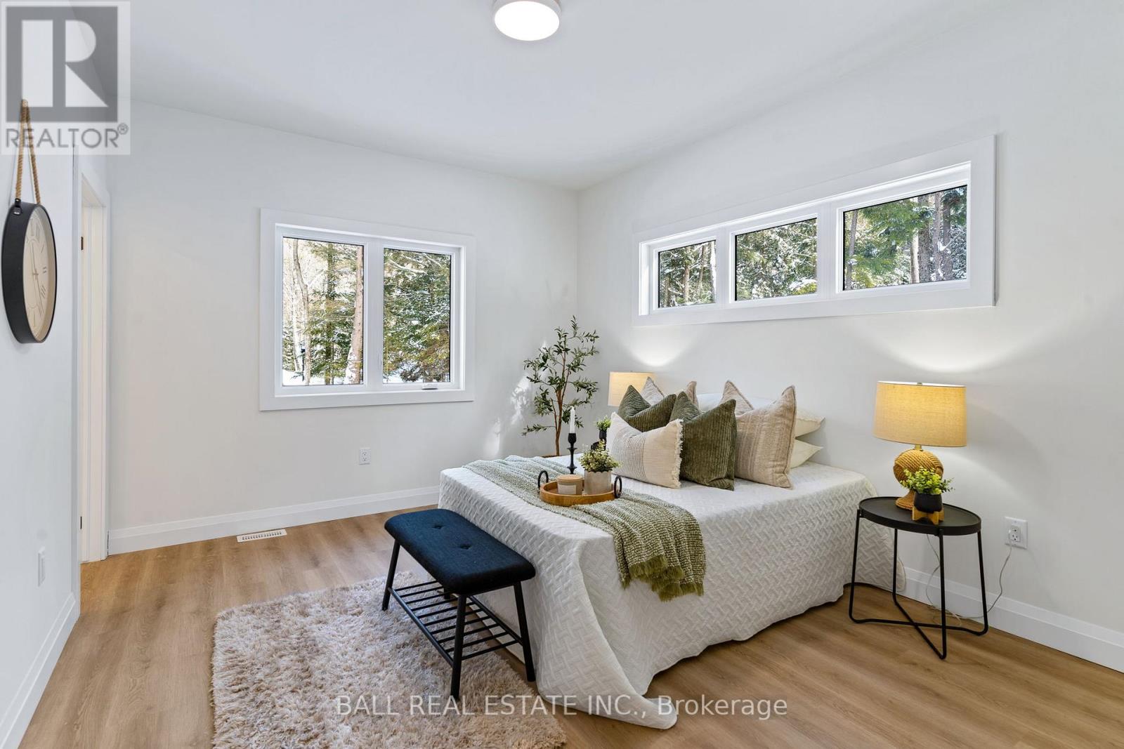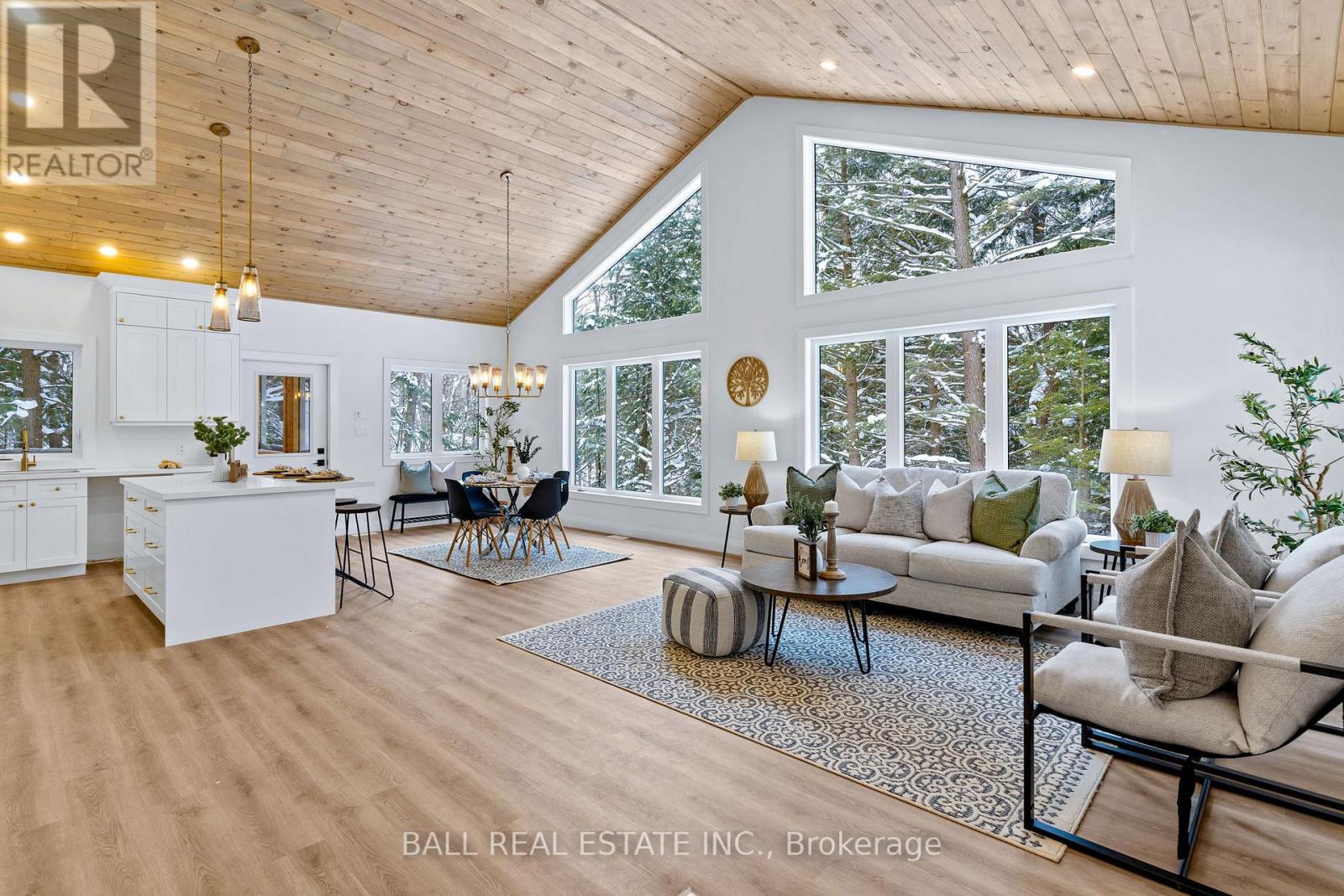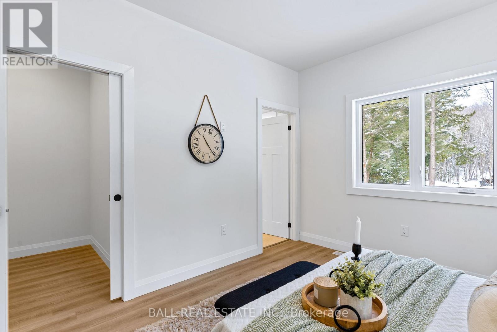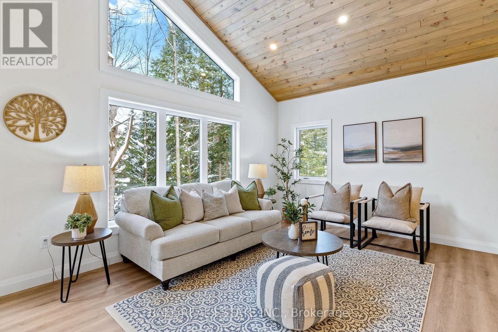 Welcome to this thoughtfully designed 2025 custom bungalow, offering approximately 1,200 sq.ft. of well-planned living space and the perfect blend of modern comfort with an in-town rural feel. The main floor features a bright, open-concept living, dining, kitchen area, highlighted by vaulted pine ceilings and abundant natural light. The custom kitchen is finished with quartz countertops and quality cabinetry, flowing seamlessly into the main living space-ideal for everyday living and entertaining. Durable luxury vinyl flooring runs throughout the main level, complemented by spacious bedrooms with large closets. The primary bedroom offers a walk-in closet and a private 4-piece ensuite, while a second 4-piece bathroom and convenient main-floor laundry complete the level. Additional quality finishes include North Star windows, an asphalt shingle roof, and a welcoming front deck. At the rear, enjoy a 12' x 12' pine screened-in room with direct access to the backyard-perfect for relaxing and enjoying the natural surroundings. Full ICF foundation and features a bright walk out basement with oversized windows and a patio door, allowing for excellent future living potential. The basement is partially finished, with electrical completed, partial drywall installed, and rough-in for a third bathroom already in place. Mechanical systems include a propane furnace, owned hot water tank, 200 AMP panel and HRV system. Set on a beautifully treed lot, the property backs onto a natural escarpment, creating a private & peaceful backyard. Located on a municipally maintained road with underground hydro, phone, and internet, and accented by stylish street lanterns, this quiet dead-end cul-de-sac offers minimal traffic and a strong sense of community. All within walking distance to Haliburton Village, surrounded by custom homes, and designed to preserve a true rural atmosphere while still enjoying the convenience of town amenities. (id:64974)