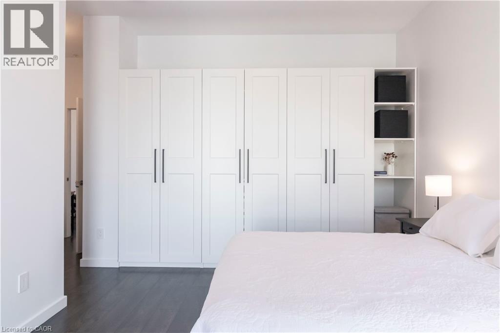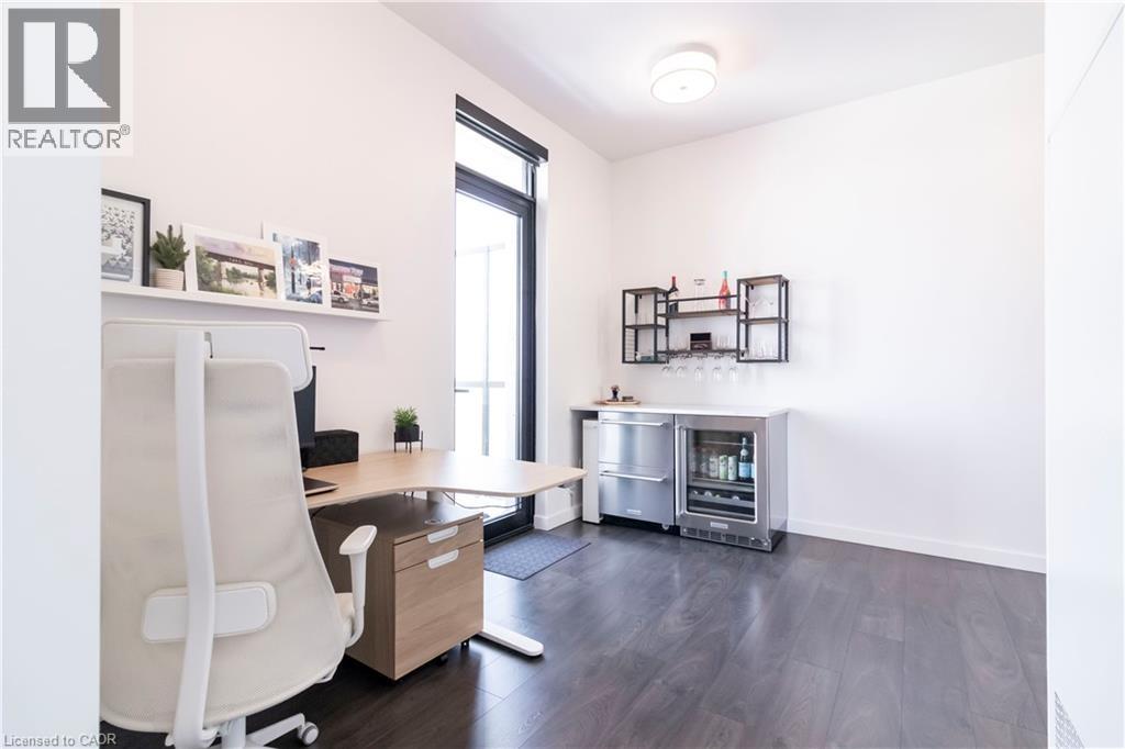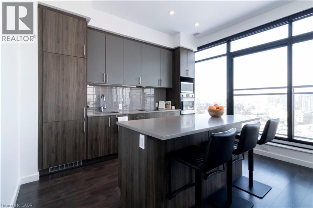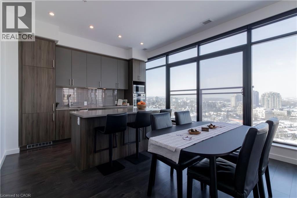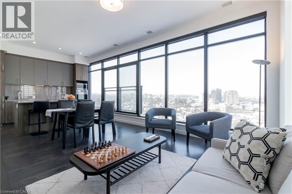 One of Uptown Waterloo's most prestigious condominium residences, Circa 1877 offers refined urban living at its best. A perfect blend of thoughtfully appointed luxurious interior living space with the convenience of 2 dedicated underground parking spaces, suite 1513 at 181 King St Waterloo checks all of the boxes. Immediately upon entry, the soaring 10 foot ceilings let you know this is not your typical 2 bedroom 2 bathroom condo. Offering 1250 square feet of interior living space, plus 2 private balconies, the north western panoramic views of the cityscape and nightly sunsets are impressive. Designed for both style and functionality, the expansive open-concept layout is filled with natural light and ideal for sophisticated entertaining. The chef-inspired kitchen features European built in appliances, quartz counters, and large kitchen island with ample seating. Flowing seamlessly into the living room and additional dining area, you are surrounded by floor to ceiling windows and premium carpet free flooring throughout the suite. Both bright and spacious bedrooms offer built-in wardrobes, commercial-grade automatic silver-screen roller sheers (throughout condo), offering additional blackout options in the bedrooms, and the primary bedroom features a 3 piece ensuite bath. Bonuses include a dedicated den space, bar area with KitchenAid beverage cooler/freezer plus wine fridge, WIFI thermostats and lighting controls for your convenience, insuite laundry, and private storage locker. Circa 1877 features unparalleled amenities including outdoor saltwater pool with cabanas and bbq, fitness centre, yoga space, co working space, and social lounge. You are able to enjoy one of Waterloo’s newest fine dining restaurants at your doorstep Lala Social House. Enjoy being steps from grocery stores including Vincenzo’s, upscale restaurants and bakeries, public transportation including the LRT, Waterloo Park, highway access, and Waterloo Town Square. (id:64974)