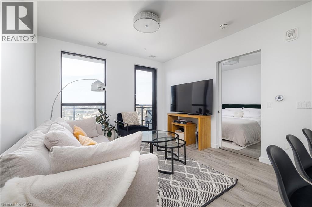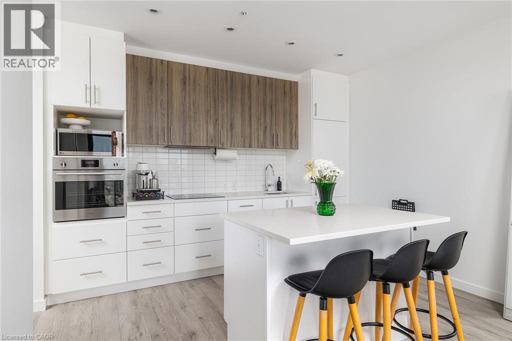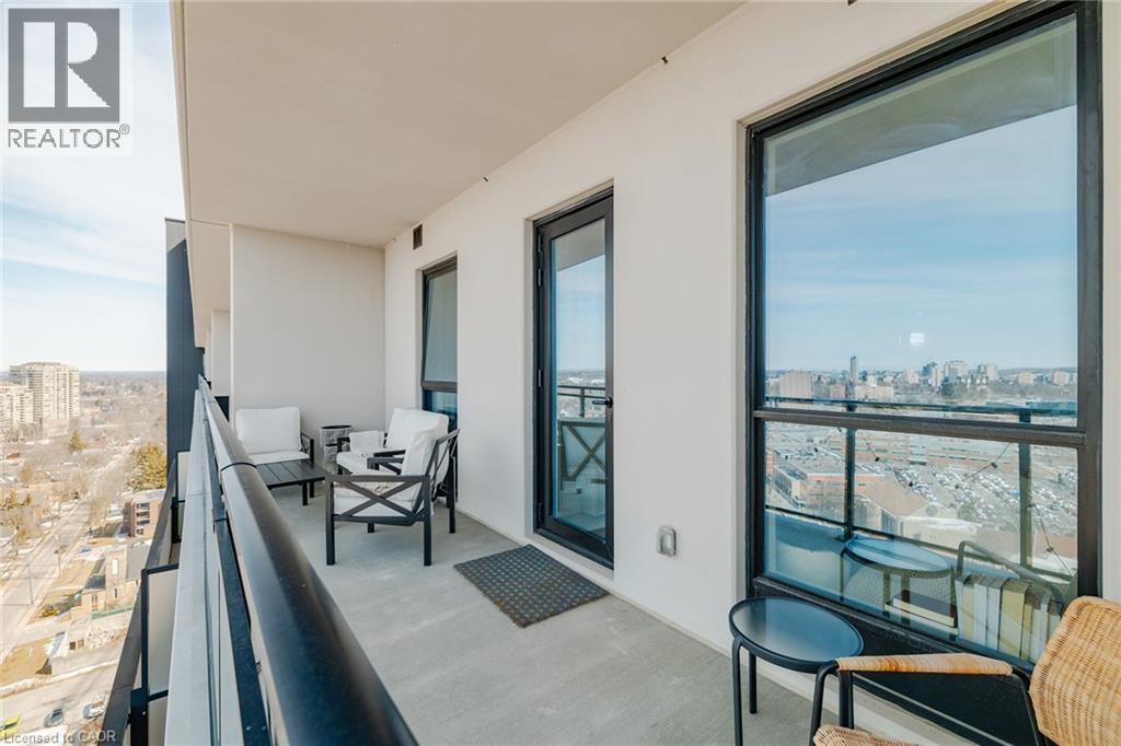 Take in breathtaking sunset views from your spacious private balcony on the 17th floor of Circa 1877, one of Uptown Waterloo's most sought-after condos. With 9' ceilings and expansive windows, this modern, bright unit offers a stylish open-concept living space. The European-inspired kitchen features built-in appliances, Quartz countertops, a gooseneck faucet, a subway-tile backsplash, and an island perfect for entertaining. The luxurious bathroom boasts porcelain tiles, Quartz counters, and a rainfall shower with a glass enclosure. Additional highlights include an in-suite washer and dryer, Smart lighting, and a custom wall-to-wall closet with a sliding barn door. Circa 1877 offers top-tier amenities, including a rooftop pool with a terrace, BBQ and cabanas, a fitness center and yoga room, a modern co-working space with meeting rooms, guest suites, secure bike storage, and a restaurant/bar. The building is monitored by cameras and features FOB access for added security. An onsite locker and optional parking rental add convenience. Located on King Street, you're just steps from the LRT, shopping, dining, boutique fitness studios, and healthcare services. Minutes away, you'll find Waterloo's Tech Hub, Waterloo Park, and the Iron Horse Trail-perfect for biking and running. This prime location makes it an ideal choice for young professionals. Don't miss this incredible opportunity to live in the heart of Uptown Waterloo-schedule your tour today - WIFI Included! (id:64974)