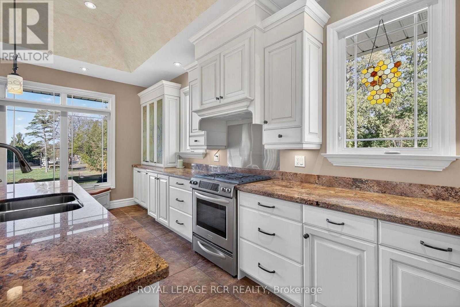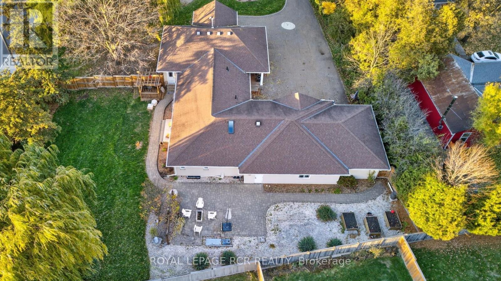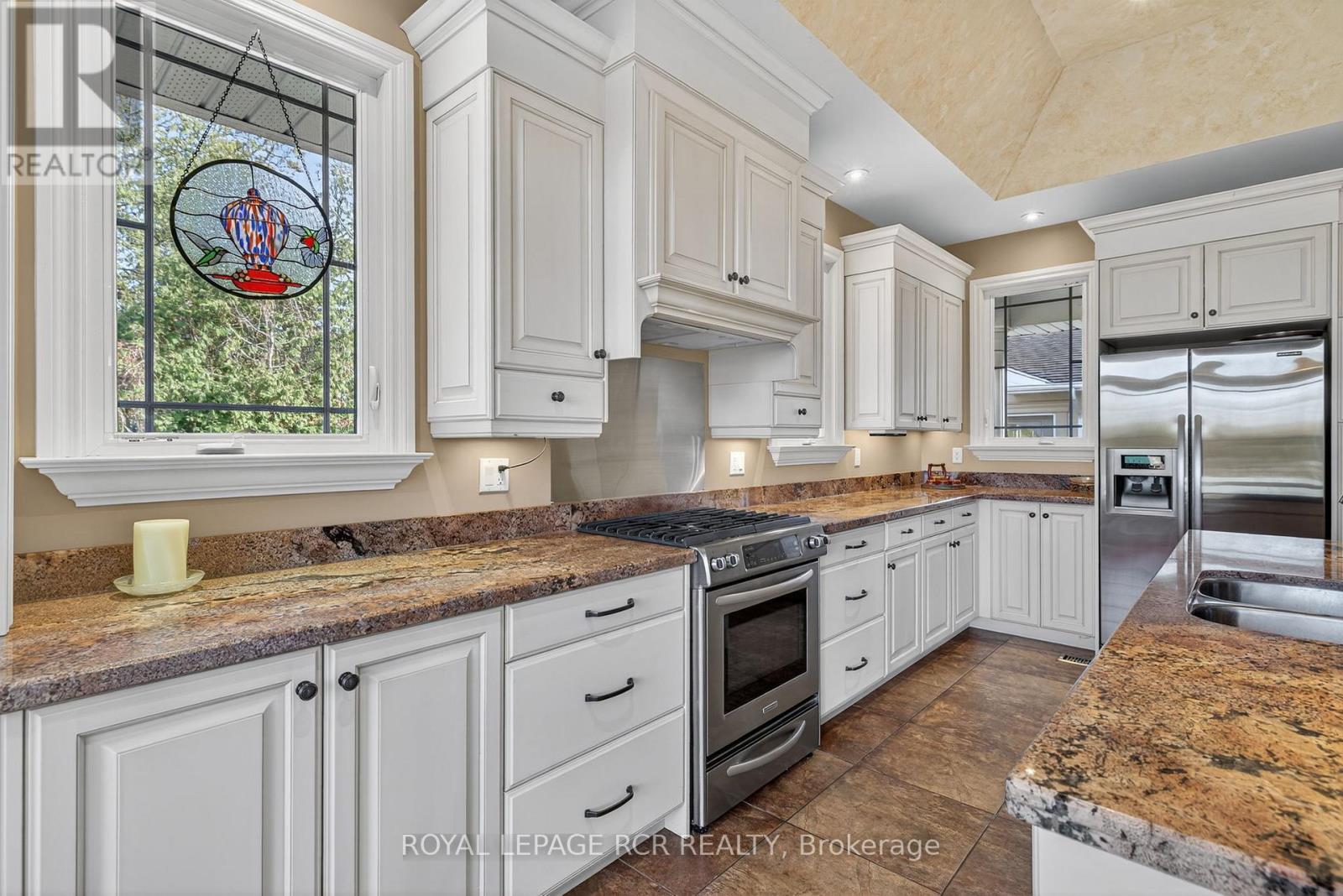 Executive bungalow on nearly an acre in town ! Welcome to unparalleled luxury in this custom stone and stucco bungalow boasting over 5000 sq ft of total finished living space on a rare, almost one acre lot right in town with an oversized triple attached garage-approx 1350 sq ft ! The main floor features an impressive foyer leading to an open concept layout. The gourmet kitchen is an entertainers dream, featuring a breakfast bar, pot and pendant lighting, a cozy window seat with hidden storage, pullout shelves in pantry, and a cleverly hidden TV. The space flows seamlessly into the living room, highlighted by a four sided gas fireplace and beautiful hardwood flooring. The primary suite is a private retreat with a walkout to the side yard, a large walk in closet & stunning ensuite with heated floors. A separate walk-down from the mudroom leads to the fully finished lower level, which features a possible in-law setup. It includes 2 bedrooms 1 & 1/2 bathrooms, a second kitchen and a huge rec room with unique colour changing in-ceiling rope lighting & pot lights. The basement also includes an additional hookup for laundry + 3 cold cellars. Recent mechanical updates include 2 new furnaces (2021), 2 new AC (2021) and a UV air filtration system, whole home water treatment system and reverse osmosis system (2021) as well as leaf gutter protection (2021) with lifetime transferable warranty. A spacious, fully fenced backyard gives privacy and outdoor enjoyment! This truly unique and stunning property offers space, luxury and convenience that is second to none! (id:64974)