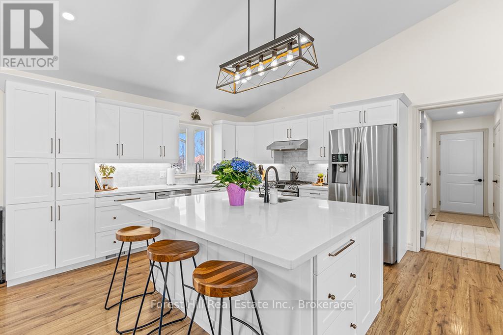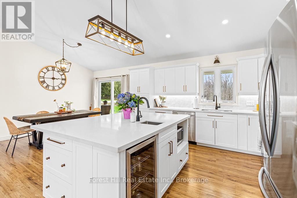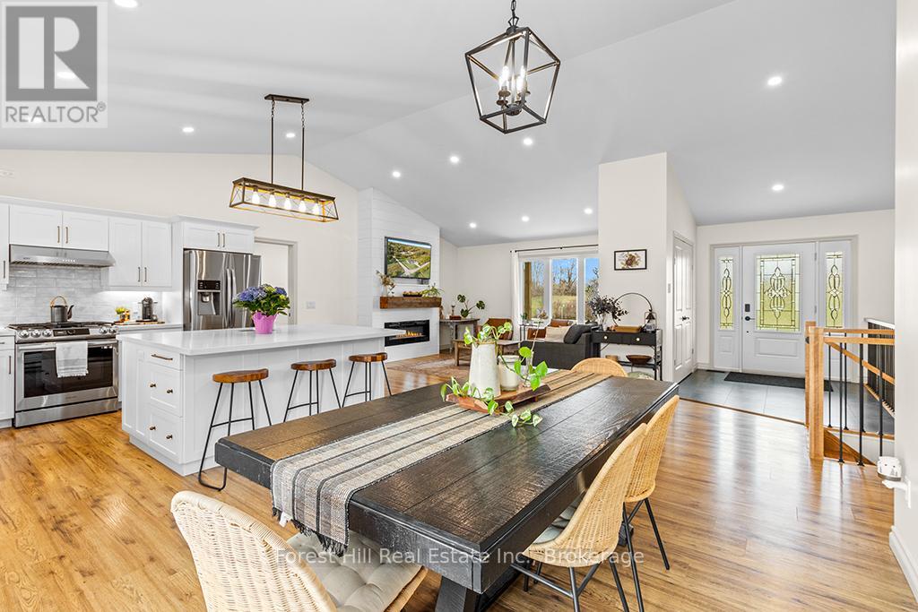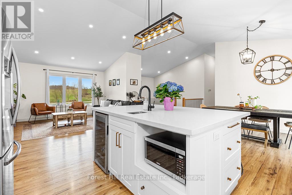 More home. More land. A quieter way of living. Gorgeous custom-built bungalow on a beautifully landscaped 0.6 acre lot offering 5 bedrooms, 4 bathrooms, and bright open living spaces designed for comfortable one-floor living. Located in a peaceful village setting just moments from the Bruce Trail, Walters Falls and local farm stores with Markdale, Meaford, Owen Sound and Southern Georgian Bay attractions all within a short drive. Designed for everyday comfort and entertaining, the main floor features an open concept layout where a chef-inspired kitchen flows seamlessly into the spacious living and dining areas. Oversized windows fill the home with natural light and create a warm, inviting atmosphere. The primary suite offers a private retreat with a generous walk-in closet, luxurious 5 piece ensuite and direct access to the covered rear deck - perfect for morning coffee or relaxing evenings. Two additional main floor bedrooms provide generous space and large windows. A practical mudroom and laundry area with powder room and direct access to the heated double garage add everyday convenience, while heated tile floors ensure comfort (foyer, 2pc bath and ensuite). The fully finished lower level expands the living space with high ceilings and large windows, offering two additional bedrooms, a full bathroom, a home office or gym, and a spacious family room with kitchenette ideal for guests or extended family. Outside, the landscaped grounds include a covered front porch, extended rear deck, poured concrete patio, and a gravel terrace with fire pit-perfect for summer evenings and outdoor entertaining. (id:64974)