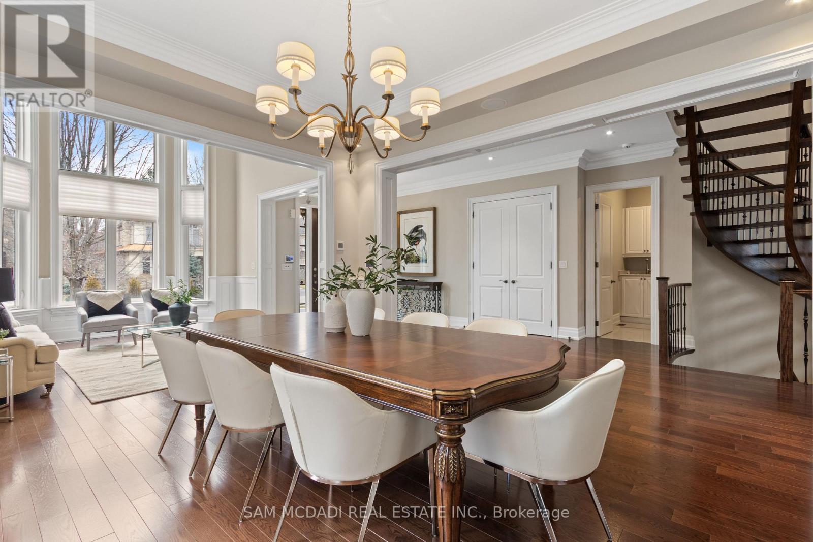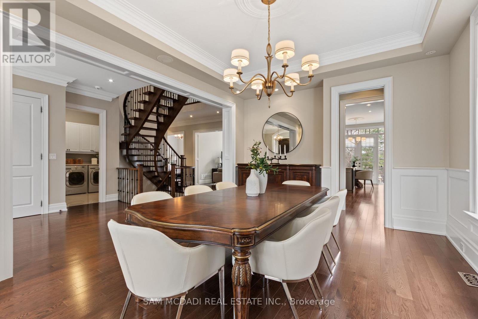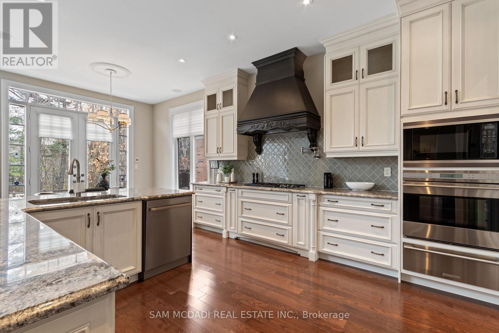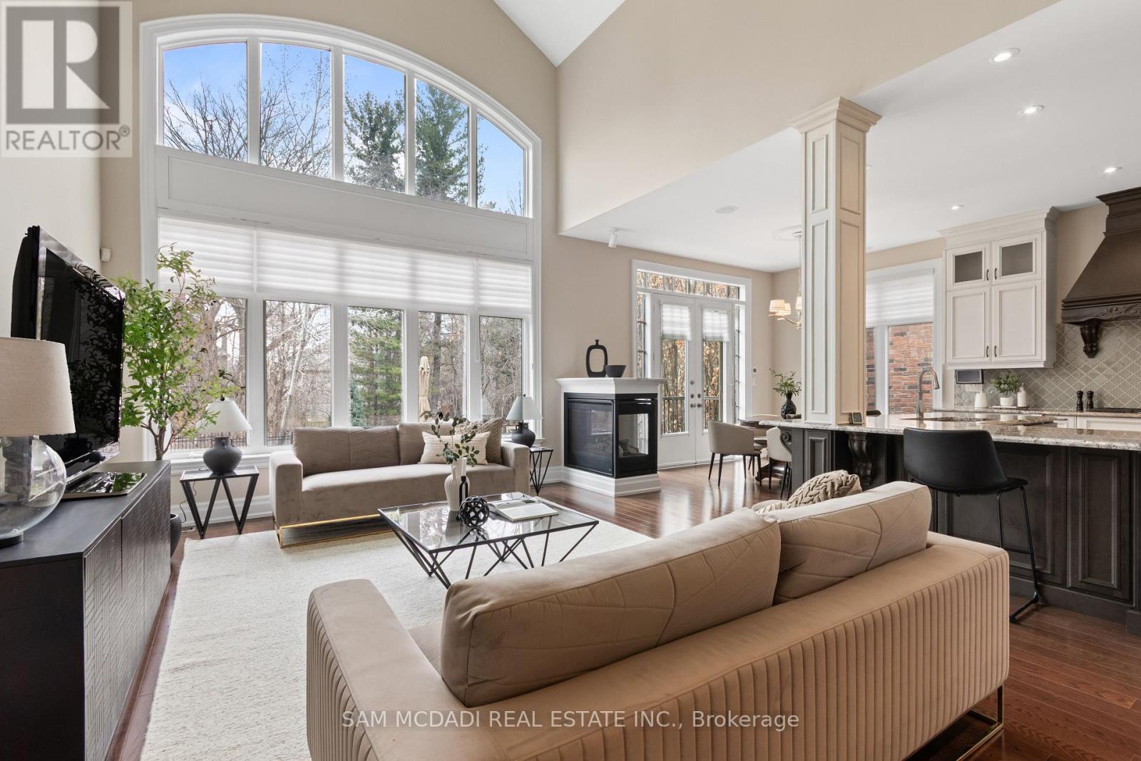 Welcome to this exceptional, executive residence on a quiet court in one of Mississauga's most sought-after enclaves. Backing onto a serene, private forest setting, this home offers the perfect blend of luxury, comfort, and timeless design ideal for discerning buyers seeking refined main-floor living. The moment you enter, you are greeted by a grand foyer with soaring 10-ft ceilings, elegant crown moulding, custom wainscoting and architectural detailing that carries throughout the home. The formal living and dining rooms impress with cathedral ceilings, designer lighting, and upscale finishes perfect for entertaining in style. At the heart of the home is a chef-inspired kitchen featuring premium appliances, custom cabinetry with illuminated uppers, a large granite peninsula and a seamless flow into the breakfast area and great room. The open-concept layout is enhanced by expansive windows showcasing tranquil views of the lush backyard and forest beyond. Designed with convenience and long-term comfort in mind, the main floor primary suite is a true retreat. Boasting a vaulted ceiling, spa-like ensuite with soaker tub and glass shower and a custom walk-in closet, this space offers privacy and ease of living rarely found in homes of this caliber. The upper level features a spacious loft area and generously sized bedrooms, including a private ensuite and a Jack & Jill bath ideal for family or guests. The professionally finished basement extends the living space with 9-ft ceilings, a guest bedroom with ensuite, a large recreation room with fireplace, a den, and a well-appointed kitchenette perfect for extended family or entertaining. Outdoors, enjoy a beautifully landscaped property complete with a two-tier deck, custom pergola and elegant stonework all backing onto nature for ultimate privacy. This is a rare offering combining luxury, functionality, and an ideal layout for those seeking the ease of main-floor living without compromising on space or elegance. (id:64974)