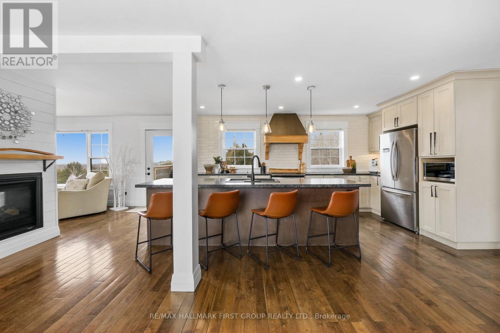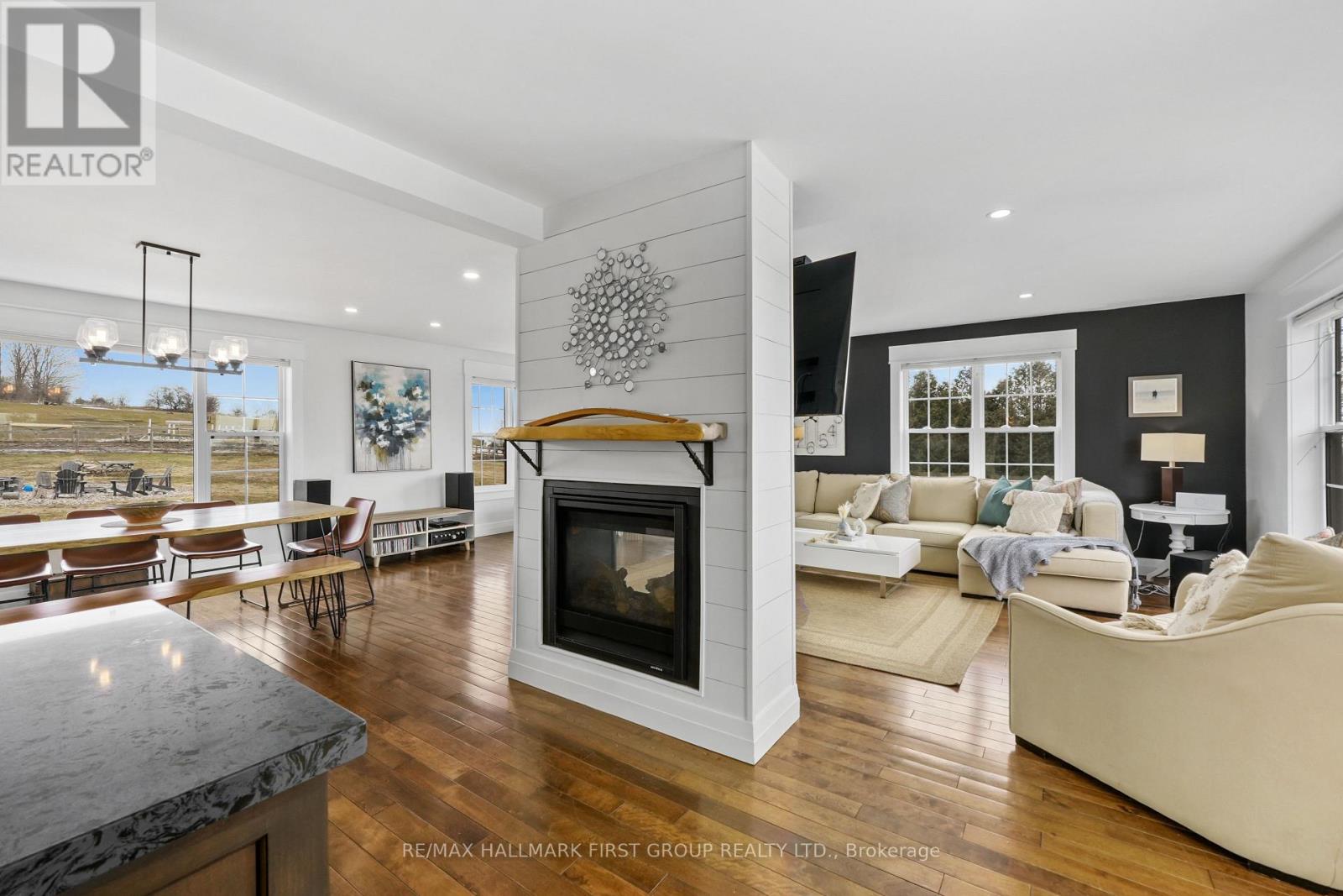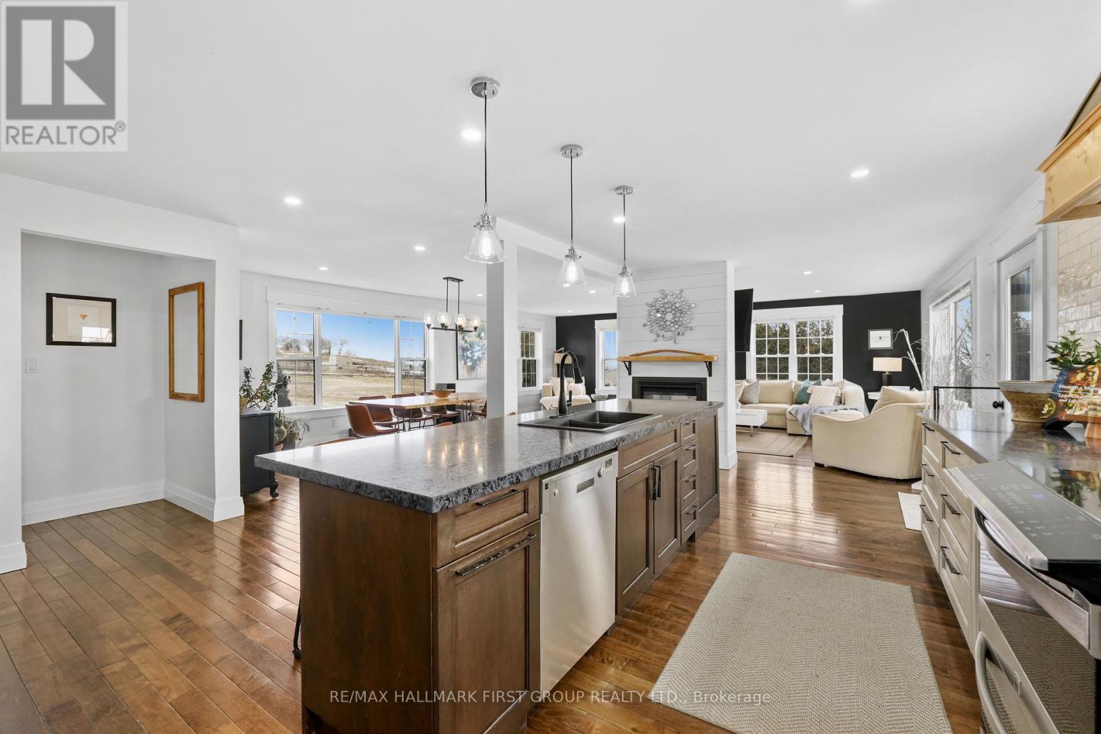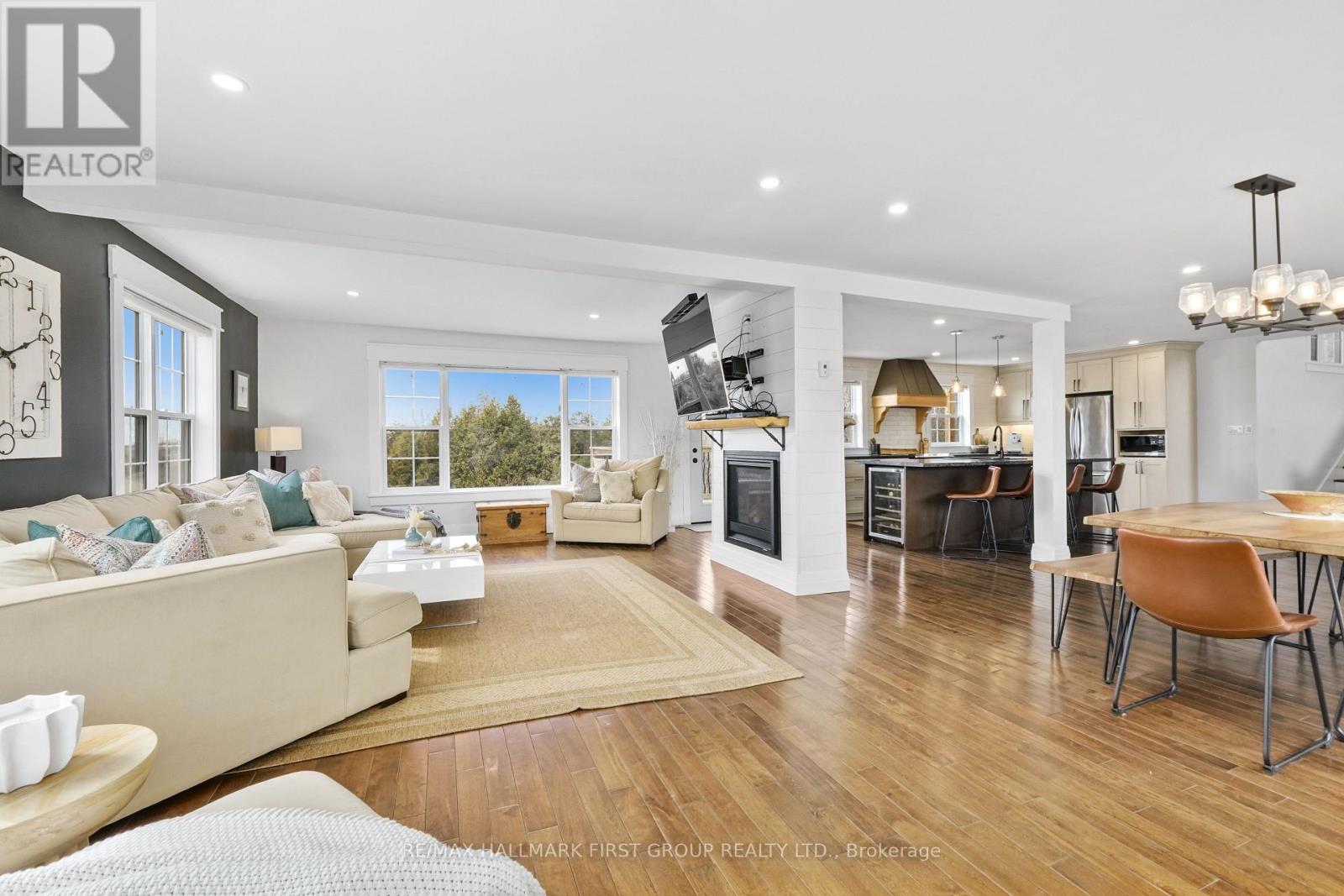 Set high on a scenic hilltop and surrounded by around 1.5 acres of Northumberland's rolling countryside, this impressive home offers space, privacy and breathtaking views in every direction. Thoughtfully designed to blend comfort with craftsmanship, the home welcomes you with an impressive foyer and soaring 19-foot ceilings that set the tone for the elegant yet relaxed living spaces beyond. At the heart of the home is a stunning open-concept kitchen, dining and living area-perfect for gathering, entertaining and everyday family life. The living room is anchored by a beautiful two-sided fireplace that creates warmth and atmosphere throughout the main living spaces. Large windows frame sweeping countryside and lake views while walk-outs from both the living room and the primary bedroom lead to the multi-level decks, seamlessly extending your living space outdoors. With five spacious bedrooms and four well-appointed bathrooms, this home offers room for growing families or multigenerational living. The private primary suite feels like a retreat of its own, complete with deck access and a luxurious spa-inspired ensuite featuring a freestanding soaker tub and its own two-sided fireplace-perfect for quiet evenings and slow mornings. The finished lower level adds even more flexibility with bright walk-out access to the patio, office, recreational area, additional bedroom and a further bathroom creating an ideal space for recreation, guests or a home gym. Surrounded by nature yet designed for modern living, this exceptional hilltop property captures the very best of rural Northumberland-space to breathe, views to savour and a home that feels refined yet warm and welcoming. (id:64974)