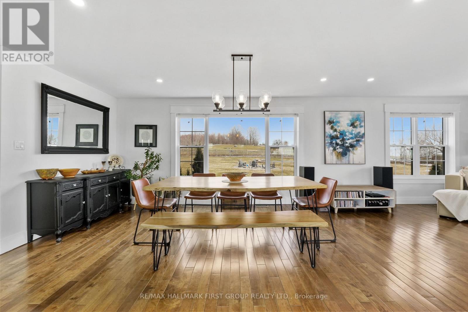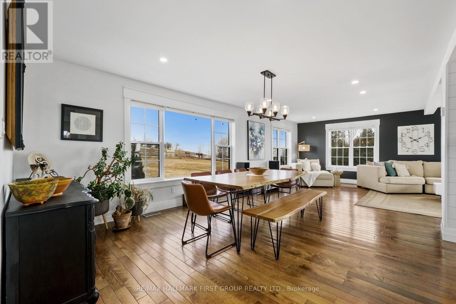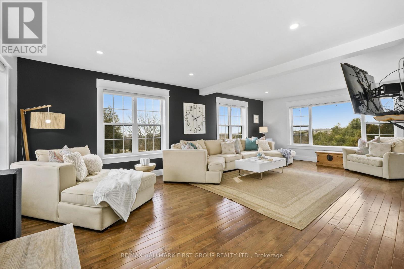 Set high on a scenic hilltop and surrounded by around 1.5 acres of Northumberland's rolling countryside, this impressive home offers space, privacy and breathtaking views in every direction. Thoughtfully designed to blend comfort with craftsmanship, the home welcomes you with an impressive foyer and soaring 19-foot ceilings that set the tone for the elegant yet relaxed living spaces beyond. At the heart of the home is a stunning open-concept kitchen, dining and living area-perfect for gathering, entertaining and everyday family life. The living room is anchored by a beautiful two-sided fireplace that creates warmth and atmosphere throughout the main living spaces. Large windows frame sweeping countryside and lake views while walk-outs from both the living room and the primary bedroom lead to the multi-level decks, seamlessly extending your living space outdoors. With five spacious bedrooms and four well-appointed bathrooms, this home offers room for growing families or multigenerational living. The private primary suite feels like a retreat of its own, complete with deck access and a luxurious spa-inspired ensuite featuring a freestanding soaker tub and its own two-sided fireplace-perfect for quiet evenings and slow mornings. The finished lower level adds even more flexibility with bright walk-out access to the patio, office, recreational area, additional bedroom and a further bathroom creating an ideal space for recreation, guests or a home gym. Surrounded by nature yet designed for modern living, this exceptional hilltop property captures the very best of rural Northumberland-space to breathe, views to savour and a home that feels refined yet warm and welcoming. (id:64974)