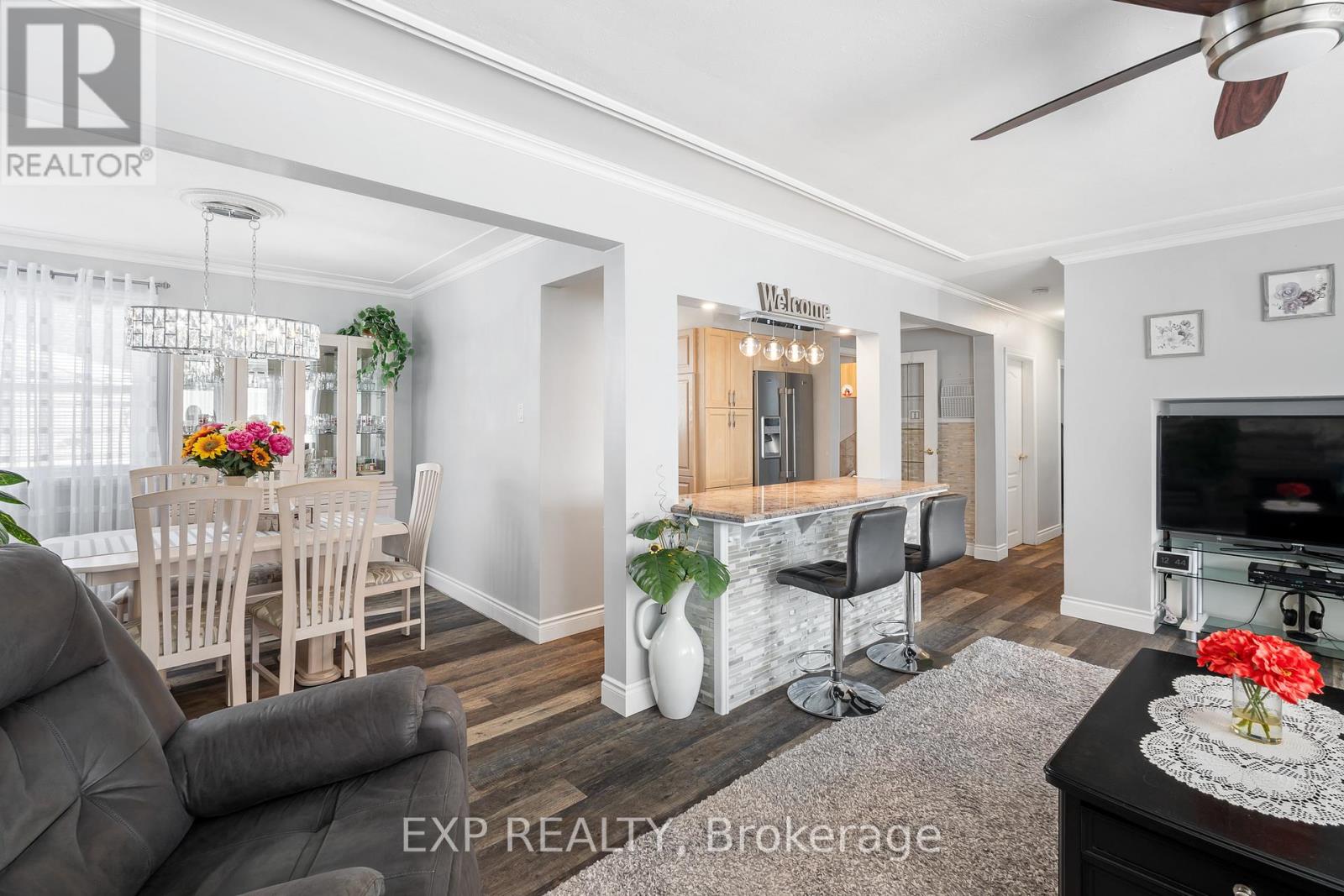 Pride of ownership shines in this beautiful bungalow. Tucked away on a quiet street, this versatile home features 3+2 bedrooms, 2 full bathrooms, and two separate kitchen areas - ideal for extended family or multi-generational living. The main level offers a bright welcoming living room complete with a natural gas fireplace. The kitchen is tastefully updated with granite countertops and matching backsplash. Downstairs, the finished lower level includes a private entrance to a self-contained 2-bedroom suite with its own kitchen, 4-piece bath, and laundry area. The property is equipped with 240-amp electrical service and an owned hot water heater. Outside, enjoy a stunning landscaped space featuring a large covered front porch, gazebo, two storage sheds, and a partially fenced 302-foot deep yard offering plenty of room to relax or entertain. The paved stone driveway fits up to six vehicles and is complemented by an attached double garage plus a detached single garage - perfect for extra storage, hobbies, or parking. Close to schools, parks, shopping, and everyday amenities, this well-maintained home offers space, flexibility, and long-term value in a peaceful setting. (id:64974)