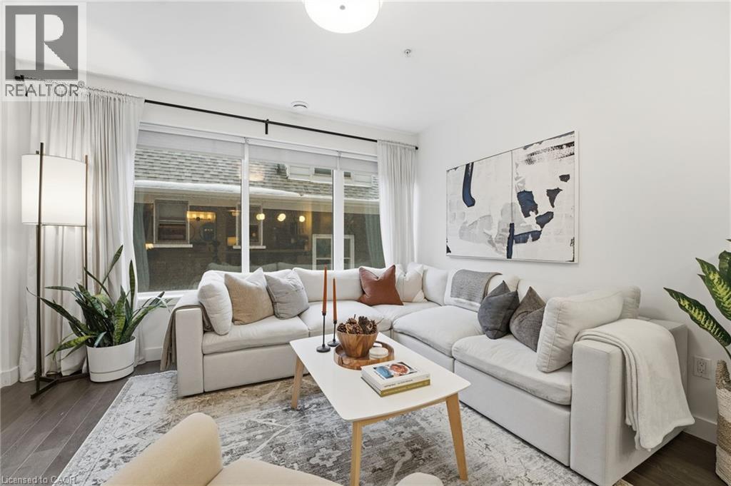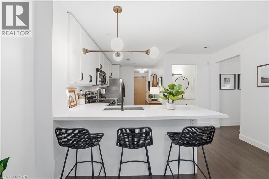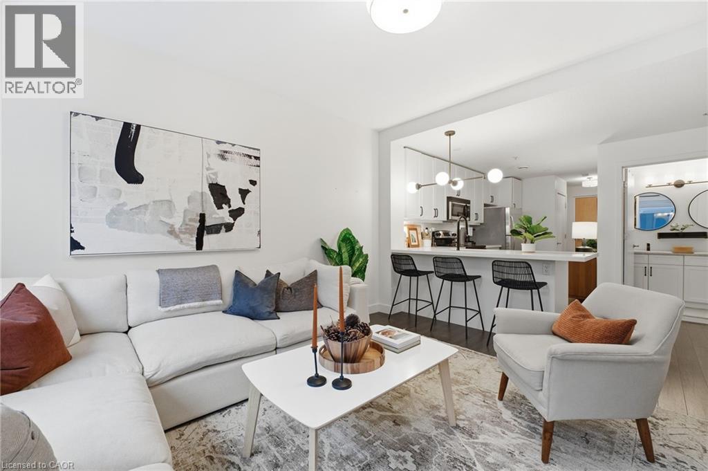 Discover the perfect blend of modern sophistication and boutique charm in this oversized 1-bed plus den suite at 188 King St. S. Situated in one of Uptown Waterloo’s most sought-after mid-rise buildings, Unit 210 offers a refreshing alternative to high-density living. This home is designed for those who value space and quiet, featuring a layout optimized for both daily comfort and effortless entertaining. The heart of the home is a stylish, updated kitchen boasting crisp white cabinetry, a functional breakfast bar, and stainless appliances. Natural light pours through the living area, highlighting the contemporary finishes. The primary bedroom is a true standout, offering more square footage than standard condo layouts and a walk-in closet. For those working from home or hosting guests, the versatile den features a pocket door, providing instant privacy without sacrificing floor space. The bathroom serves as a spa-like retreat with a double vanity and sleek fixtures. Life at The Red is defined by effortless access. This unit is uniquely positioned on the same floor as the building’s gym, amenity room, and your private storage locker, eliminating the need for elevators during your daily routine. Parking is equally convenient in the above-ground garage, featuring EV charging access. Step outside and immerse yourself in the vibrant energy of Uptown Waterloo. You are within a 5-minute walk of Vincenzo’s, Mary-Allen Park, and the shops and restaurants Uptown. Also with the LRT stop directly at your doorstep, the entire region is accessible in minutes. Enjoy the peace of a quiet, well-insulated building with the luxury of being steps away from dining, summer pop-up markets, local events, and boutique shopping. Experience the quiet community feel of a mid-rise building with all the perks of a luxury urban residence. Most furnishings can also be included, making this a great option for someone looking for a fresh start. Schedule your private viewing today. (id:64974)