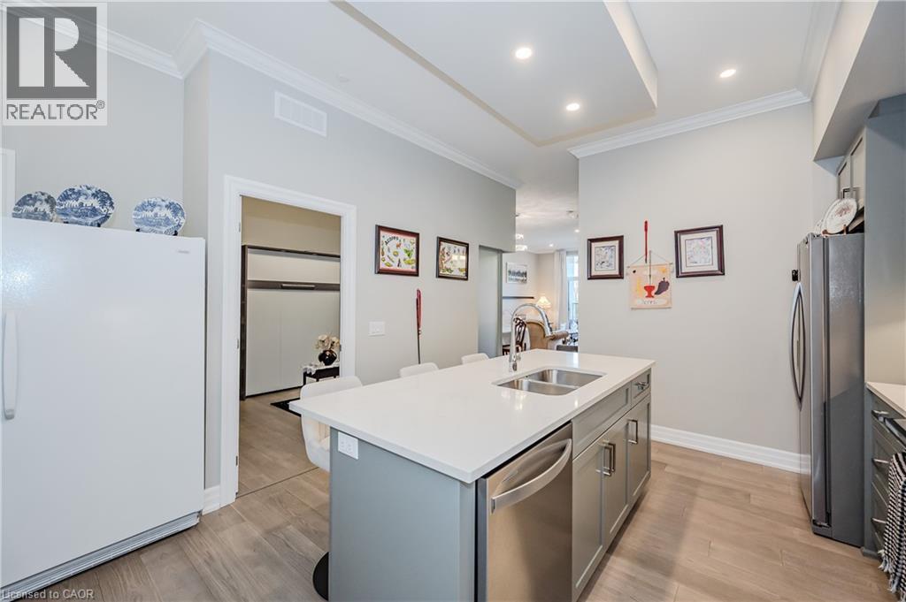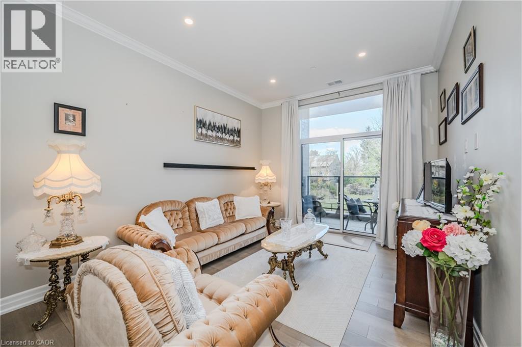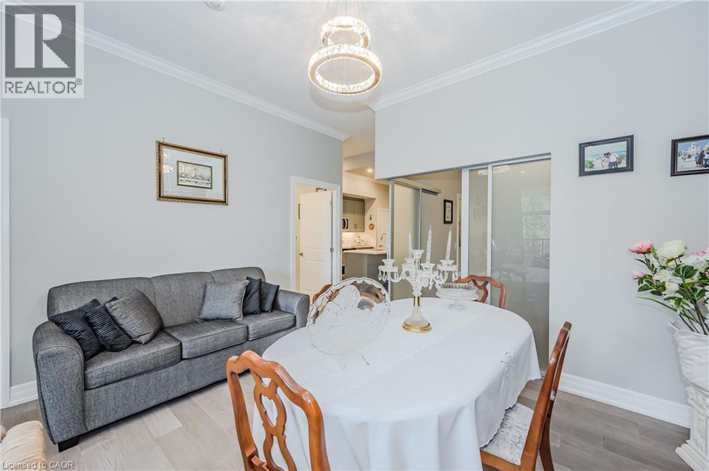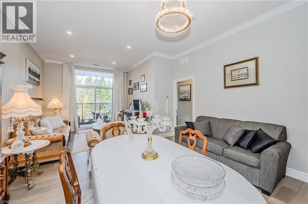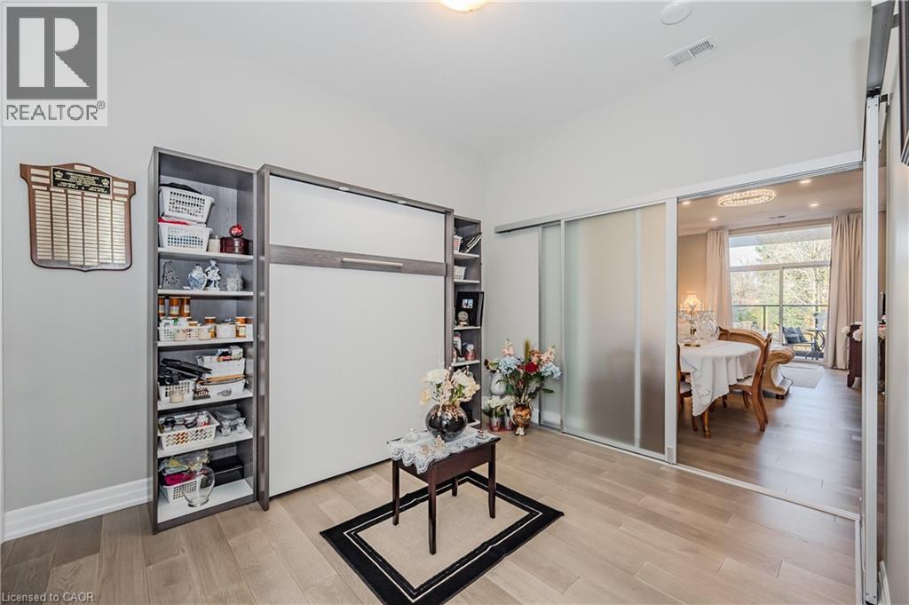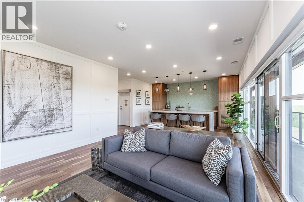 Make this gorgeous ground-floor condo located in the prestigious south end of Guelph yours. Professionally designed 2-bedroom, 2-bathroom suite with luxurious upgrades and TWO underground parking spaces. The 10' ceilings bring in more natural light and make the open-concept floor plan feel very spacious. With stunning finishes and a great layout, spending time at home will feel relaxing and joyful. The modern kitchen has plenty of cabinets, numerous drawers and a walk-in pantry for additional storage. Undermount lighting, built-in stainless steel appliances, a stylish backsplash, and a large island complete the kitchen. The broad dining area overlooks the living room. The charming living room with large sliding doors leads to a private balcony. Enjoy a morning coffee or afternoon tea in your secluded outdoor space. The large primary bedroom has a walk-in closet and a luxurious ensuite bathroom with a floor-to-ceiling glass shower and heated flooring. With glass sliding doors that open up to the living/dining room, you will be pleased with the functionality of a second bedroom. With a Murphy bed already installed, it can be used as an office and/or a bedroom. The main 4-piece bath with heated floors and in-suite laundry completes this suite. Quartz counters and hardwood flooring throughout, crown molding, and pot lights are a bonus. This building has so many amazing amenities to offer. With an HD golf simulator, a very well-equipped gym, a guest suite, bicycle storage, and a gorgeous 14th-floor resident lounge with a separate bar area, games room, and a balcony with panoramic views and a great scenery. If you are expecting more guests, you can also book the building's guest suite. Located in Guelph's desirable south end, this beautiful condo is just steps away from prime shopping, restaurants, banks, and cinema. Easy access to HWY 401 and on a bus route to UoG. (id:64974)