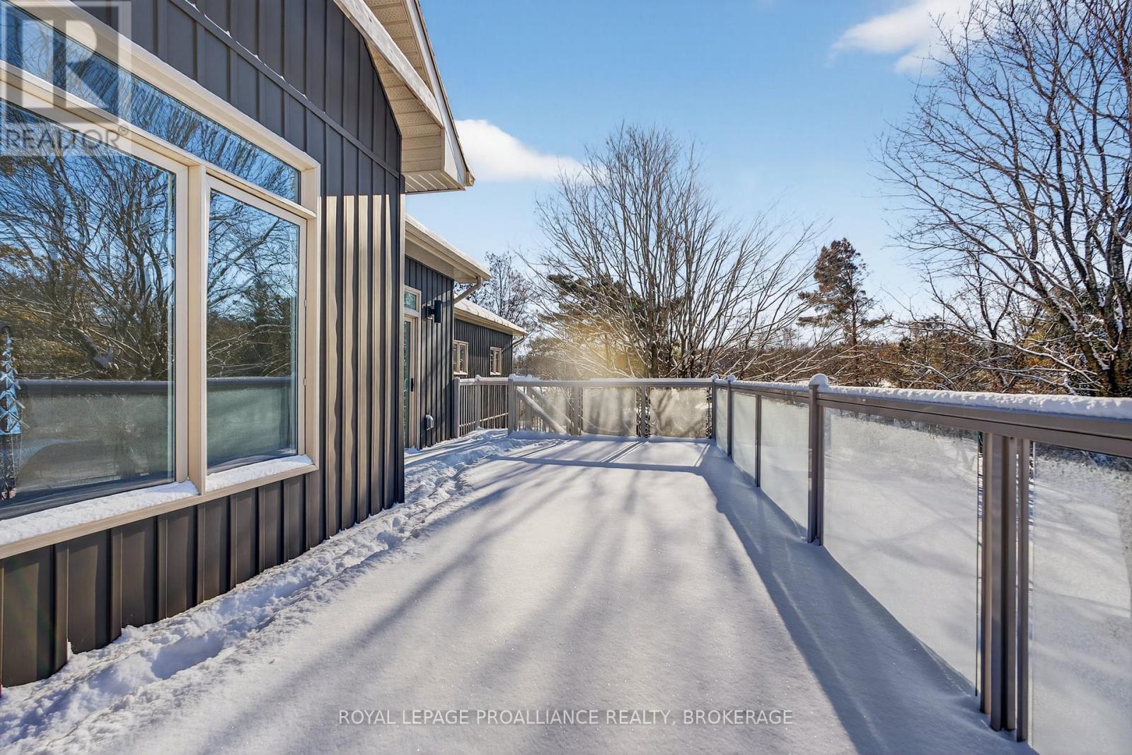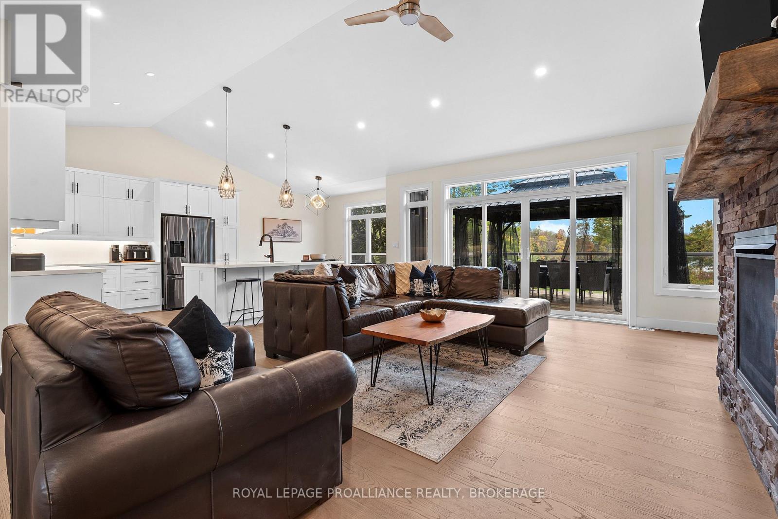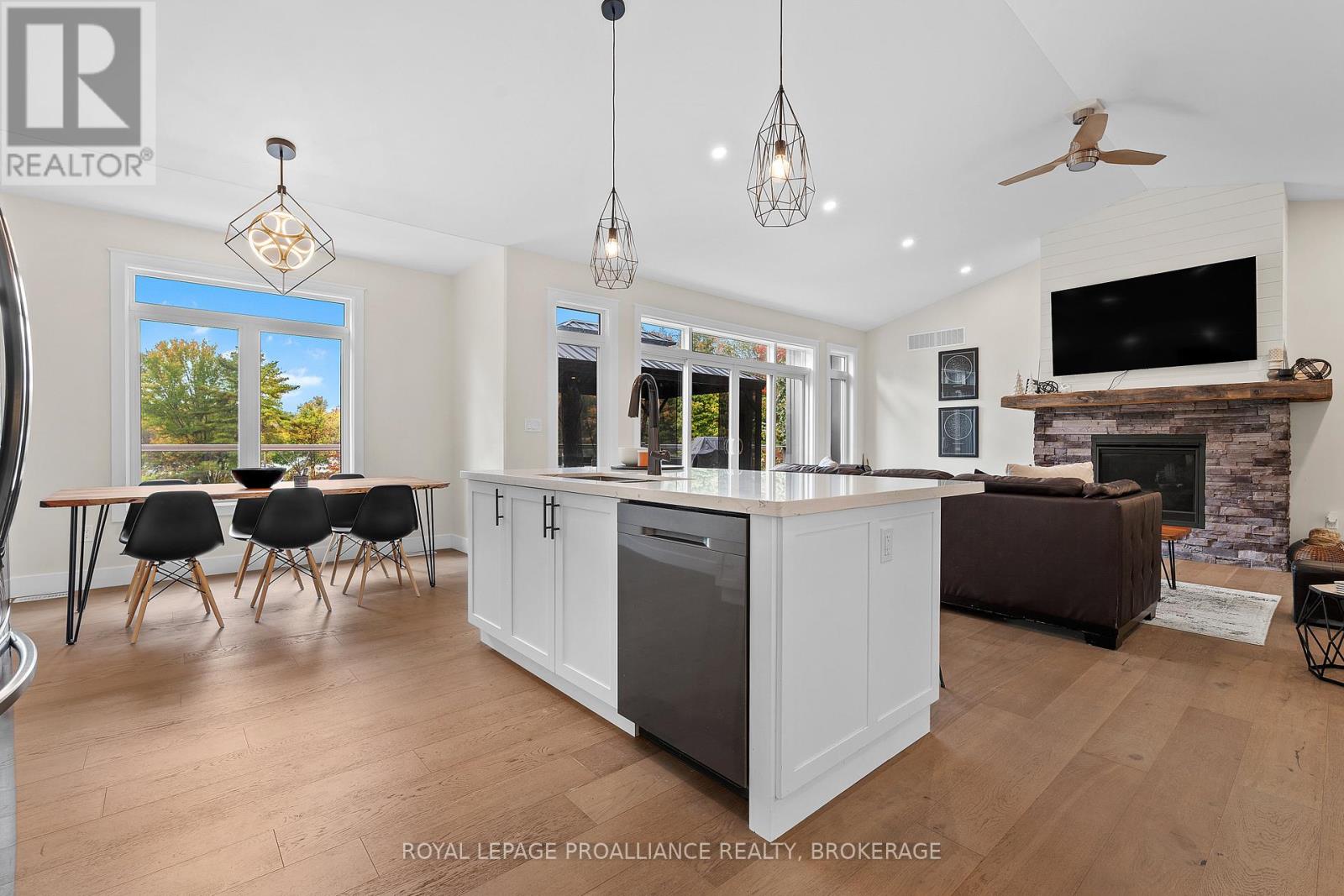 Discover lakeside living at its best with this stunning custom-built bungalow, offering over 2,000 sq. ft. of main floor living space and nearly 60' of shoreline on Dog Lake. Crafted with both quality and comfort in mind, this home features an ICF foundation, soaring 10' ceilings, a vast partially finished walk-out lower level, and engineered hardwood & tile flooring throughout. The open concept impresses, with the bright kitchen featuring quartz countertops, premium cabinetry and large separate dining area open to the spacious living room - highlighted by a gas fireplace and 12-foot patio doors leading to a 650 sq. ft. deck with glass and aluminum railings providing breathtaking panoramic views of the area. The primary suite is tucked away at one end of the home offering privacy, and finished with cove ceilings and a spa inspired 5-piece ensuite with glass-enclosed shower and soaker tub. Two other bedrooms and a full bath are also here on the main level. The walk-out lower level provides extra flex space and finds in-floor heating roughed-in, and the attached SIX-car garage with epoxy flooring is incredible. This one is a beauty - with wonderful curb appeal from the stamped concrete front porch all the way around the yard space right to the waterfront with a new floating dock. Packed with upgrades and with high end finishes throughout, this one should not be missed. Survey, floor plans and supporting documents are available upon request. (id:64974)