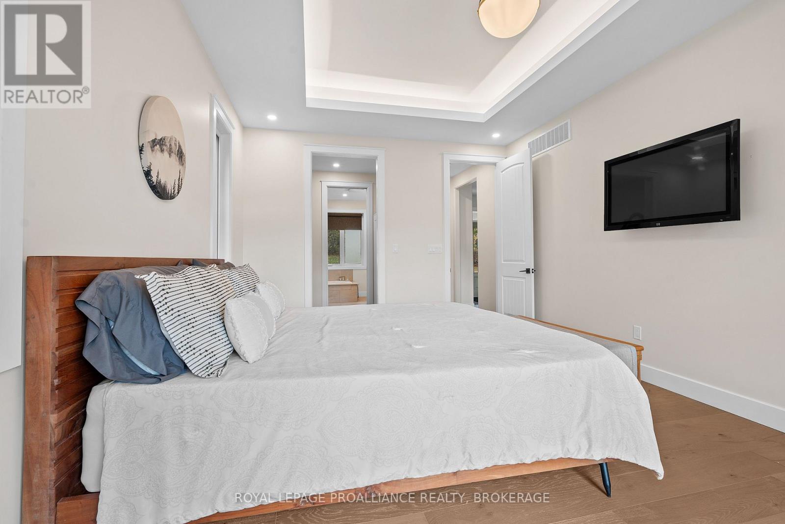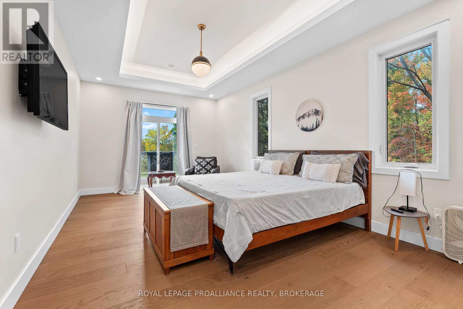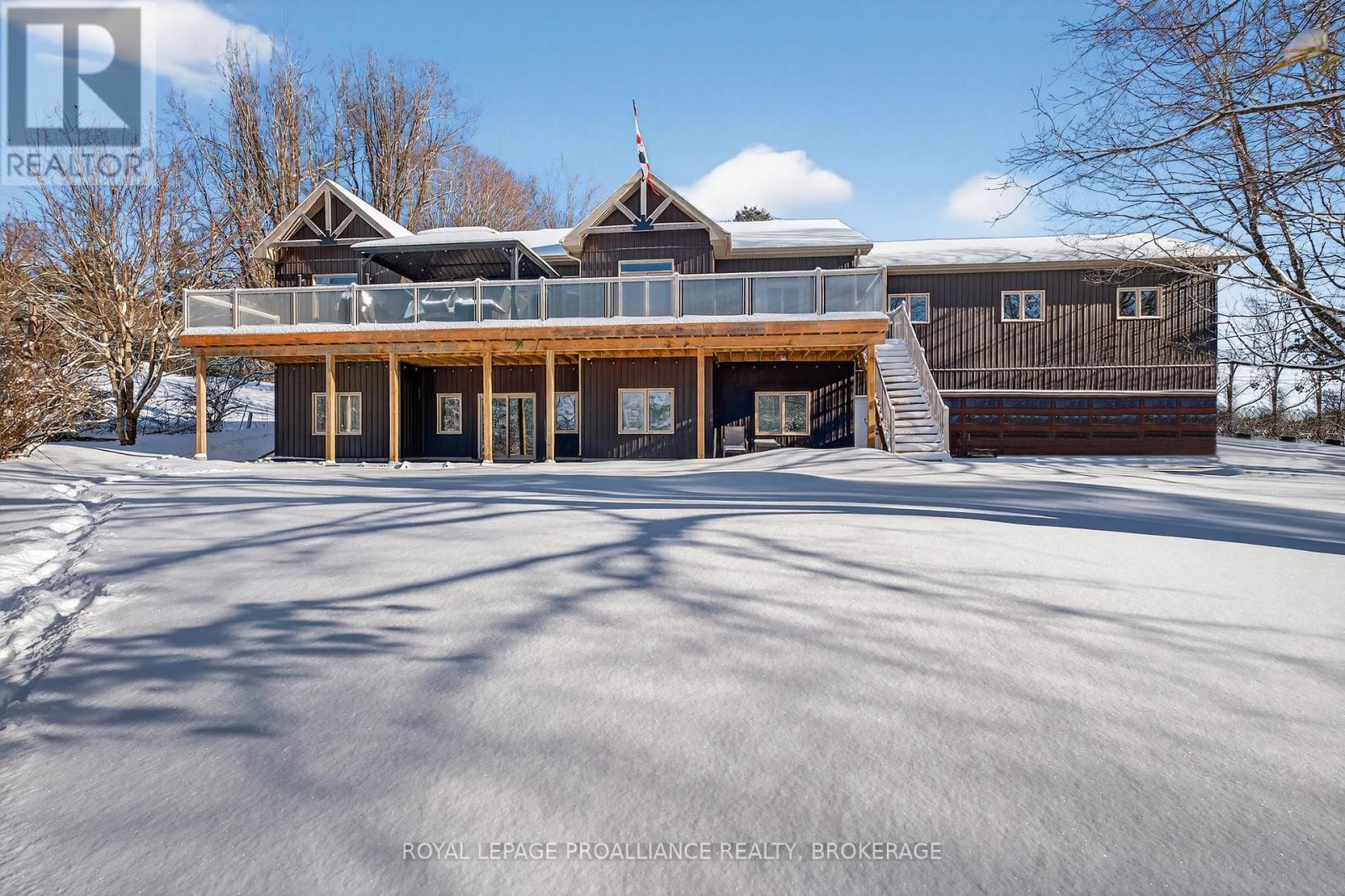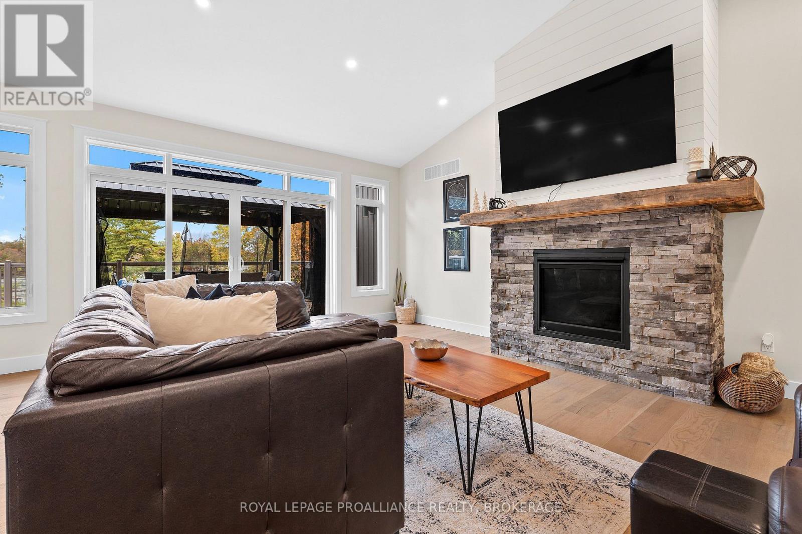 Discover lakeside living at its best with this stunning custom-built bungalow, offering over 2,000 sq. ft. of main floor living space and nearly 60' of shoreline on Dog Lake. Crafted with both quality and comfort in mind, this home features an ICF foundation, soaring 10' ceilings, a vast partially finished walk-out lower level, and engineered hardwood & tile flooring throughout. The open concept impresses, with the bright kitchen featuring quartz countertops, premium cabinetry and large separate dining area open to the spacious living room - highlighted by a gas fireplace and 12-foot patio doors leading to a 650 sq. ft. deck with glass and aluminum railings providing breathtaking panoramic views of the area. The primary suite is tucked away at one end of the home offering privacy, and finished with cove ceilings and a spa inspired 5-piece ensuite with glass-enclosed shower and soaker tub. Two other bedrooms and a full bath are also here on the main level. The walk-out lower level provides extra flex space and finds in-floor heating roughed-in, and the attached SIX-car garage with epoxy flooring is incredible. This one is a beauty - with wonderful curb appeal from the stamped concrete front porch all the way around the yard space right to the waterfront with a new floating dock. Packed with upgrades and with high end finishes throughout, this one should not be missed. Survey, floor plans and supporting documents are available upon request. (id:64974)