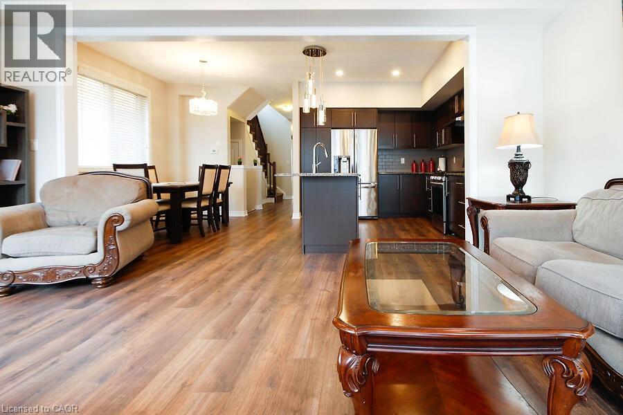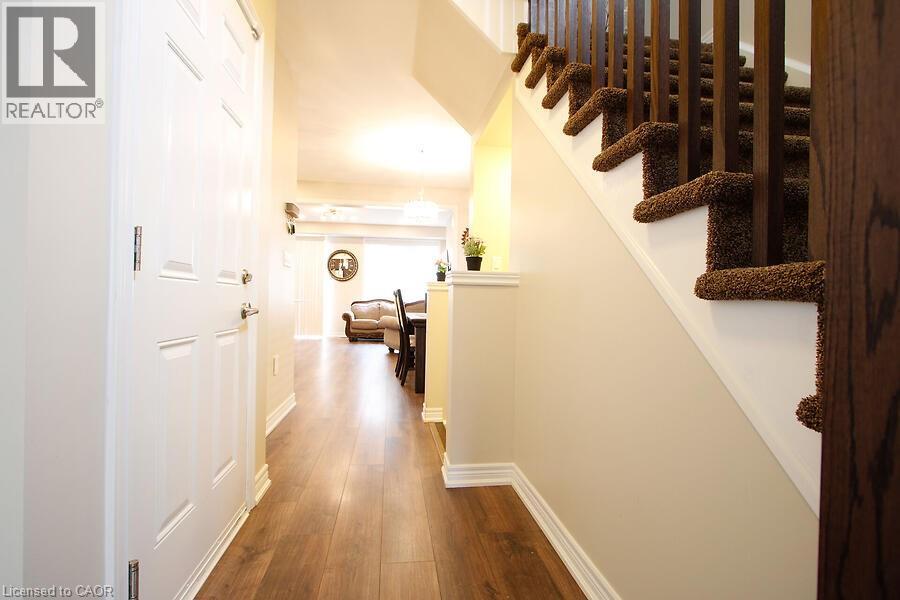 Absolutely Stunning End Unit Freehold Townhome in Sought-After Stoney Creek Mountain! This beautifully upgraded Branthaven 2-storey townhome offers 1830 sq ft - the largest floor plan in the complex and is ideally located in a quiet, private block at the back of the development. Just steps from top-rated schools, parks, the 193-acre Eramosa Karst Conservation Area, SmartCentres, restaurants, and with quick access to The Link, Red Hill Parkway, and the QEW. The home features 3 spacious bedrooms, 2.5 bathrooms, and a bright open-concept main floor with 9-ft ceilings, upgraded cabinetry, a large island, granite countertops and tiled backsplash. A generous family room with a gas fireplace overlooking the kitchen and dining areas, potlights, smooth ceilings throughout and laminate flooring on the main level - perfect for everyday living and entertaining. Convenient inside access to the garage adds everyday practicality. Enjoy a private fenced backyard, offering plenty of space for outdoor entertaining or relaxing in your own private retreat. The large primary suite features a walk-in closet and a spa-inspired ensuite. Upper-level laundry adds extra convenience. Move-in-ready with all the upgrades done - just unpack and enjoy! (id:64974)