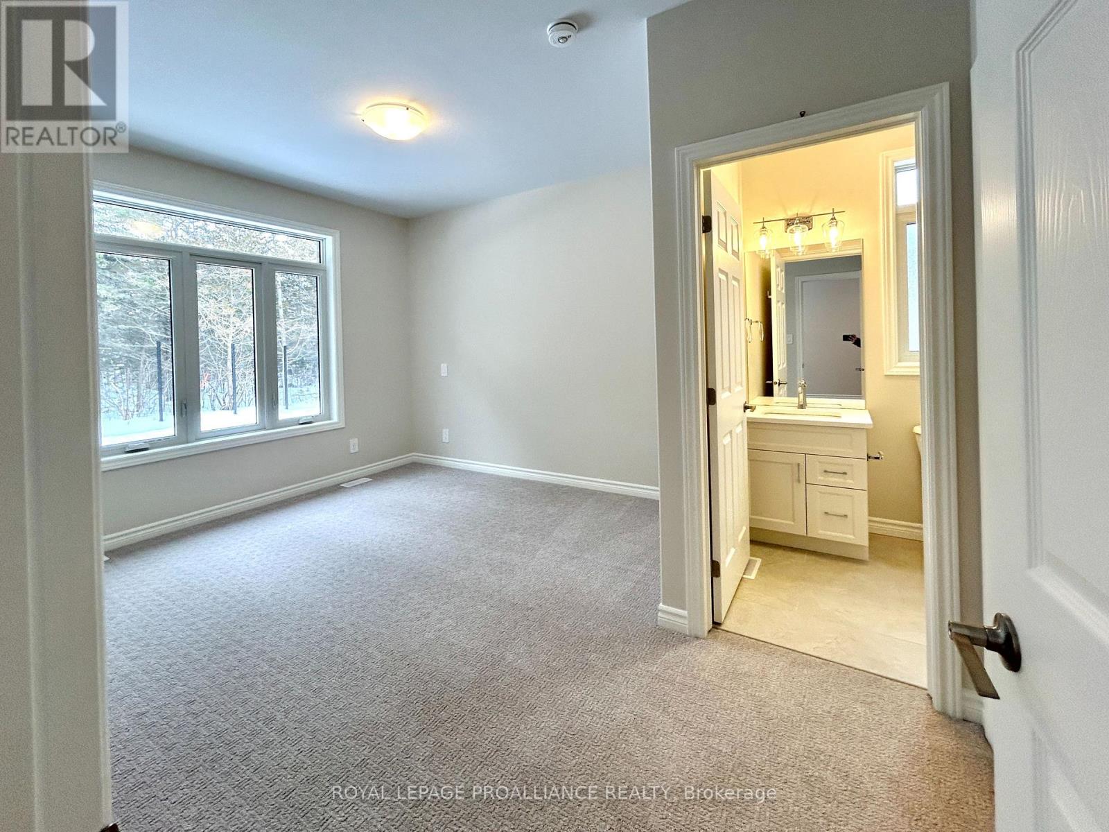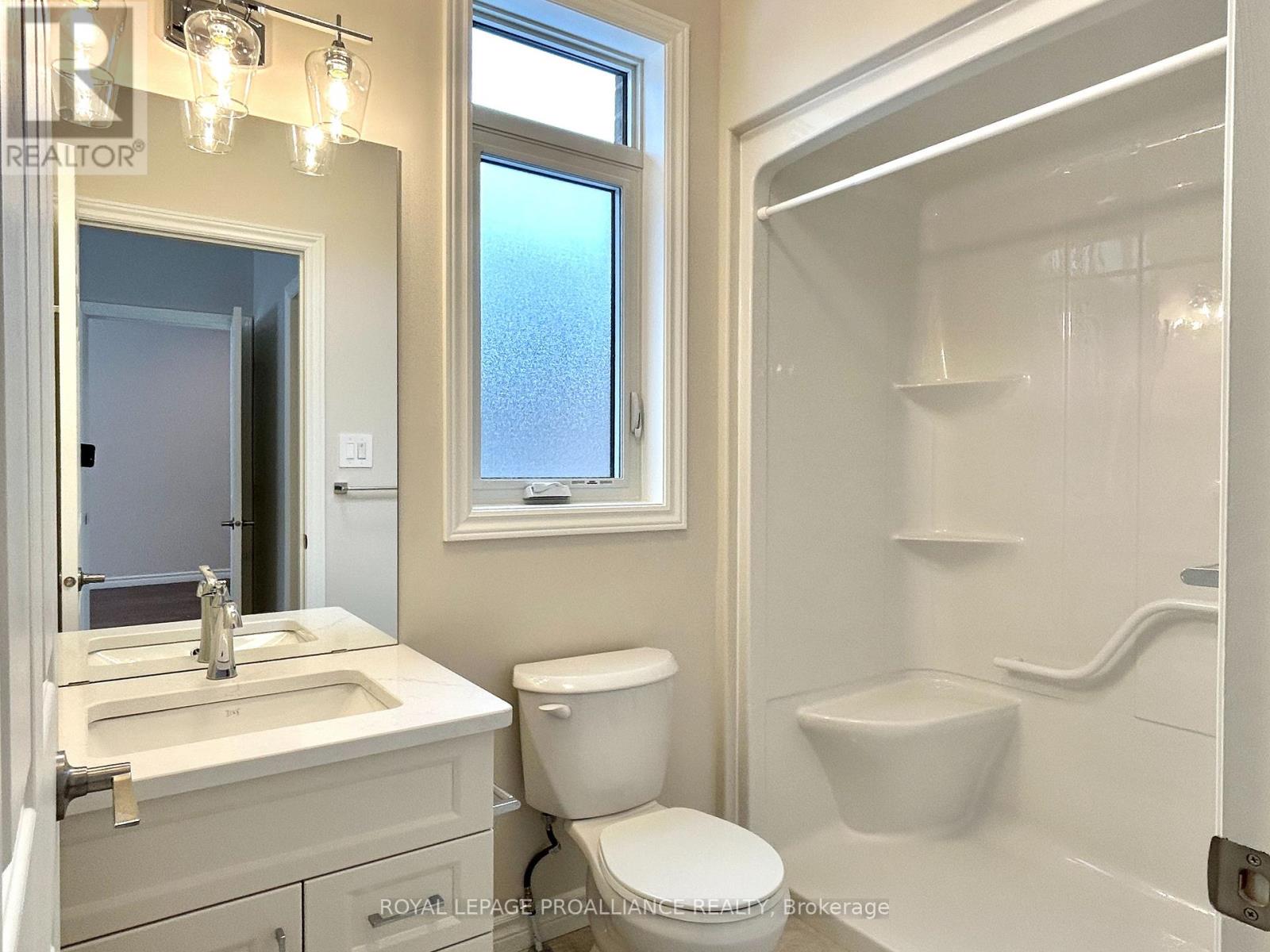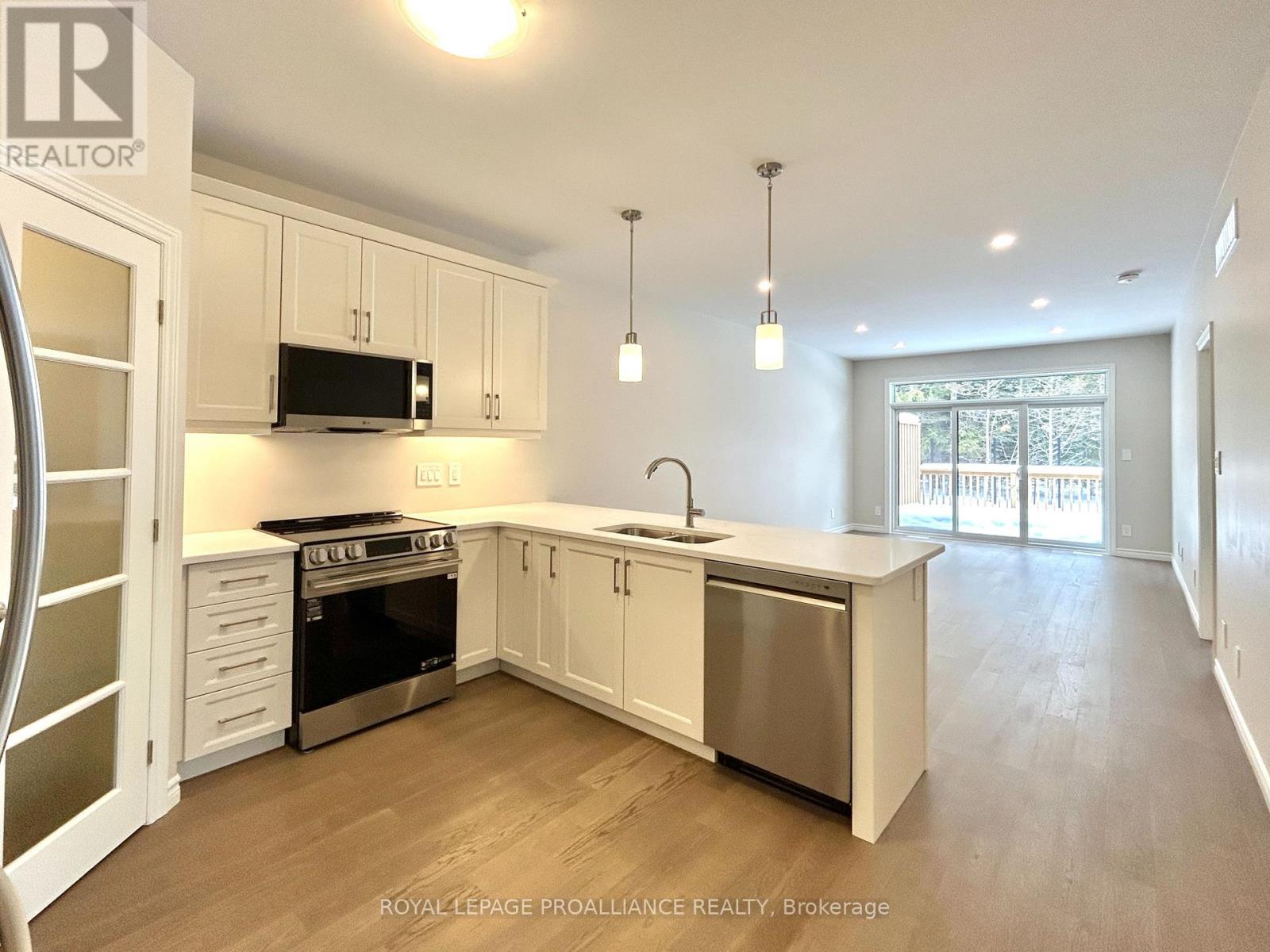 Welcome to Northgate Condominiums, a cozy community of townhome condominium units conveniently located just North of the 401 in Belleville, minutes from the Quinte Mall. This beautiful brand new end unit bungalow townhome features two bedrooms, two bathrooms and an attached two car garage with inside entry. The main floor is completed with 9ft ceilings and includes a well appointed kitchen with quartz countertops and corner pantry. The great room located just off the kitchen, looks out the 12' X 12' pressure treated wood deck. The bright primary bedroom includes a walk in closet as well as a 3-piece en-suite bathroom. The main floor is completed with an additional bedroom, main bathroom and a convenient laundry closet. This home also includes a full unspoiled basement with basement bathroom rough in. (id:64974)
