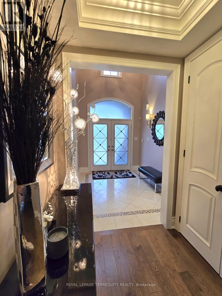 Welcome to this stunning former builder's model home in the highly sought-after Credit Ridge community, offering many upgrades for an exceptional blend of luxury, space, and thoughtful design. With soaring 10-ft ceilings on both the main and second floors, the home feels bright, open, and elegantly appointed throughout. A grand vaulted marble-tiled foyer creates an impressive first impression, complemented by rich hardwood flooring and refined architectural details across the main level. The private front office shares a striking two-way fireplace with the formal living room, creating a sophisticated space ideal for both working from home and relaxing. The formal dining room features a dramatic vaulted ceiling, providing an elegant setting for hosting family gatherings and entertaining guests. The well-designed kitchen offers ceramic tile flooring, generous cabinetry, and an open concept layout that seamlessly supports both everyday living and entertaining. The upper level features four spacious bedrooms and three full bathrooms, including a luxurious primary retreat complete with its own fireplace, two walk-in closets, and a beautifully appointed 5-piece ensuite featuring marble flooring. A valuable feature of this home is the rough-in for heated flooring throughout, including the basement, offering the opportunity to add ultimate comfort and luxury in the future. Additional highlights include convenient backyard access to the garage and a prime location close to parks, trails, excellent schools, shopping, transit, and major highways. (id:64974)