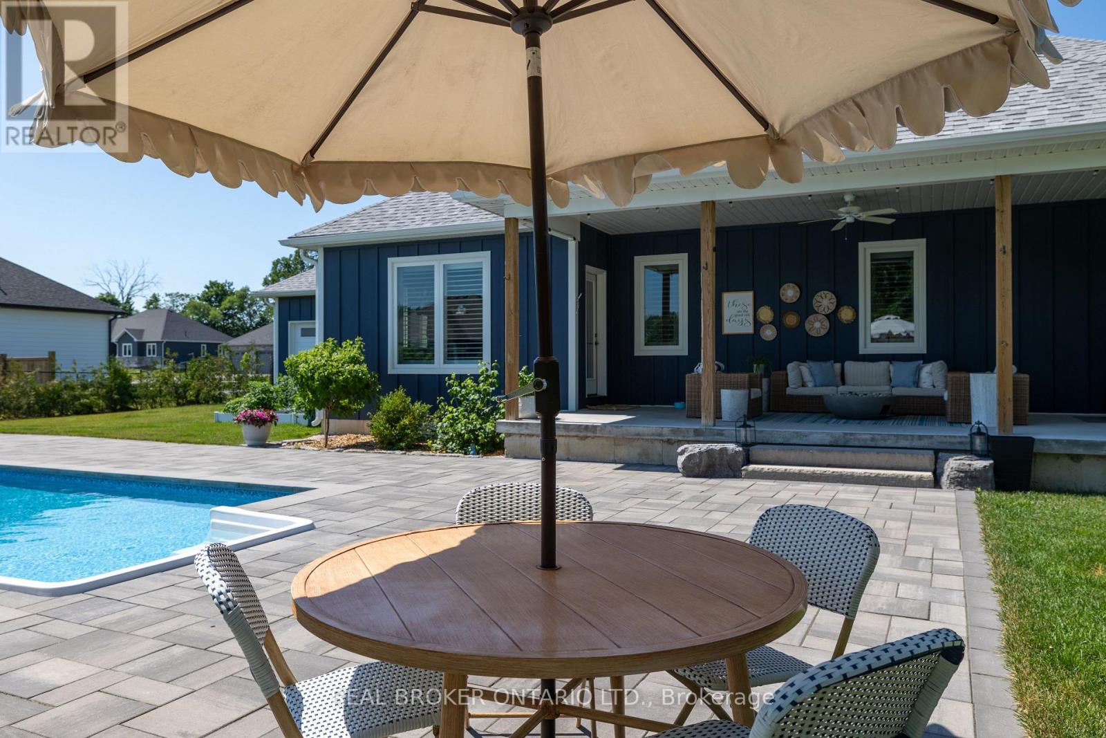 Welcome to 19 Cheslock Crescent. This 5 year old bungalow located in the Kayley Estates in the quaint and safe community of Warminster is situated on a half acre with mature trees, fully fenced, landscaped yard complete with irrigation, a newly paved driveway and interlock front walkway. The backyard features a 16x32 salt water pool surrounded by interlock with a brand new custom pool cabana/storage shed complete with electricity. The exterior of the home features cement Hardie Board wrapped around the entire home, a 3 car garage and a large back covered porch. Inside you will find an open concept floor plan with natural light filling each room, a gorgeous chefs kitchen with marble backsplash and loads of storage. Heated bathroom floors, a gas fireplace with custom mantle & millwork in the great room and mud/laundry room. Quartz counters throughout, custom closets in each bedroom, California shutters and much more. 10 minutes from all amenities in Orillia. Fantastic elementary and highschool districts and outdoor activities minutes away. No neighbourhood covenants. (id:64974)