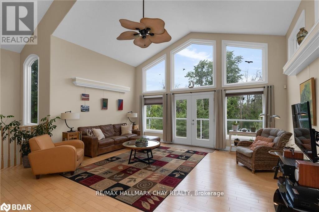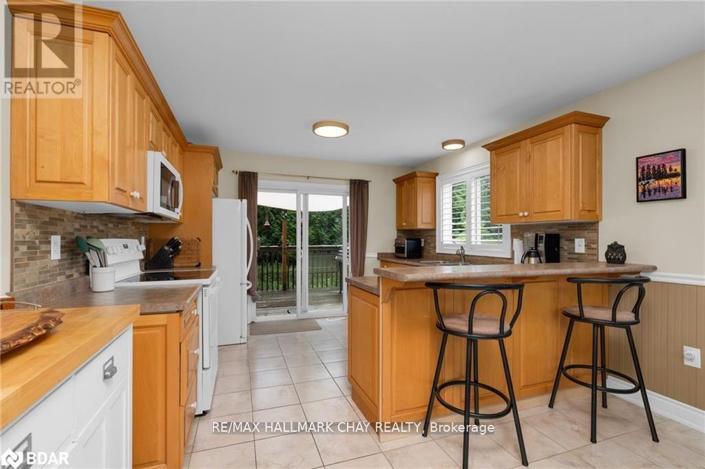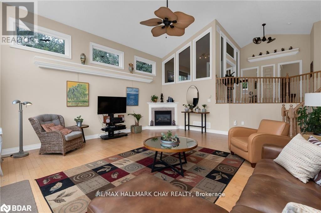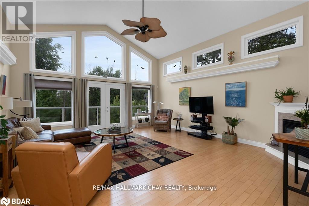 This home is located steps from Georgian Bay on a quiet street. This home is unqiue in design offering different levels of living space. Primary bedroom is on main floor with a walk out to a private deck. Primary also offers a 5 piece ensuite and walk in closet. The eat in kitchen is a spacious and has a walk out to deck over looking the private yard. This floor also offers a powder room. The next level offers a grand living area with cathedral ceilings, gas fireplace, walk out to a front deck. Wall of windows and some unique transom windows allow bright light into this inviting space. The top level offers an office space and 2 generous sized bedrooms with vaulted ceilings. 4 pc bathroom on the upper level. The double sized garage has inside entry to the house and has been segregated into a studio in one of the bays. Can easily be used as a garage space if needed. The basement is unfinished with very high ceiling and big windows offering yet again another bright living space. Used as storage but can easily be made into a bedroom and recreation room if needed for more space. This home is interesting and has a great beach house vibe. Would make a great home or recreation property. (id:64974)