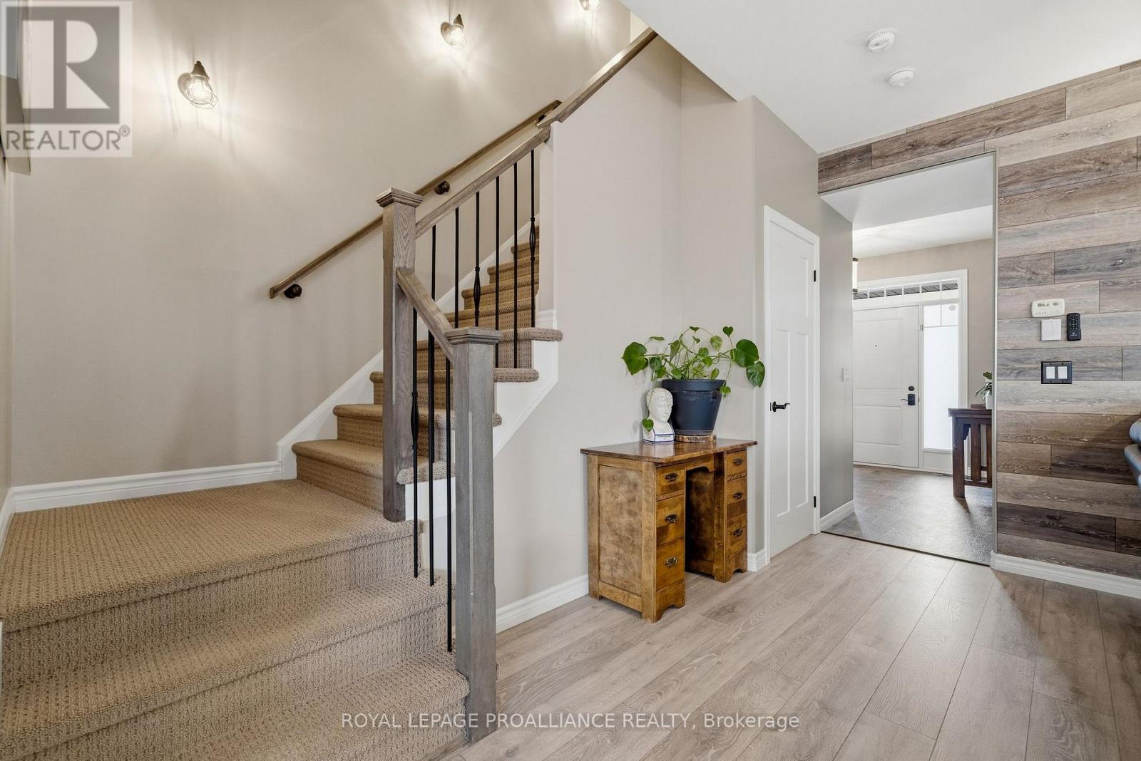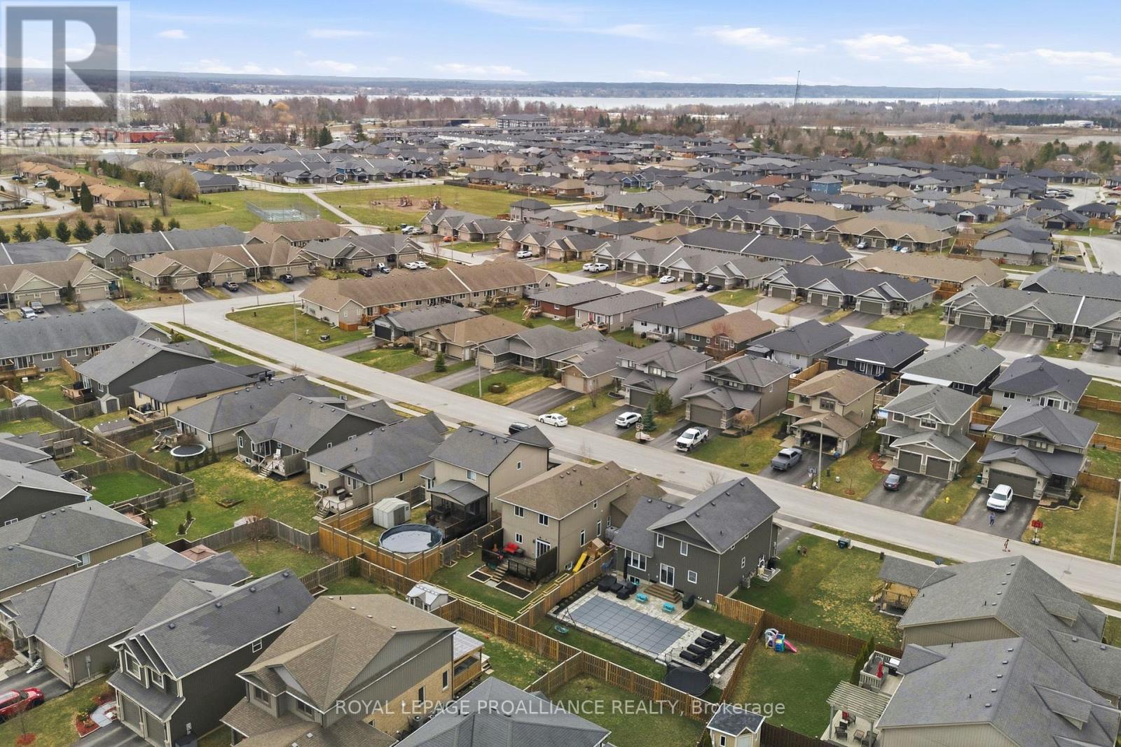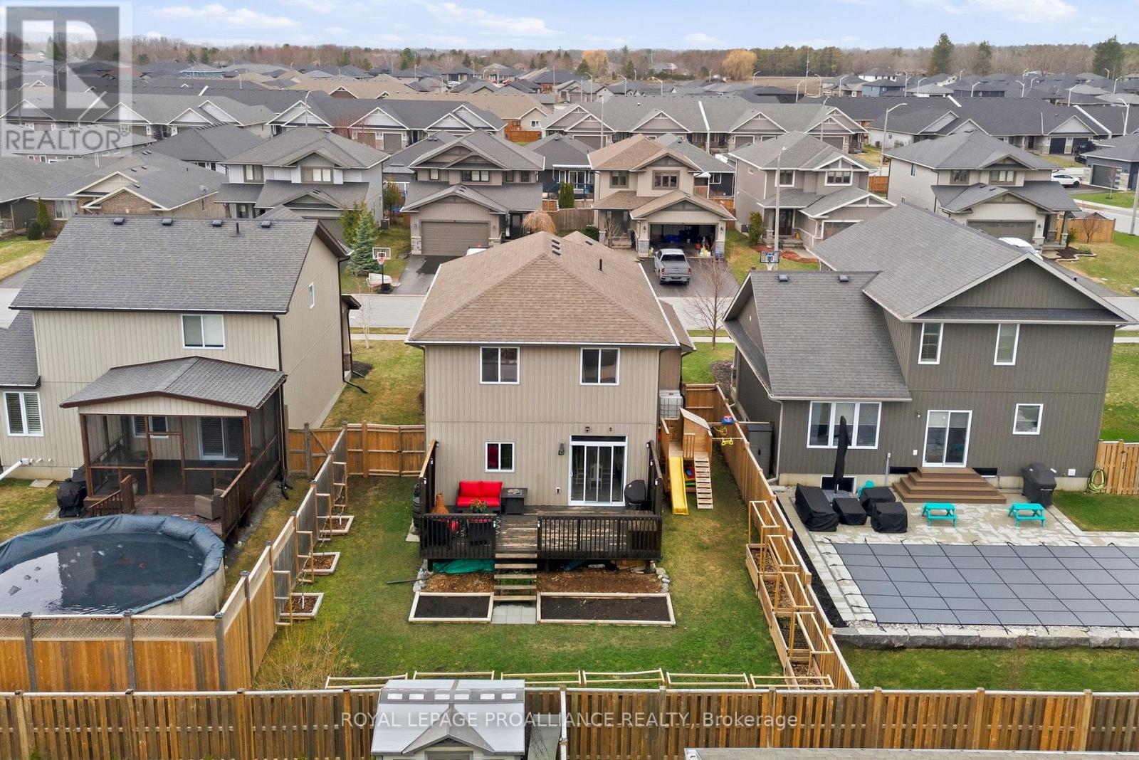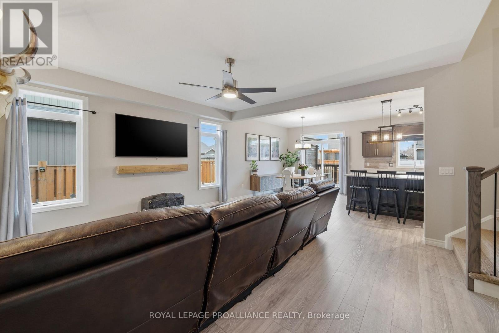 Built in 2015 & feels like new. 19 Granite Drive is ideally situated on an interior street, just two blocks from the park offering pickle ball & tennis court, children's play area + open fields to run. This spotless home, with over 2,000 sq feet of finished living space provides everything a family needs & more. Spacious foyer connects from the double garage as well, providing 2 closets & convenient 2 piece powder room. The main living area, quietly tucked to the rear grants 9' ceilings throughout this comfortable space. The impressive kitchen promotes ample cabinet storage & classy staggered upper cupboards upgrade with complimenting backsplash, reverse osmosis drinking water & detached island overlooking the living & dining area. The transom window features allows natural sunlight to filter in & up the stairs via the strategic custom wall opening. Upper level provides 3 great sized bedrooms, the primary with a massive walk-in closet & 3 piece ensuite offering a step in shower with bench seating. The function continues with a large 4 piece bath and dedicated laundry room complete with widow & laundry sink. The perks extend into the basement with freshly finished recreation & bonus room, currently enjoyed as a gym with two windows offering many future use options to suit your own needs. Enclosed rough-in bath area provides a 4th bathroom option and fabulous storage in the utility room, under stairs area + custom garage shelving. Amazing exterior grants a large deck with gas BBQ line & privacy feature overlooking the fenced in yard, surrounded by raised garden beds & convenient side gate access on each side. Enjoy the fun children's play structure & the fruit offerings from the honeycrisp apple, bartlett & bosc pear trees. Potter's Creek is a family friendly neighbourhood within great proximity to paved walking, biking & roller blading trails, popular schools, shopping, CFB Trenton & the beautiful Bay of Quinte. Open House:Sunday April 19, 11am-12:30pm (id:64974)