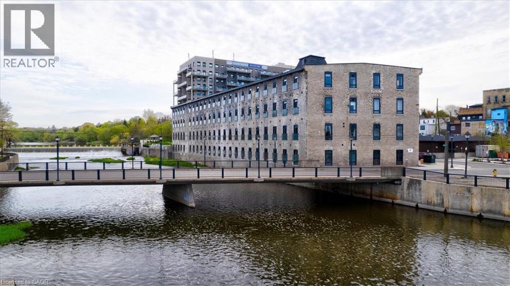 Welcome to Riverbank Lofts, one of Cambridge’s most iconic and architecturally rich residences where historic industrial character meets refined, modern luxury along the banks of the Speed River. Set within the landmark former American Standard factory, thoughtfully transformed in 2020, this boutique building offers a truly unique ownership opportunity in the heart of downtown Hespeler, just steps to charming cafés, restaurants, trails, and vibrant community life. This exceptional one-bedroom residence is defined by its dramatic scale and design. Soaring 12-foot ceilings and striking floor-to-ceiling windows create an airy, light-filled space, while exposed stone walls and reclaimed wood beams add warmth, texture, and unmistakable character rarely found in today’s market. The open concept living space is both elegant and functional, seamlessly connecting to a beautifully appointed kitchen featuring quartz countertops, stainless steel appliances, and an oversized island with breakfast bar ideal for entertaining or relaxed everyday living. Step out to your private balcony and take in the charm of downtown Hespeler, a perfect extension of your living space. The spacious bedroom offers a serene retreat, complete with a generous walk in closet, while in suite laundry and thoughtfully designed finishes throughout enhance comfort and convenience. Residents of Riverbank Lofts enjoy access to an impressive collection of amenities, including a fully equipped fitness centre, multiple designer lounges, bike storage, and a dedicated dog wash station curated to support a sophisticated, low maintenance lifestyle. Complete with a owned parking space and ideally located just minutes to Highway 401, this residence offers the perfect balance of tranquility, connectivity, and urban convenience. A rare opportunity to own a piece of Hespeler’s history reimagined for modern living. Private showings now available. (id:64974)