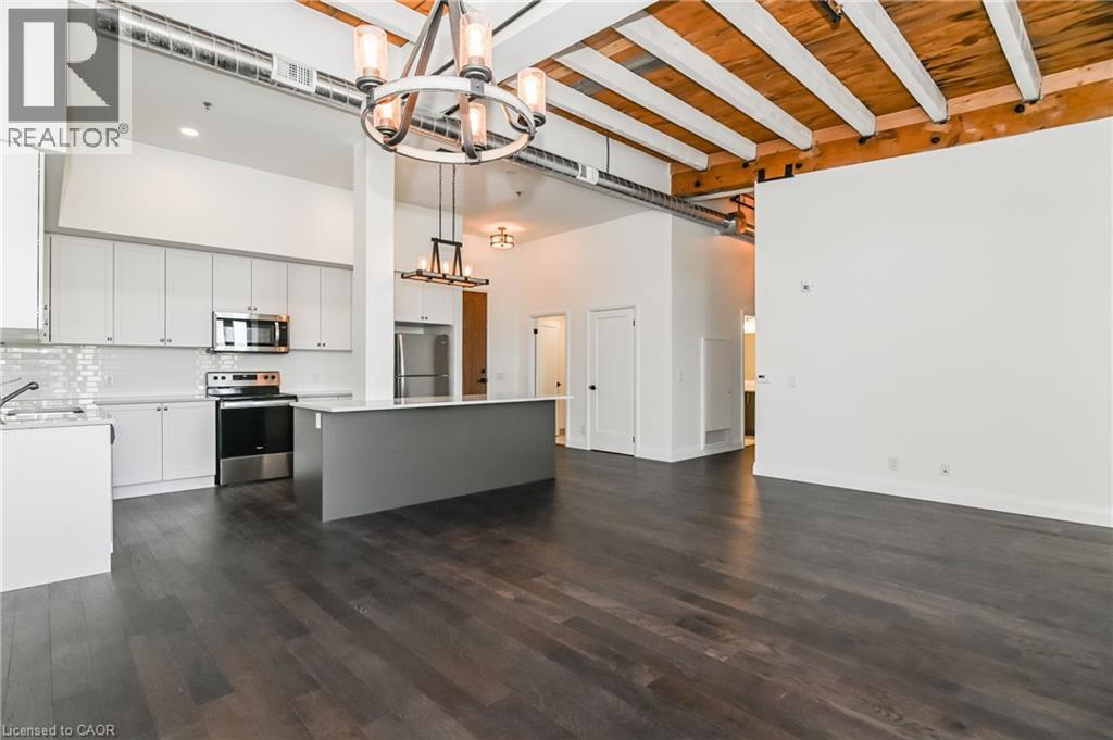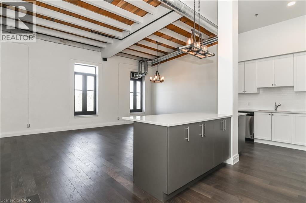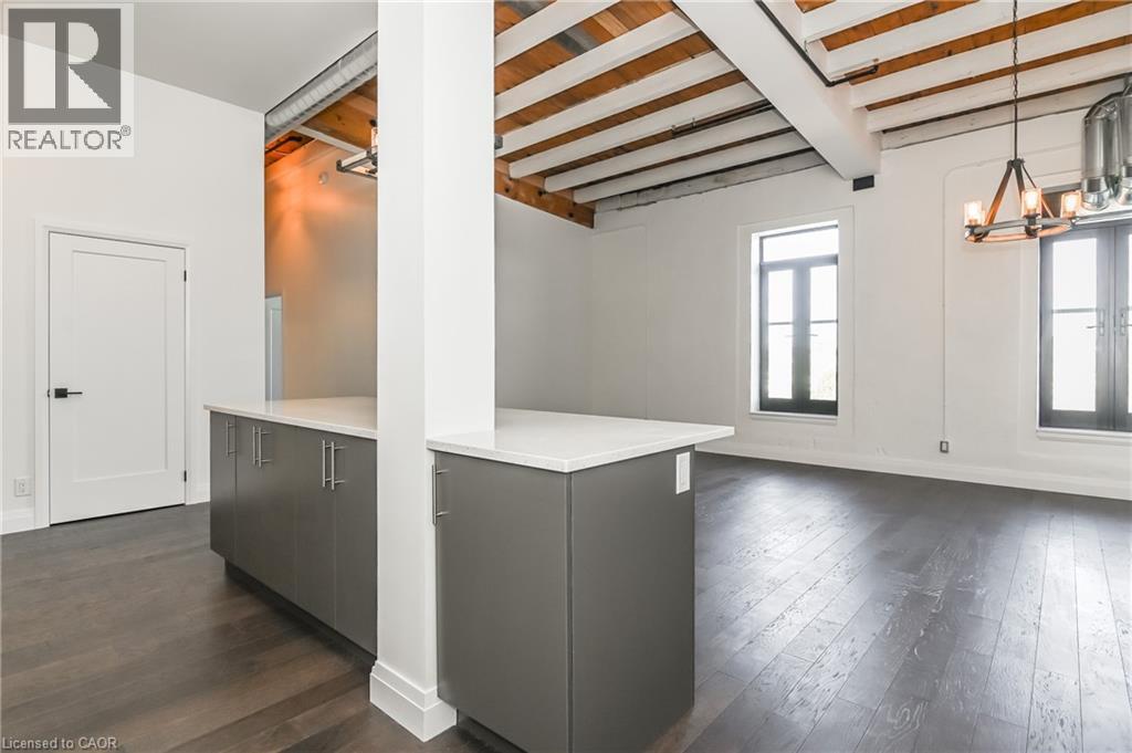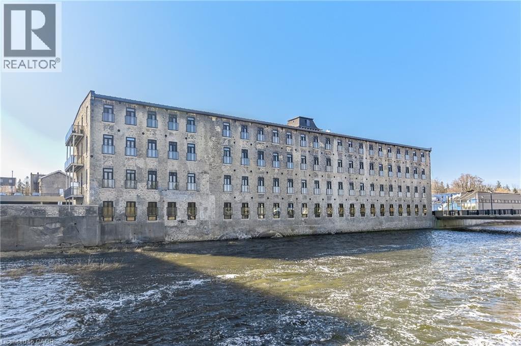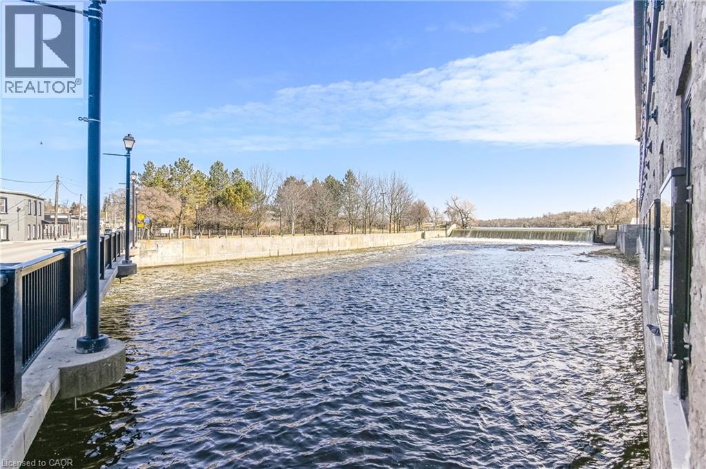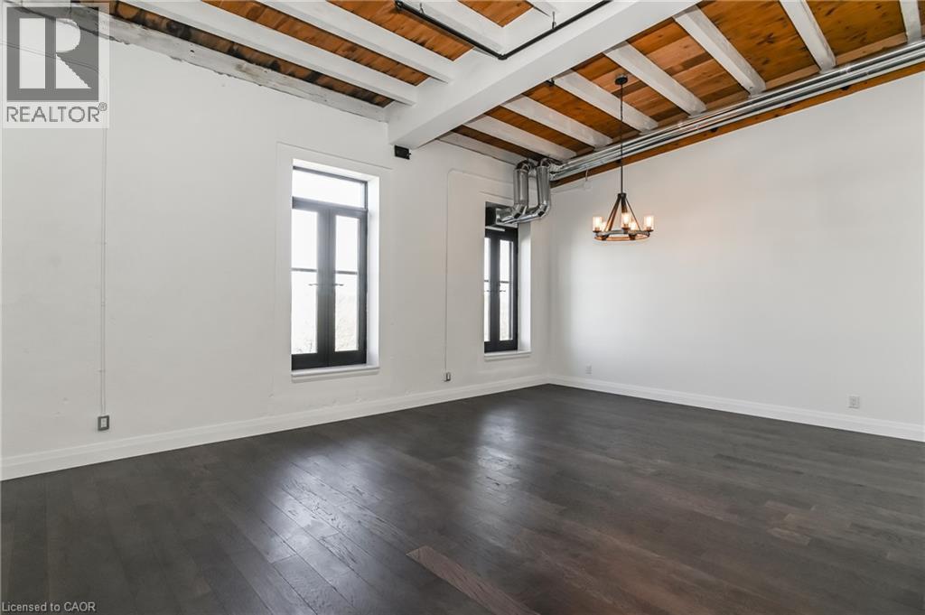 Rarely offered opportunity to lease a unit on the top floor in this luxury historic converted building in the heart of Hespeler Village. This nearly 1,300sqft 2 bed, 2 bath suite showcases original post and beam construction, soaring 15' ceilings, and plenty of windows with Juliette balconies which frame unobstructed views of the Speed River. Thoughtfully designed with a spacious, functional open concept layout and hardwood floors throughout. The modern kitchen featuring stainless steel appliances, quartz countertops and an oversized island with breakfast bar completes the center of this home. Accessibility-friendly with wider doorways, hallways and bathroom. The building was carefully crafted to appreciate the historic craftsmanship while infusing modern day finishes and amenities. This suite includes a very rare 2 car enclosed private garage. Enjoy the charm of this historic community- you're just steps away from downtown Hespeler and it's restaurants, boutique shops, cafes, library, long scenic trails and parks. Convenient access to HWY 401 and nearby amenities makes commuting effortless while still offering an elevated lifestyle yet peaceful setting to come home to. (id:64974)