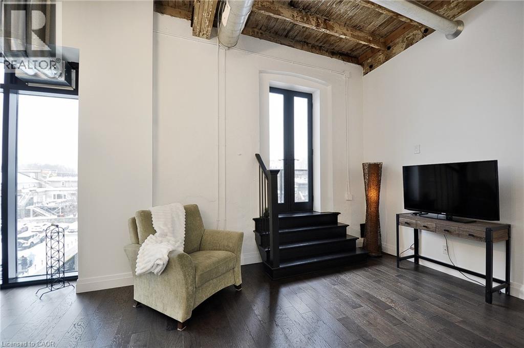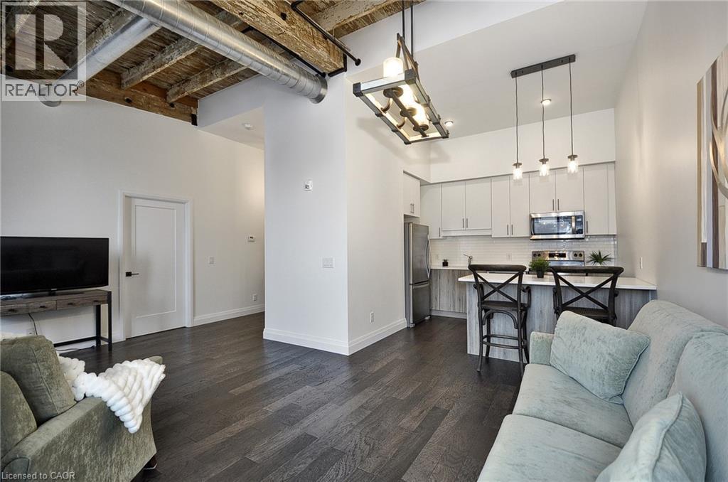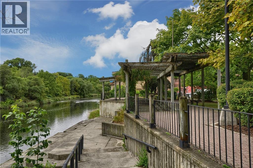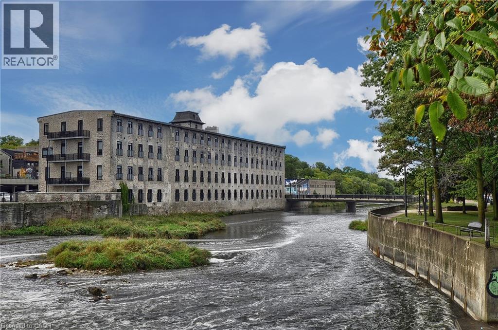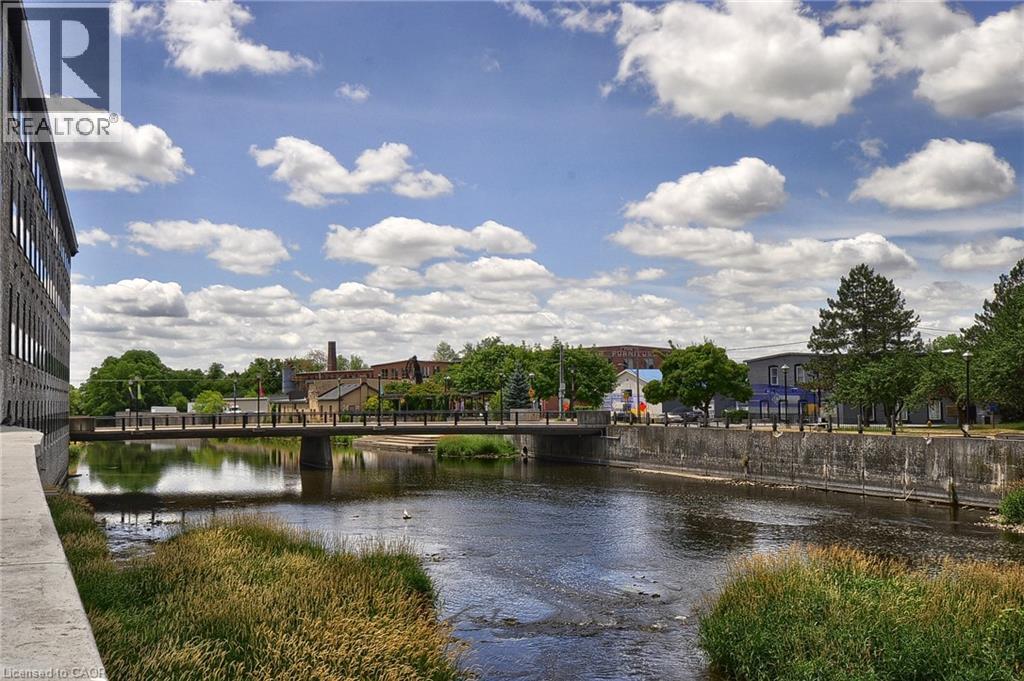 Experience boutique living at Riverbank Lofts, a landmark conversion in the heart of historic downtown Hespeler. This iconic riverside building blends heritage charm with modern sophistication along the banks of the Speed River. This bright one-bedroom condo features soaring ceilings, oversized windows, and exposed wood beams that highlight the building’s character. The open-concept living space flows into a contemporary kitchen with quartz countertops and a breakfast bar, perfect for entertaining. Step out onto your private balcony to unwind. The spacious bedroom includes a large walk-in closet, in-suite laundry, and high ceilings throughout. Includes one parking space and access to premium amenities such as three resident lounges, a fitness centre, bike storage, and a dog wash station. Just steps to cafés, shops, parks, and scenic river trails, this is boutique urban living at its finest. (id:64974)