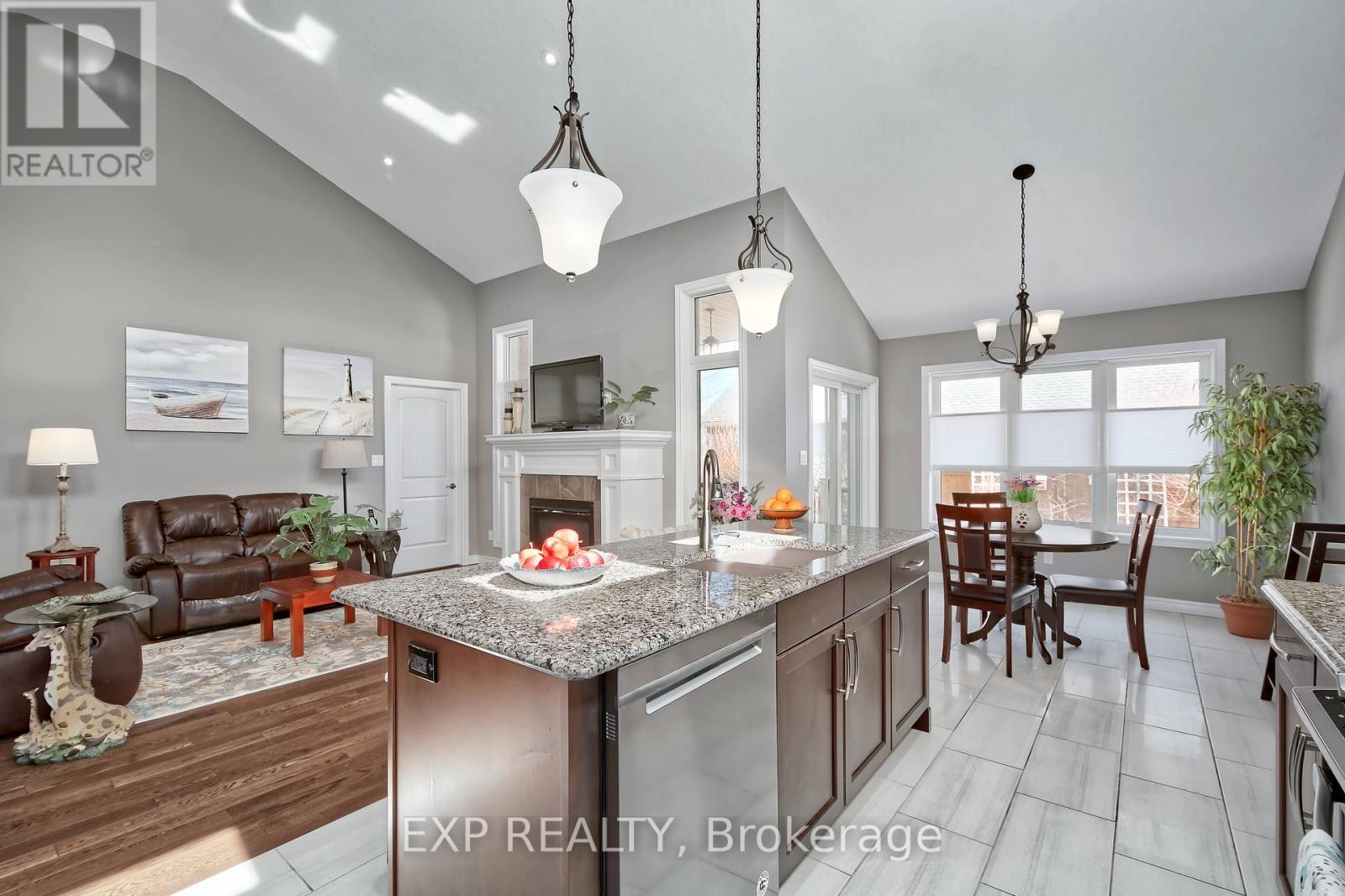 Luxury Bungalow Coastal Living minutes from the Beach! This Stunning Don West Build offers over 2,300 sq ft of beautiful living space with 4 bedrooms, 3 bathrooms, and is situated in one of the area's most desirable neighborhoods, Landings on the Hill. Exceptional curb appeal, lush perennial gardens, and full irrigation system set the tone for a home that has been designed for both comfort and entertaining. The open-concept main floor features soaring 14-foot vaulted ceilings, gleaming hardwood floors, and a striking gas fireplace that anchors the bright and inviting great room. The chef-inspired kitchen is filled with natural light and showcases maple cabinetry, granite countertops, stainless steel appliances, a large island, walk-in pantry, and upgraded soft-close deep drawers and cabinetry. Step outside to your private backyard oasis with a two-tier deck offering both covered and open areas-perfect for relaxing evenings or hosting summer gatherings. The spacious primary suite offers a walk-in closet and a stylish 3-piece ensuite with quartz countertops and built-in cabinetry. A second bedroom, 3-piece bathroom, and convenient main floor laundry complete the main level. The fully finished basement expands your living space with a large recreation area featuring an impressive wet bar-ideal for entertaining. Two additional bedrooms and a full 4-piece bathroom provide plenty of space for guests or extended family. Additional highlights include a heated and insulated double garage, extra-long driveway for guest parking, 200-amp service, and Lifebreath air system. Fully fenced yard landscaped gardens, a gas BBQ hookup, and Wagler Mini Barn. Just minutes from Port Stanley's beautiful beaches, marinas, golf courses, restaurants, theatre, boutique shops and wineries. This exceptional home offers the perfect blend of comfort/immaculate in a wonderful lakeside community. London and the 401 are just 30 minutes and St. Thomas just down the road offers more amenities. (id:64974)