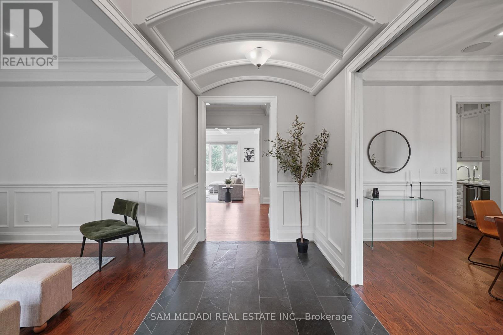 Welcome to this truly spectacular Mineola home. A true masterpiece nestled on a sprawling 90x150 ft lot on the highly desirable Maplewood Rd. An extraordinary commitment to craftsmanship and attention to detail, this residence offers 4,405 sqft of above-grade refined living space. Step through the gorgeous Mahogany entrance door and be immediately captivated by the breathtaking barrel vaulted foyer, adorned with exquisite plaster moulding. The main floor exudes elegance and functionality, featuring a beautiful family room with a stunning built-in gas fireplace, creating a warm and inviting atmosphere. Culinary enthusiasts will be delighted by the breathtaking eat-in kitchen, complemented by an adjacent butler's kitchen, perfect for entertaining. For seamless indoor-outdoor living, a bright, fully enclosed sunroom off the kitchen provides an ideal space for entertainment and leisure.The luxurious main floor primary bedroom suite is a private oasis, boasting a large walk-in closet with organizers and a lavish 5-piece spa-like ensuite, designed for ultimate relaxation. An additional bedroom and dedicated office space on the main floor offer exceptional convenience and versatility. Ascend to the second floor, where you'll find four generously sized bedrooms and two well-appointed bathrooms, providing ample space for family and guests. The finished lower level is an entertainer's paradise, featuring above-grade windows that flood the space with natural light. Enjoy a round of mini-golf, challenge friends to a game of billiards, or gather around the sleek wet bar, this basement is designed for endless fun and recreation, easily walk-up to the private backyard oasis. This must-see property is ideally located close to top-rated schools, lush parks, quick access to major highways, the Go-Train, and the vibrant Village of Port Credit, with its array of renowned restaurants and boutique shopping. Experience the pinnacle of luxury living in Mineola. (id:64974)