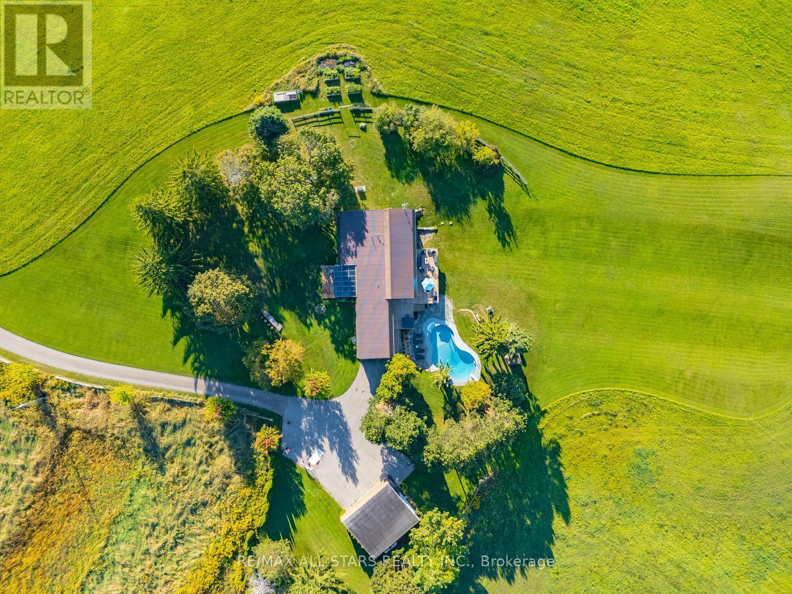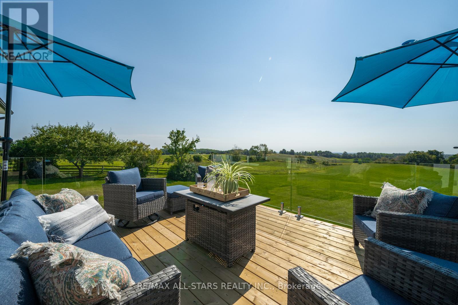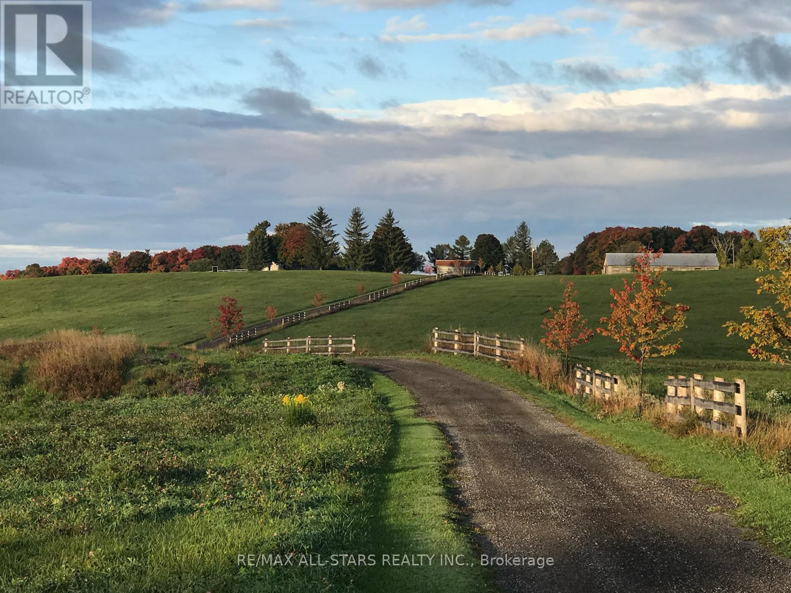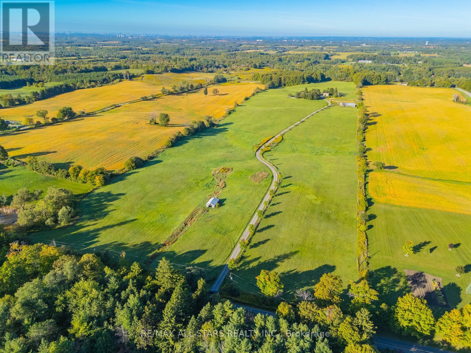 A Truly Exceptional 50-Acre Luxury Estate. Set atop rolling hills with sweeping countryside views, this remarkable estate offers a rare blend of privacy and tranquility-ideally located at the borders of Stouffville, Uxbridge, and Pickering. A long, winding driveway creates an impressive sense of arrival, guiding you through picturesque landscapes to the home. Inside, the light-filled main living area features 12-foot ceilings, exposed beams, and an antique-style brick fireplace. Expansive windows frame breathtaking west-facing views, bringing the outdoors in. The chef-inspired kitchen offers high-end appliances, European-style finishes, and a large island ideal for everyday living and entertaining. An expansive deck with glass railings extends the living space outdoors, showcasing panoramic views of rolling hills and, in the distance, the Toronto skyline. The primary suite is a private retreat with a walk-in closet, built-in wardrobe, 5-piece ensuite, and walkout to the east lawn. Three additional bedrooms and a beautifully updated 5-piece bath provide ample space for family and guests.The walkout lower level includes a spacious recreation area, two home offices, a full bath, and a large bedroom, all with stunning west-facing views. Outdoors, enjoy approx. 6 acres of maple bush, a seasonal pond, and a charming barn with original paddocks and vintage nameplates. An oversized garage accommodates three large trucks with hydro and roughed-in heated floors. Additional features include a heated in ground pool, hot tub, landscaped gardens, geothermal heating, in-floor heating, and extensive updates throughout. A truly special property that must be experienced to be appreciated. You won't want to miss this one! (id:64974)