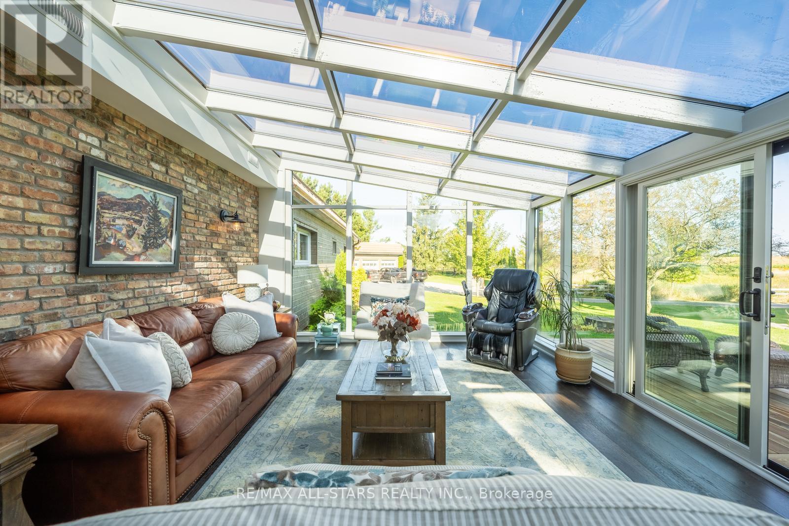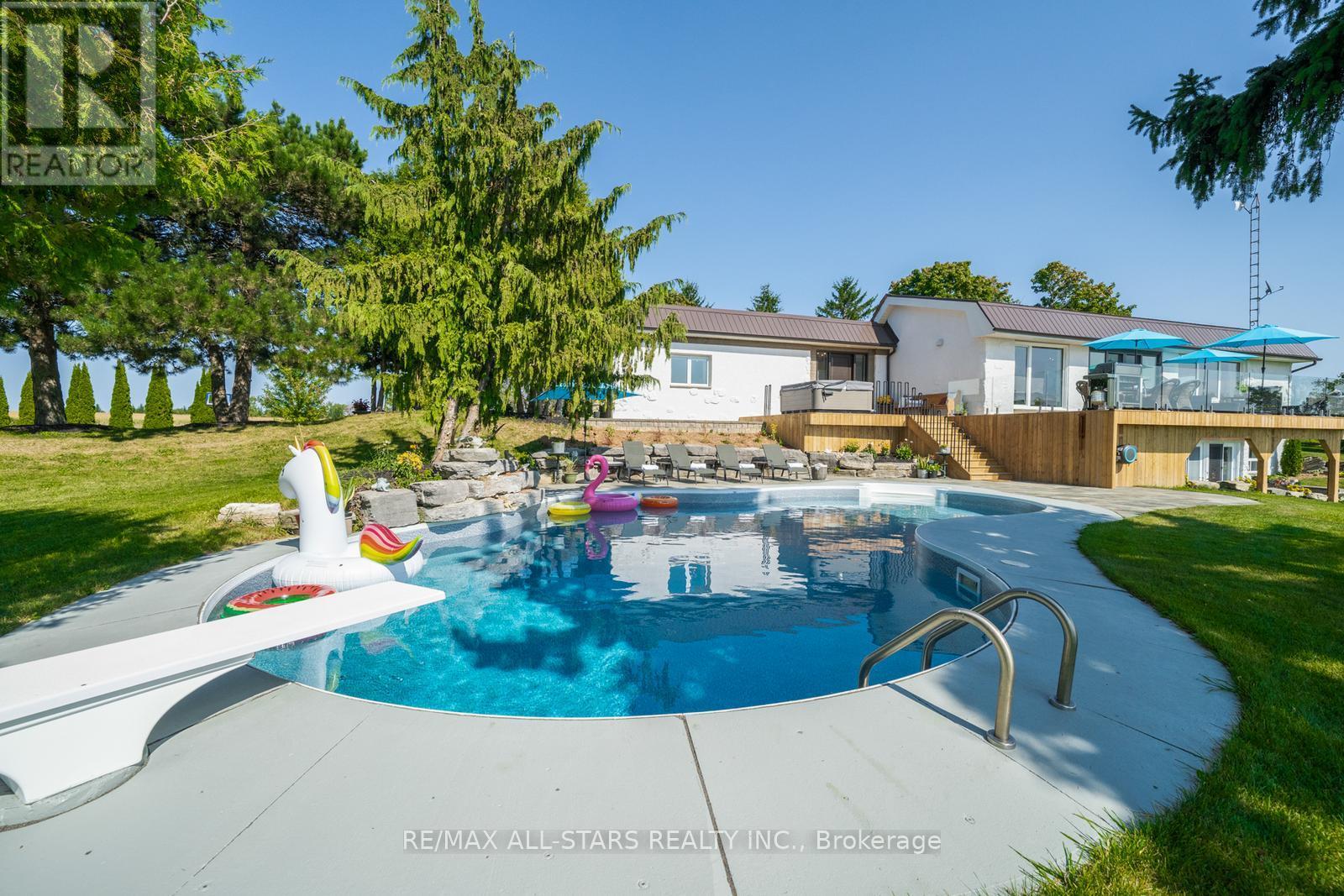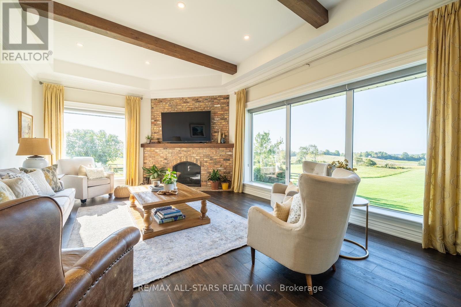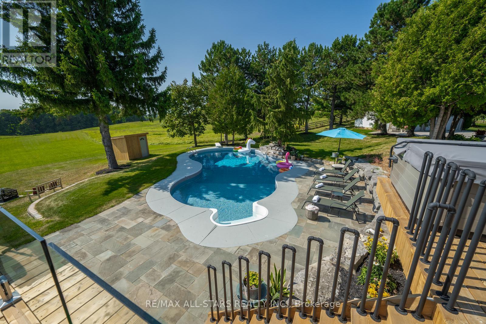 A Truly Exceptional 50-Acre Luxury Estate. Set atop rolling hills with sweeping countryside views, this remarkable estate offers a rare blend of privacy and tranquility-ideally located at the borders of Stouffville, Uxbridge, and Pickering. A long, winding driveway creates an impressive sense of arrival, guiding you through picturesque landscapes to the home. Inside, the light-filled main living area features 12-foot ceilings, exposed beams, and an antique-style brick fireplace. Expansive windows frame breathtaking west-facing views, bringing the outdoors in. The chef-inspired kitchen offers high-end appliances, European-style finishes, and a large island ideal for everyday living and entertaining. An expansive deck with glass railings extends the living space outdoors, showcasing panoramic views of rolling hills and, in the distance, the Toronto skyline. The primary suite is a private retreat with a walk-in closet, built-in wardrobe, 5-piece ensuite, and walkout to the east lawn. Three additional bedrooms and a beautifully updated 5-piece bath provide ample space for family and guests.The walkout lower level includes a spacious recreation area, two home offices, a full bath, and a large bedroom, all with stunning west-facing views. Outdoors, enjoy approx. 6 acres of maple bush, a seasonal pond, and a charming barn with original paddocks and vintage nameplates. An oversized garage accommodates three large trucks with hydro and roughed-in heated floors. Additional features include a heated in ground pool, hot tub, landscaped gardens, geothermal heating, in-floor heating, and extensive updates throughout. A truly special property that must be experienced to be appreciated. You won't want to miss this one! (id:64974)