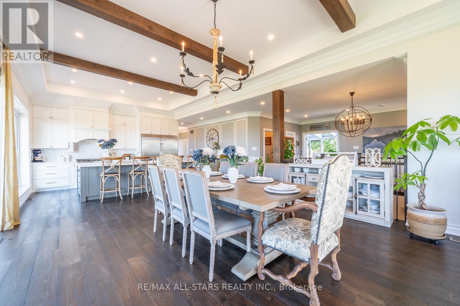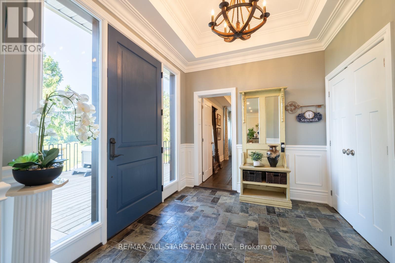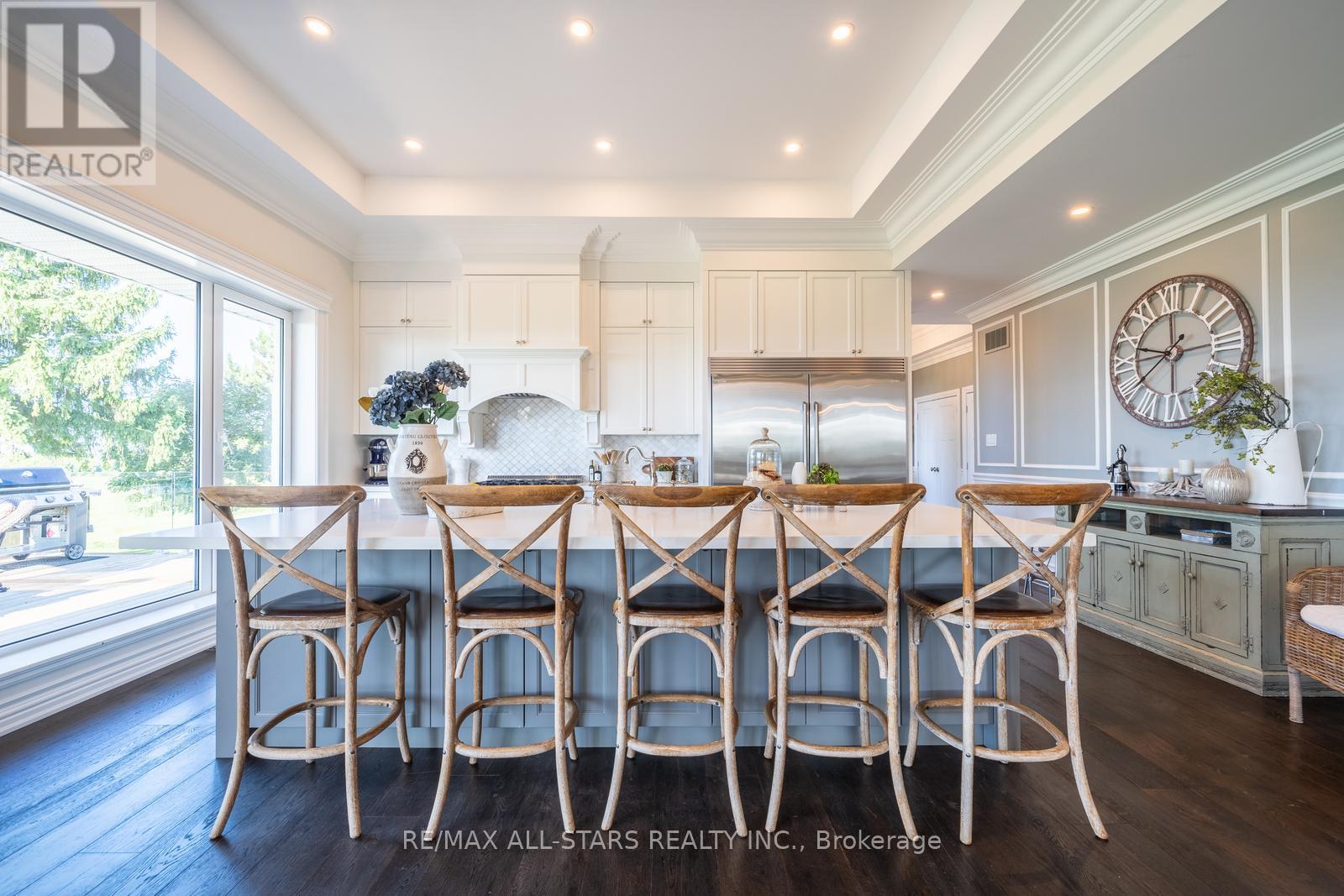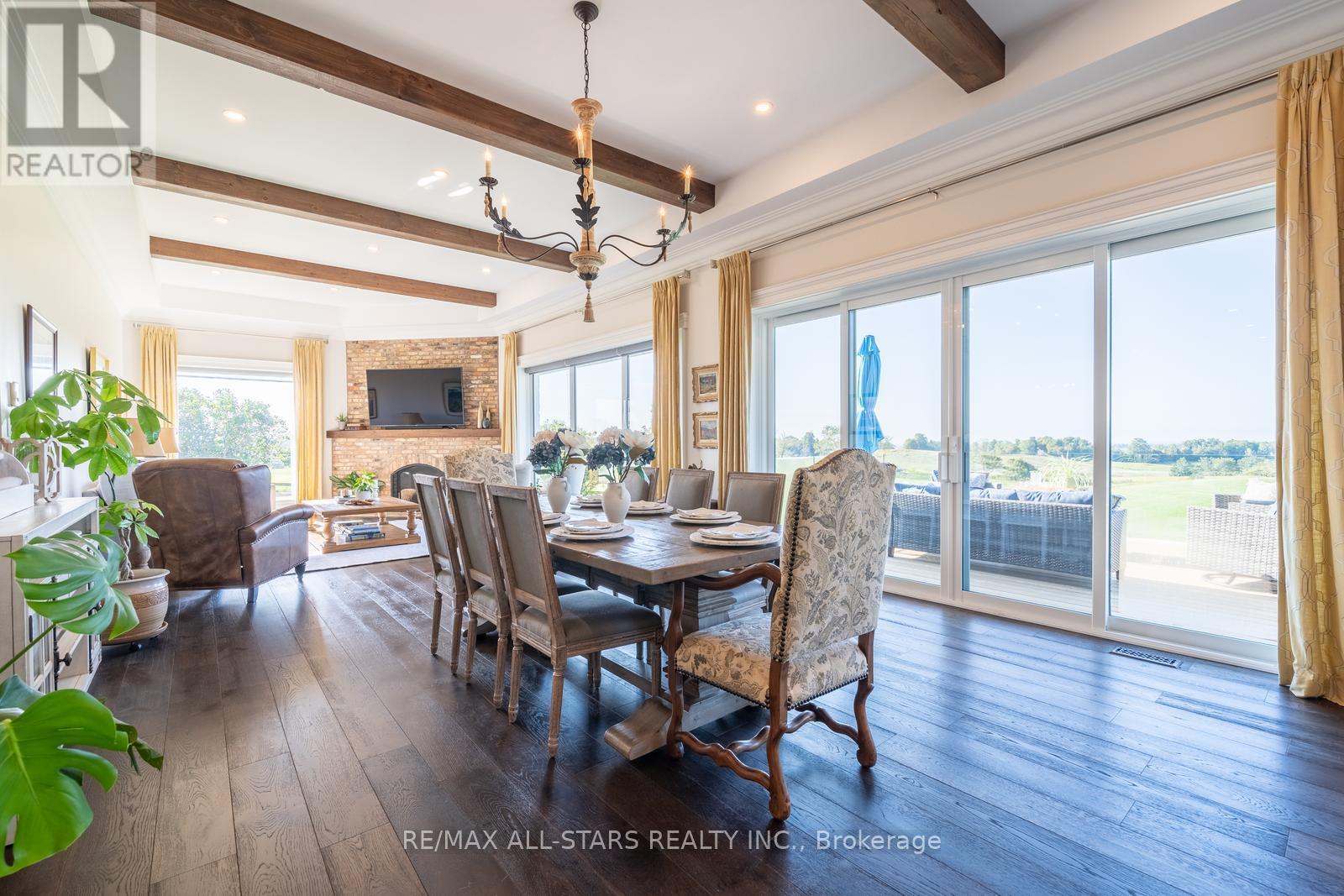A Truly Exceptional 50-Acre Luxury Estate. Set atop rolling hills with sweeping countryside views, this remarkable estate offers a rare blend of privacy and tranquility-ideally located at the borders of Stouffville, Uxbridge, and Pickering. A long, winding driveway creates an impressive sense of arrival, guiding you through picturesque landscapes to the home. Inside, the light-filled main living area features 12-foot ceilings, exposed beams, and an antique-style brick fireplace. Expansive windows frame breathtaking west-facing views, bringing the outdoors in. The chef-inspired kitchen offers high-end appliances, European-style finishes, and a large island ideal for everyday living and entertaining. An expansive deck with glass railings extends the living space outdoors, showcasing panoramic views of rolling hills and, in the distance, the Toronto skyline. The primary suite is a private retreat with a walk-in closet, built-in wardrobe, 5-piece ensuite, and walkout to the east lawn. Three additional bedrooms and a beautifully updated 5-piece bath provide ample space for family and guests.The walkout lower level includes a spacious recreation area, two home offices, a full bath, and a large bedroom, all with stunning west-facing views. Outdoors, enjoy approx. 6 acres of maple bush, a seasonal pond, and a charming barn with original paddocks and vintage nameplates. An oversized garage accommodates three large trucks with hydro and roughed-in heated floors. Additional features include a heated in ground pool, hot tub, landscaped gardens, geothermal heating, in-floor heating, and extensive updates throughout. A truly special property that must be experienced to be appreciated. You won't want to miss this one! (id:64974)