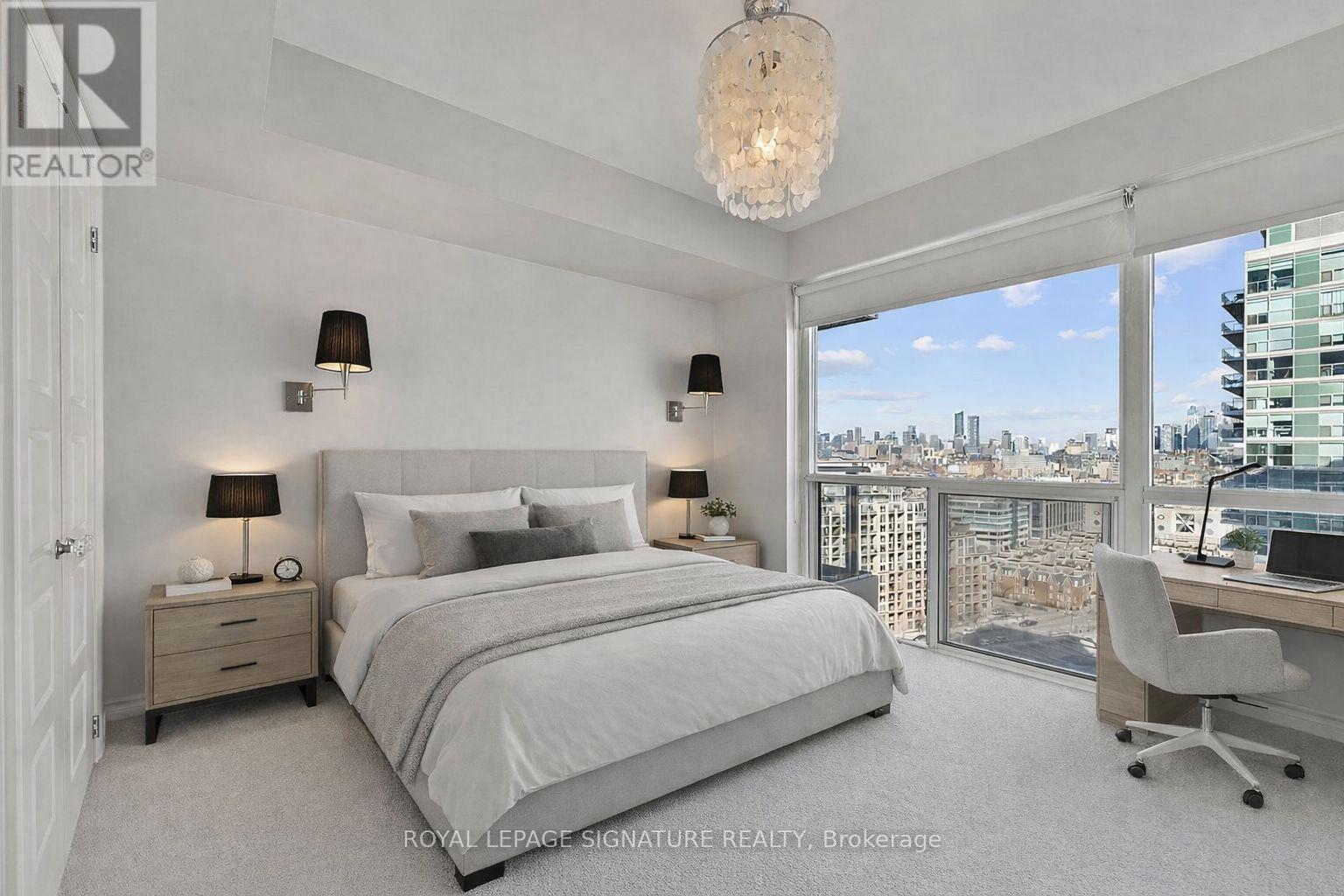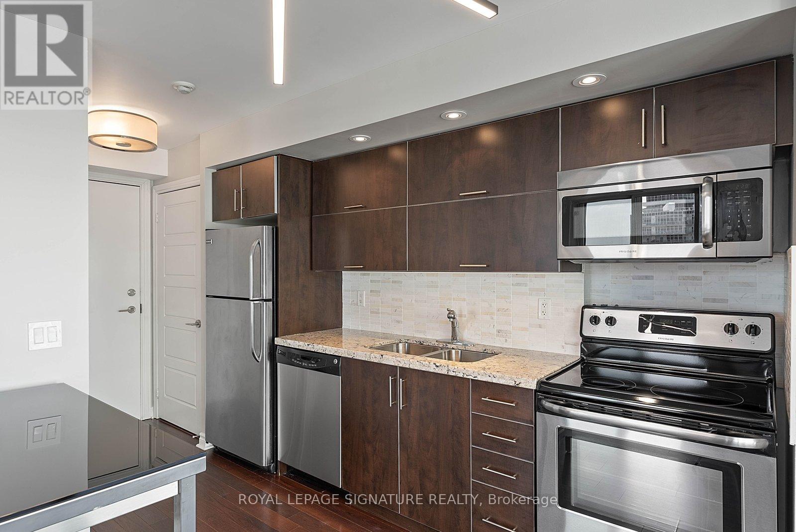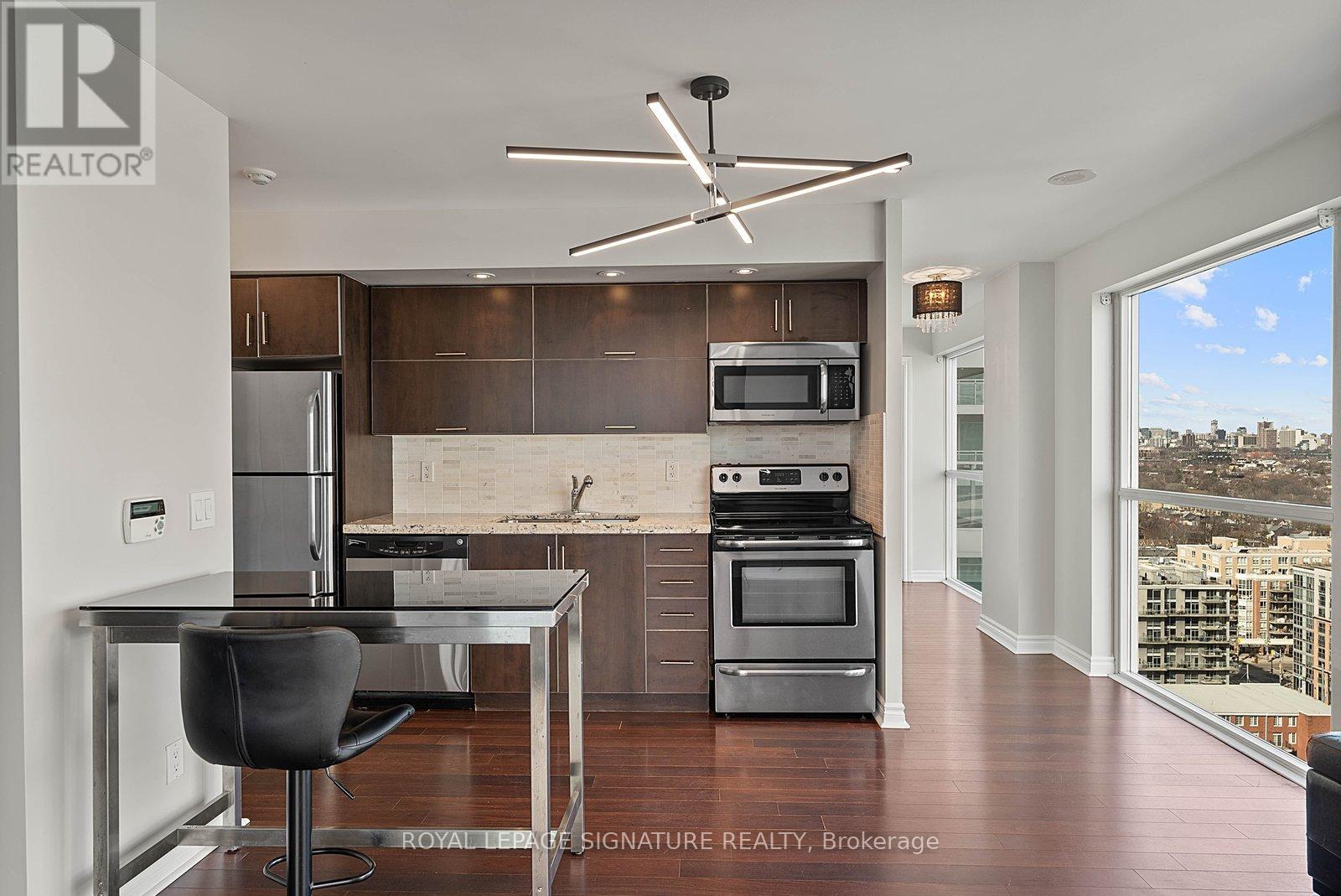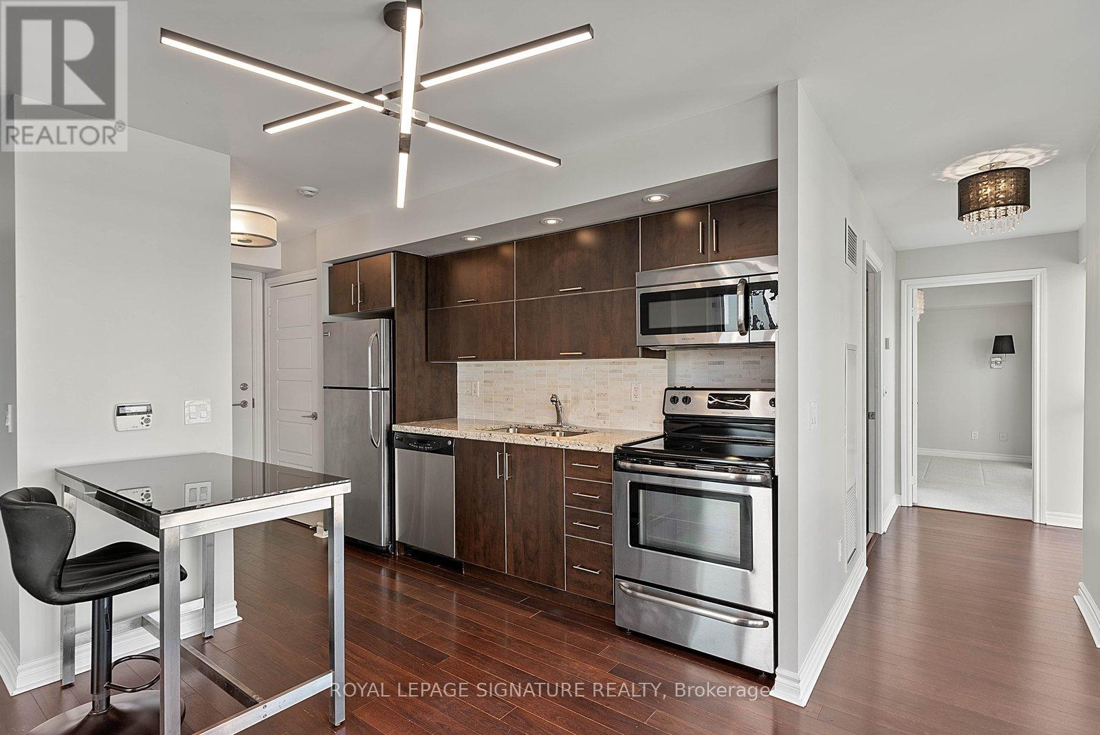 Experience stunning, postcard-worthy views of Lake Ontario and breathtaking sunrises from this thoughtfully designed 1-bedroom + den corner suite - featuring a functional split layout with no wasted space! Freshly painted throughout and professionally deep cleaned, offering a pristine, move-in ready space. Floor-to-ceiling windows line the entire south and east wings of this unit, flooding the space with natural light while framing panoramic lake and city skyline views. The modern eat-in kitchen is equipped with granite countertops, a subway tile backsplash, and full-sized stainless steel appliances. The bright living and dining area easily accommodates a full dining table and entertainment setup, making it ideal for both everyday living and hosting. Walk out to the expansive 111+ sqft balcony that spans the entire south side of the suite, creating a seamless indoor-outdoor living experience. The open-concept den, located just off the main living/dining space, features an IKEA PAX storage system and is perfectly suited for a comfortable work-from-home setup. Privately positioned at the end of the hallway, the spacious primary bedroom, with freshly professionally cleaned carpet, offers floor-to-ceiling windows and a spacious walk-in closet. The 4-piece spa-inspired washroom has a freshly re-caulked 2-in-1 shower/soaker tub with hand-held wand, stylish tile floors, a mirrored medicine cabinet, vanity with under-sink storage and wall-mounted mirror. Sheer roller blinds in the living/dining/kitchen were professionally cleaned. Includes one parking space and a storage locker! World-Class Amenities in 3x Buildings: 3x Gyms, Indoor Pool, Whirlpool Hot Tub & Steam Rooms, Landscaped Outdoor Lounge Area with Bbq's, Sports Lounge with Billiards Table, Party Room, Theatre Room, Meeting Rooms, Guest Suites & Concierge In 50 Lynn Williams. Steps To Pedestrian Bridge! (id:65010)
