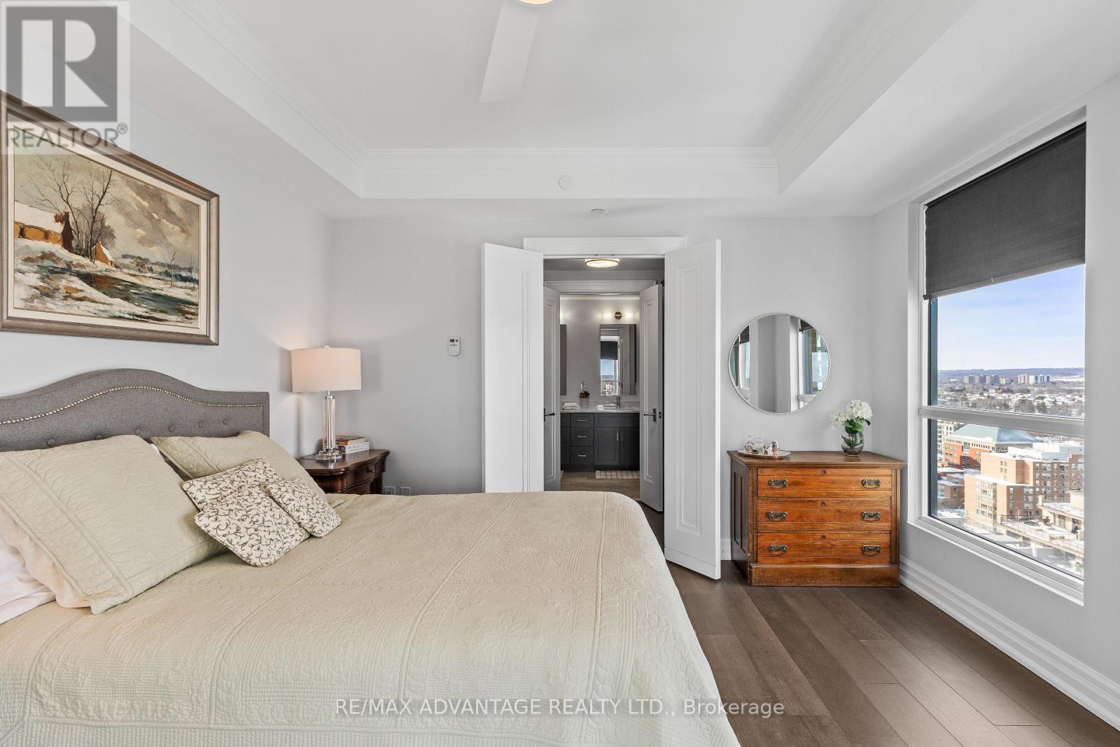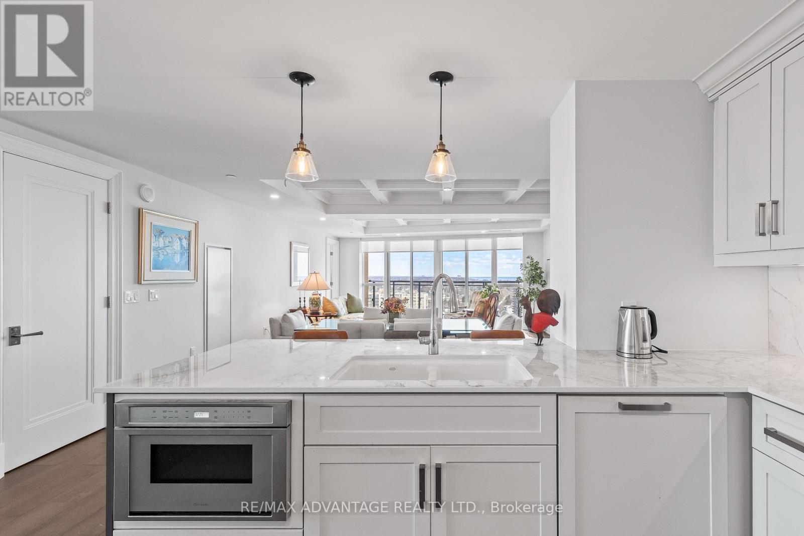 Enjoy luxury living at Bridgewater Private Residences on the lake in downtown Burlington. This 1571 square foot, 2 bedroom plus den corner suite has two private balconies, one with a gas line for a barbecue. The spacious living room and dining room feature a custom coffered ceiling and floor to ceiling windows overlooking sweeping views of Lake Ontario and the Burlington-Toronto skyline. The kitchen is equipped with Thermidor appliances, a large island and upgraded cabinetry, countertops and backsplash. The master bedroom offers a walk-in-closet and a spacious bathroom with heated floors. The comfortable den, the second bedroom and bathroom, a spacious utility cupboard, and in suite laundry facility complete the unit. Also included are 2 parking spaces and a storage locker. Residents enjoy many amenities including a large 8th floor terrace with barbecues, two fitness centres, an indoor pool and spa, bike storage, valet visitor parking, a large party room with billiards and a piano, monthly social events, and direct access to the Pearle Hotel, Isabelle restaurant, and Pearle Café. Bridgewater Private Residences offers downtown living on the lake, combined with convenient access to highways and Burlington GO facilities, the perfect blend of elegance and convenience. (id:64974)