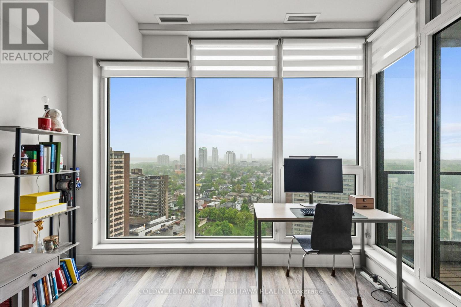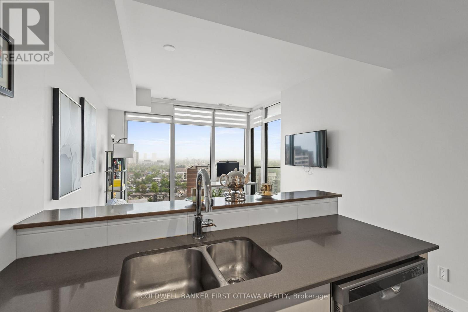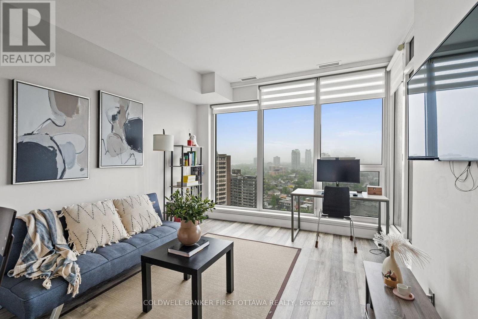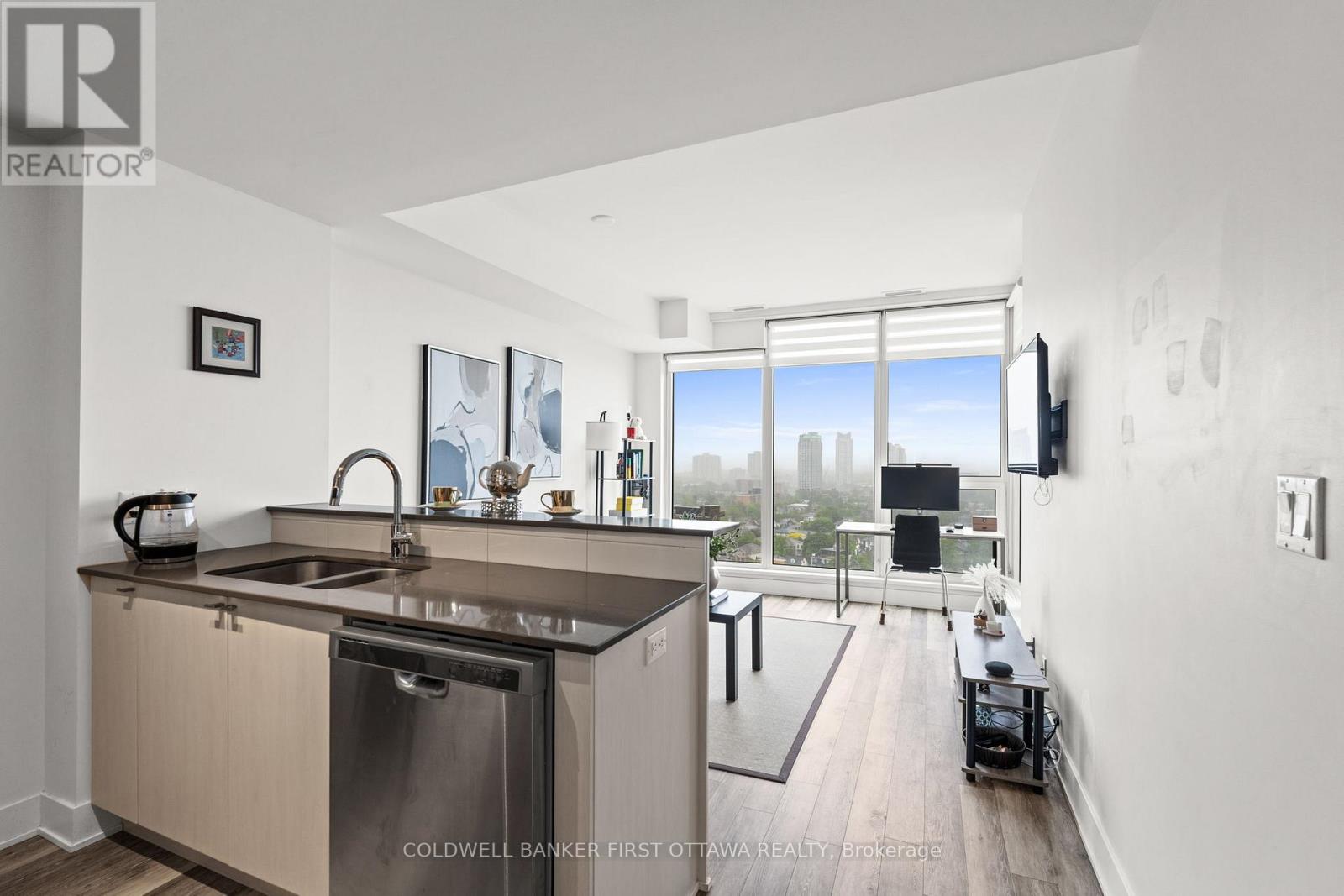Step into this impeccably upgraded one-bedroom residence with views from the 19th foor! Located at the prestigious UpperWest, whereluxurymeets effortless living. Boasting premium finishes, including sleek granite countertops, a stylish kitchen backsplash, refined cabinet hardware, Zen-inspired mirror sliding doors, and elegant window fixtures, this unit is a testament to modern sophistication. Beyond its impeccable interiors, this home offers the rare advantage of both a parking space and a locker, as well as breathtaking panoramic views of the river and city skyline. Expansive oversized windows in the living room and bedroom food the space with natural light, creating an airy, serene ambiance. The generously sized balcony invites you to unwind with your morning coffee or evening libations while soaking in the picturesque surroundings.The UpperWest itself is a masterpiece of meticulous upkeep and exceptional amenities. Residents enjoy access to two elegantparty rooms, a wraparound terrace complete with BBQ facilities, a cozy freplace, a tranquil refection pool, a chic lounge, a dining area, and astate-of-the-art ftnesscenter. Nestled in the heart of Westboro, this prime location places you just steps away from Ottawas fnest boutiqueshops, dining, andeveryday conveniences all within a few charming blocks. A rare blend of elegance, comfort, and convenience, this condo is atrue urban retreat.Turn-key and ready to move in! (id:64974)